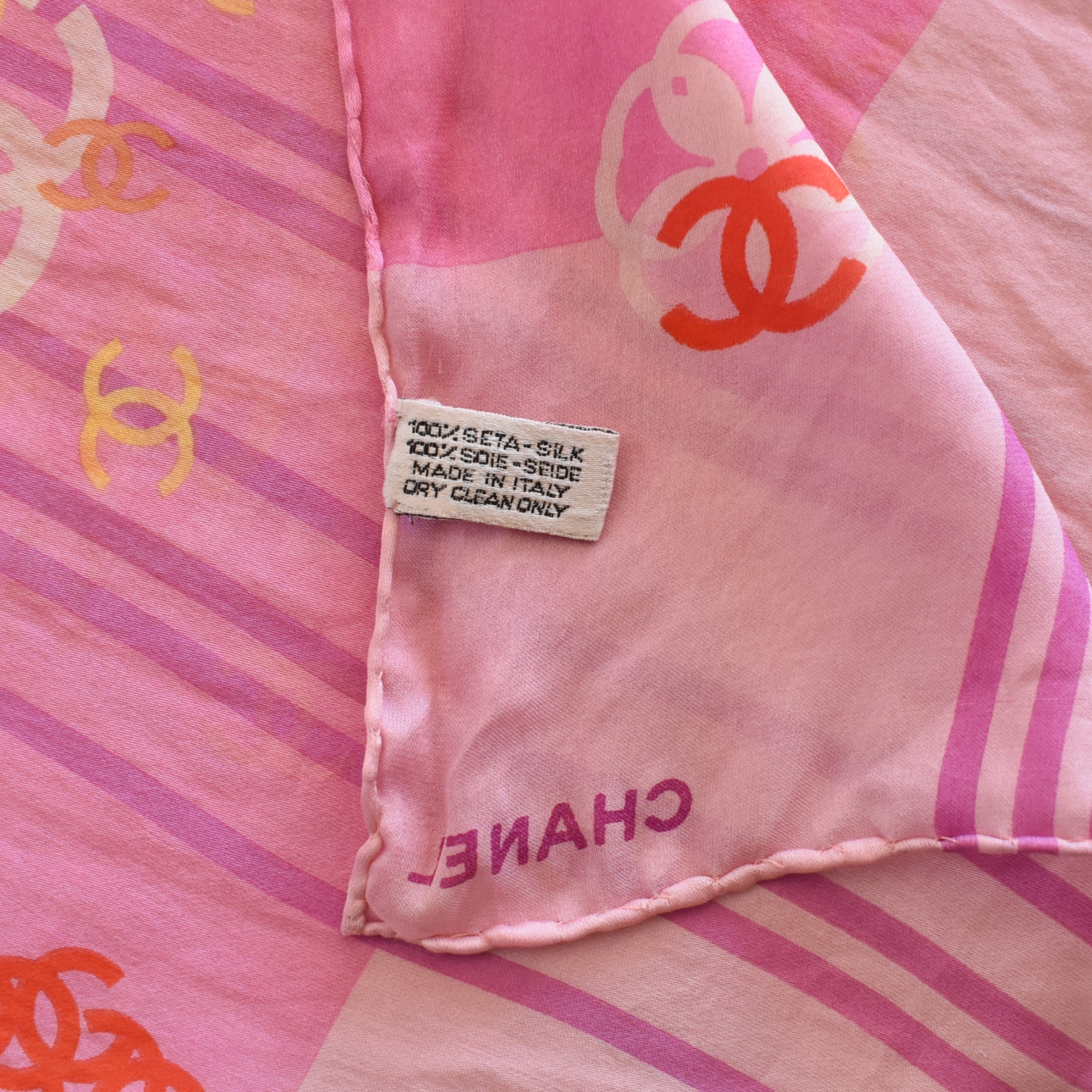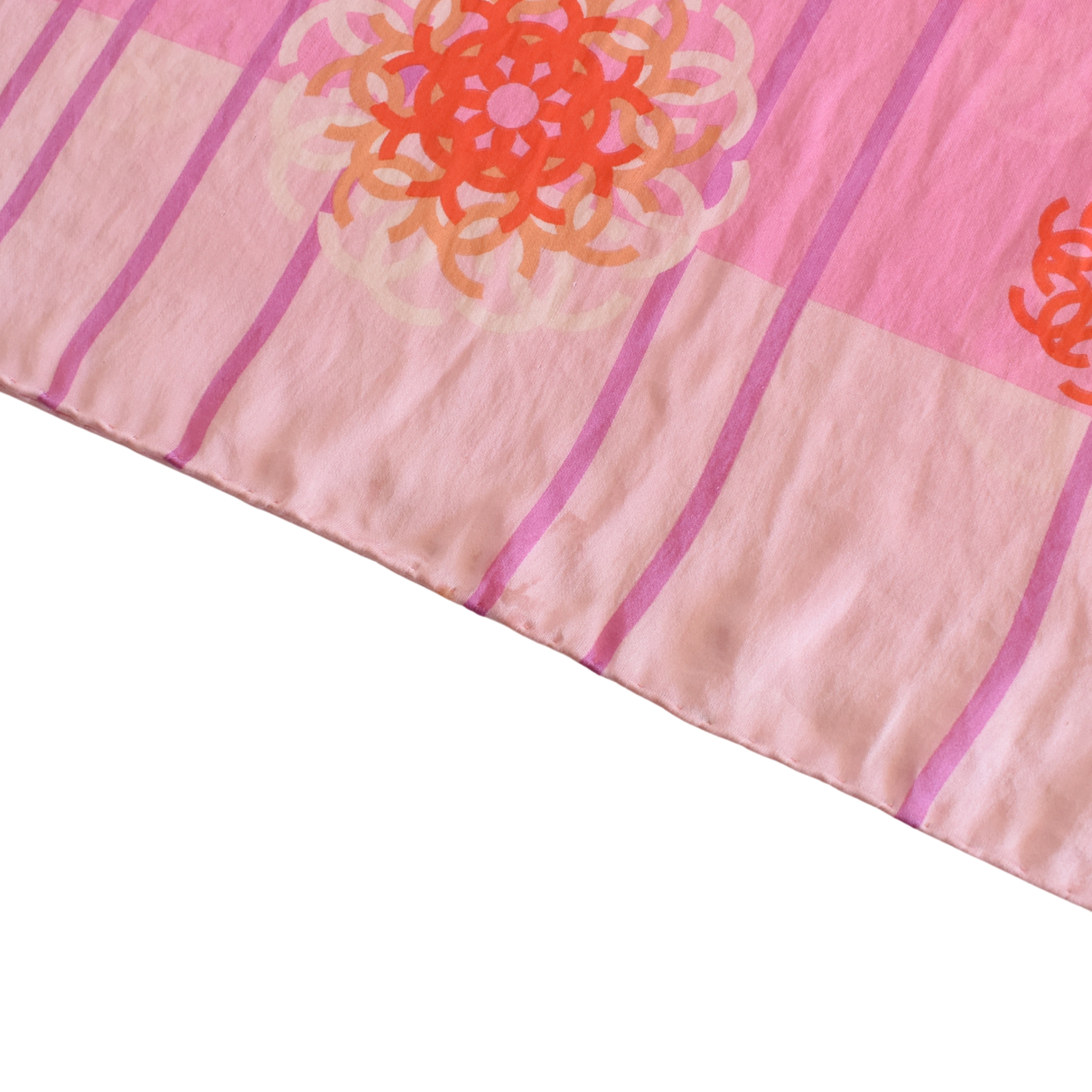 Chanel scarf in pink silk with an orange, yellow and cream stripe, floral, and 'CC' logo pattern throughout.