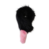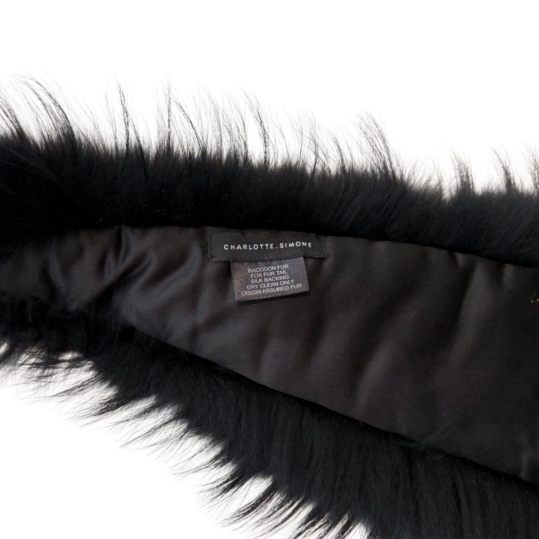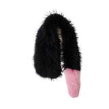 Charlotte Simone scarf in black racoon fur with a bright pink fox fur trim at the end.