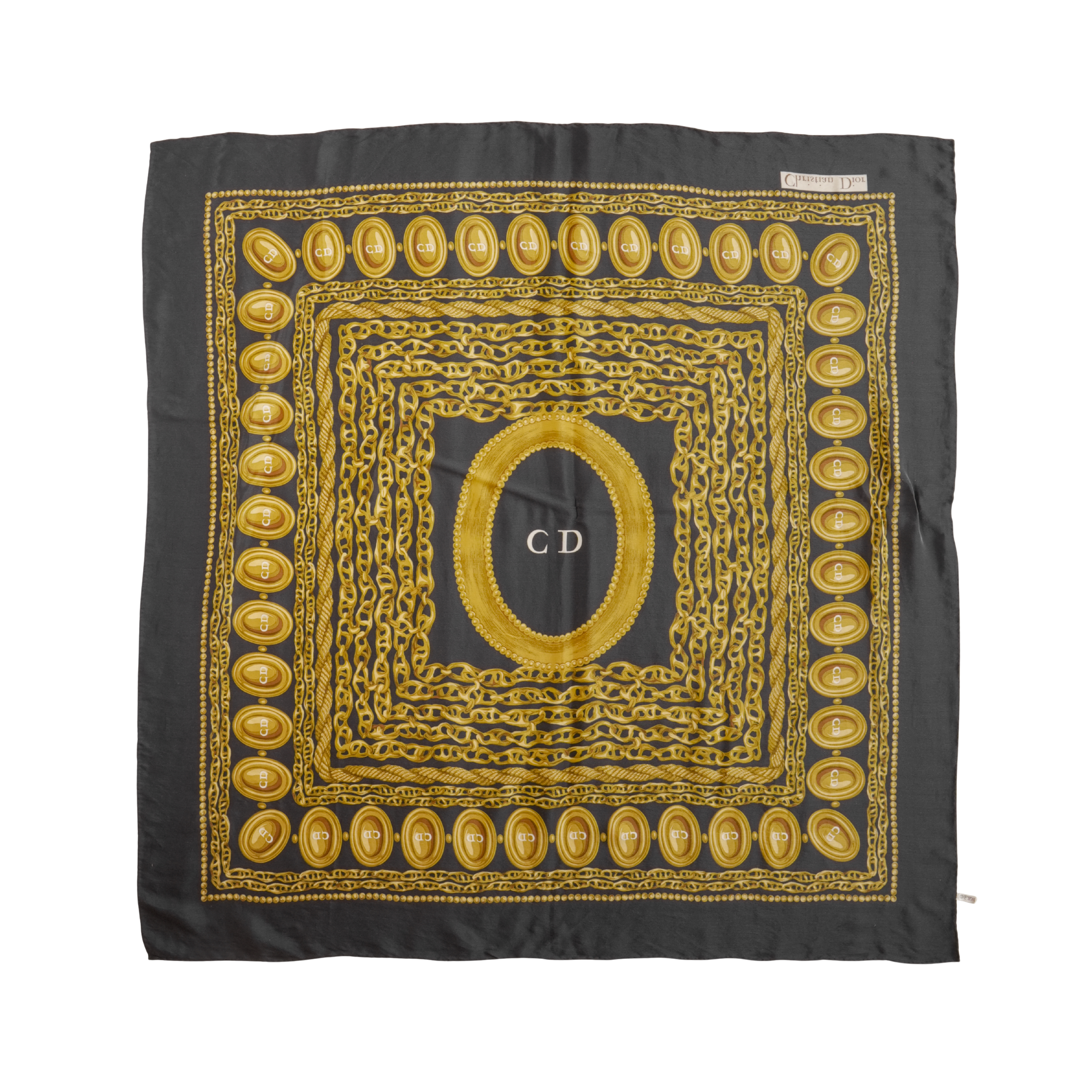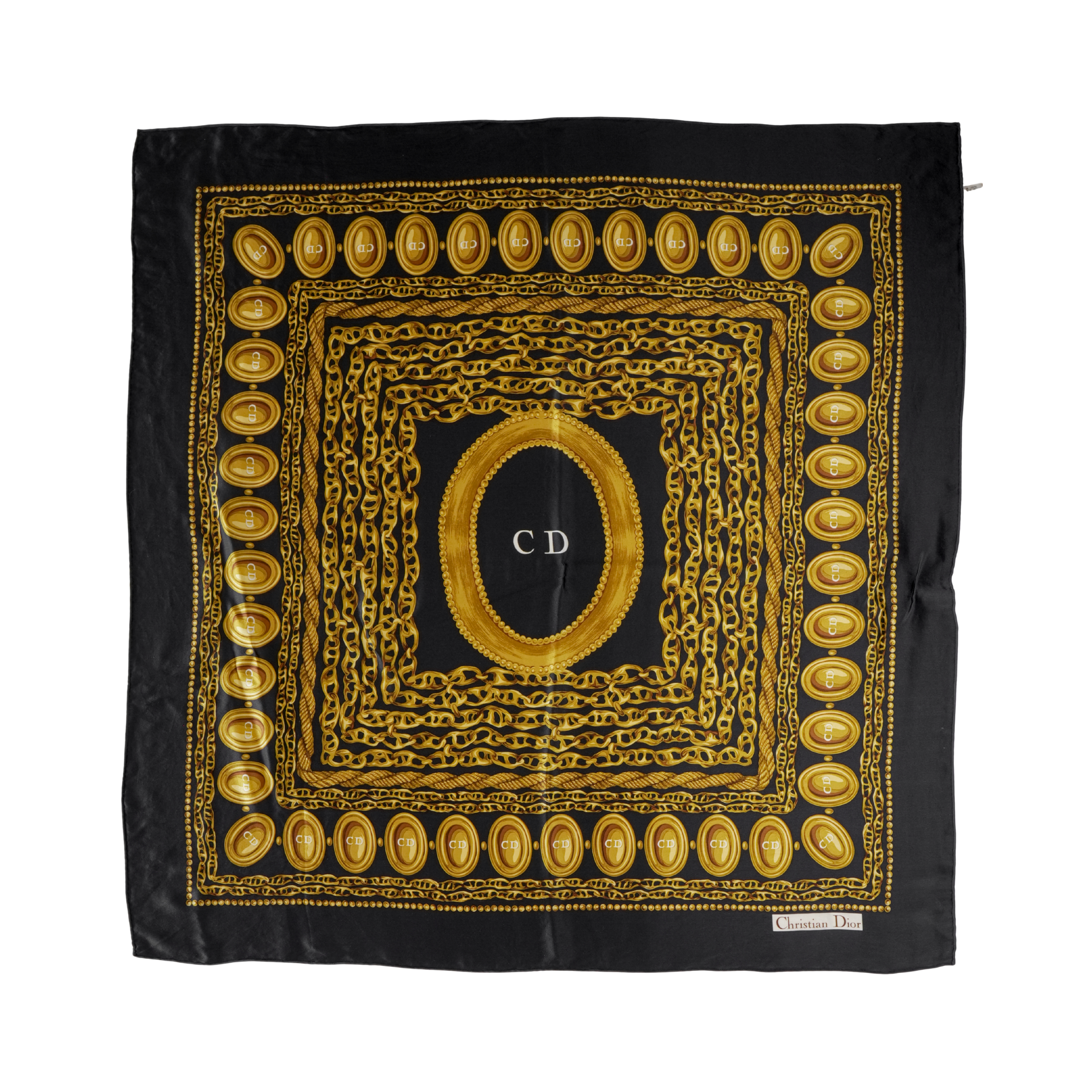 Christian Dior square scarf in black silk with a gold coin and chain link pattern, a white 'CD' logo in the centre, and a rolled hem.