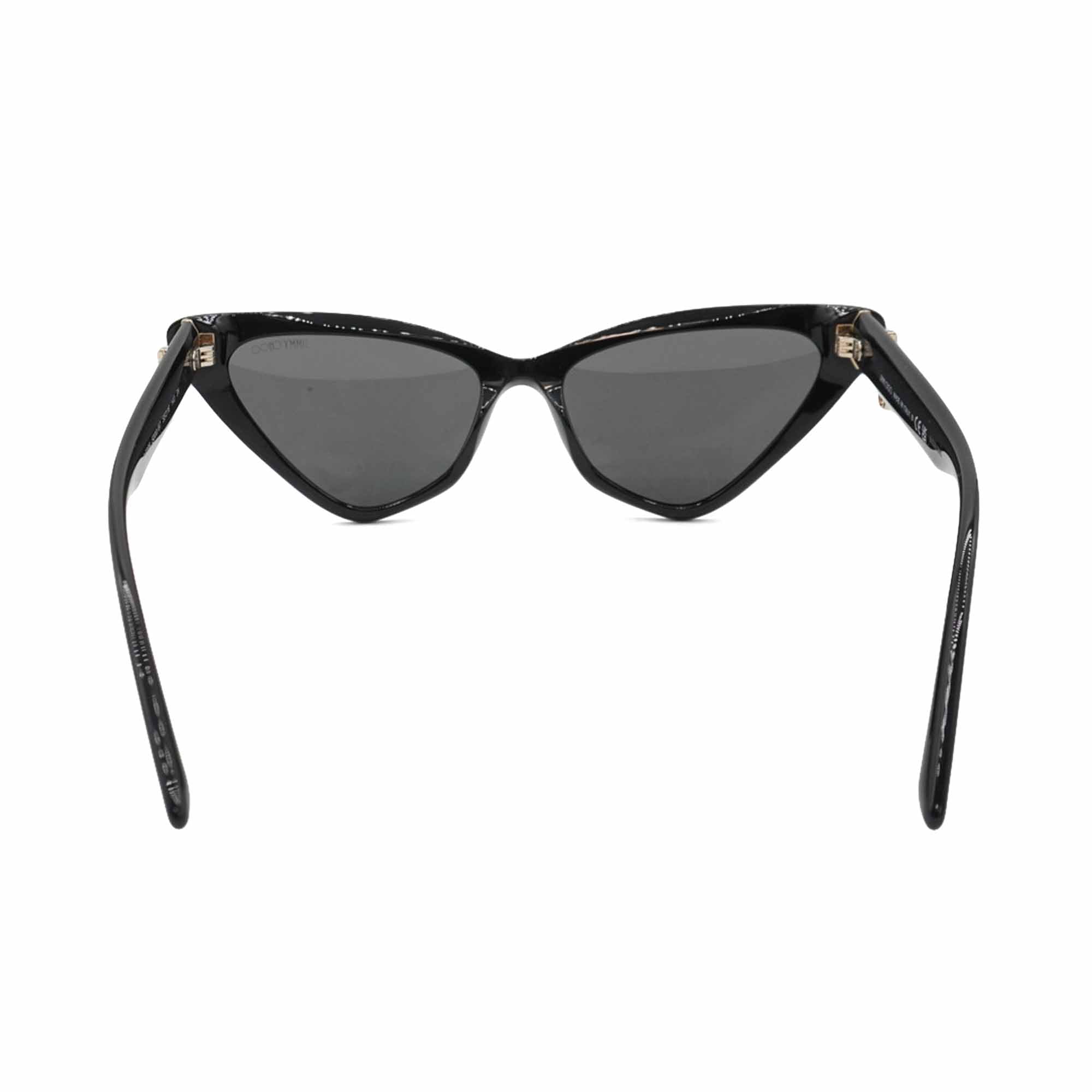 Jimmy Choo cat-eye sunglasses in black acetate with a gold metal 'JC' logo on the arms.