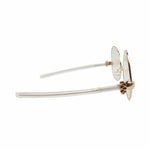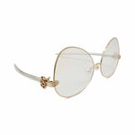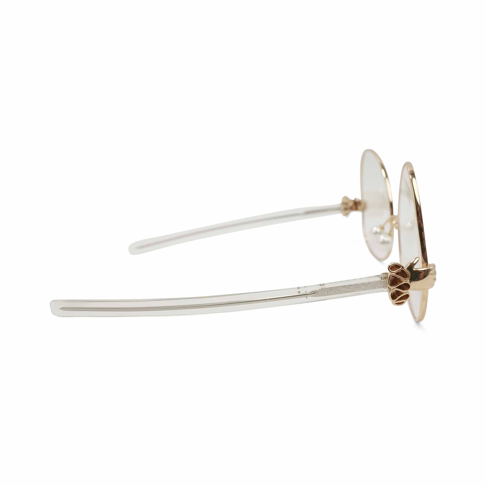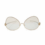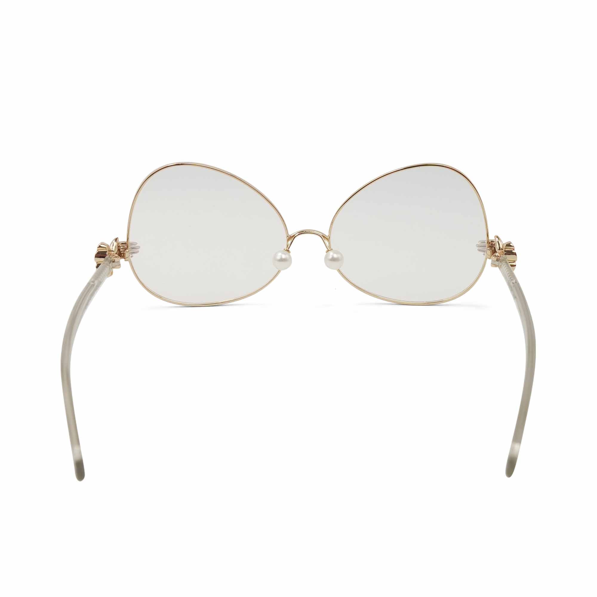 Percy Lau 'Dada Child' eyeglasses in gold metal with large tilted lenses, pearl detail on the nose bridge, clear acetate arms, and a jester hand detail at the brows.