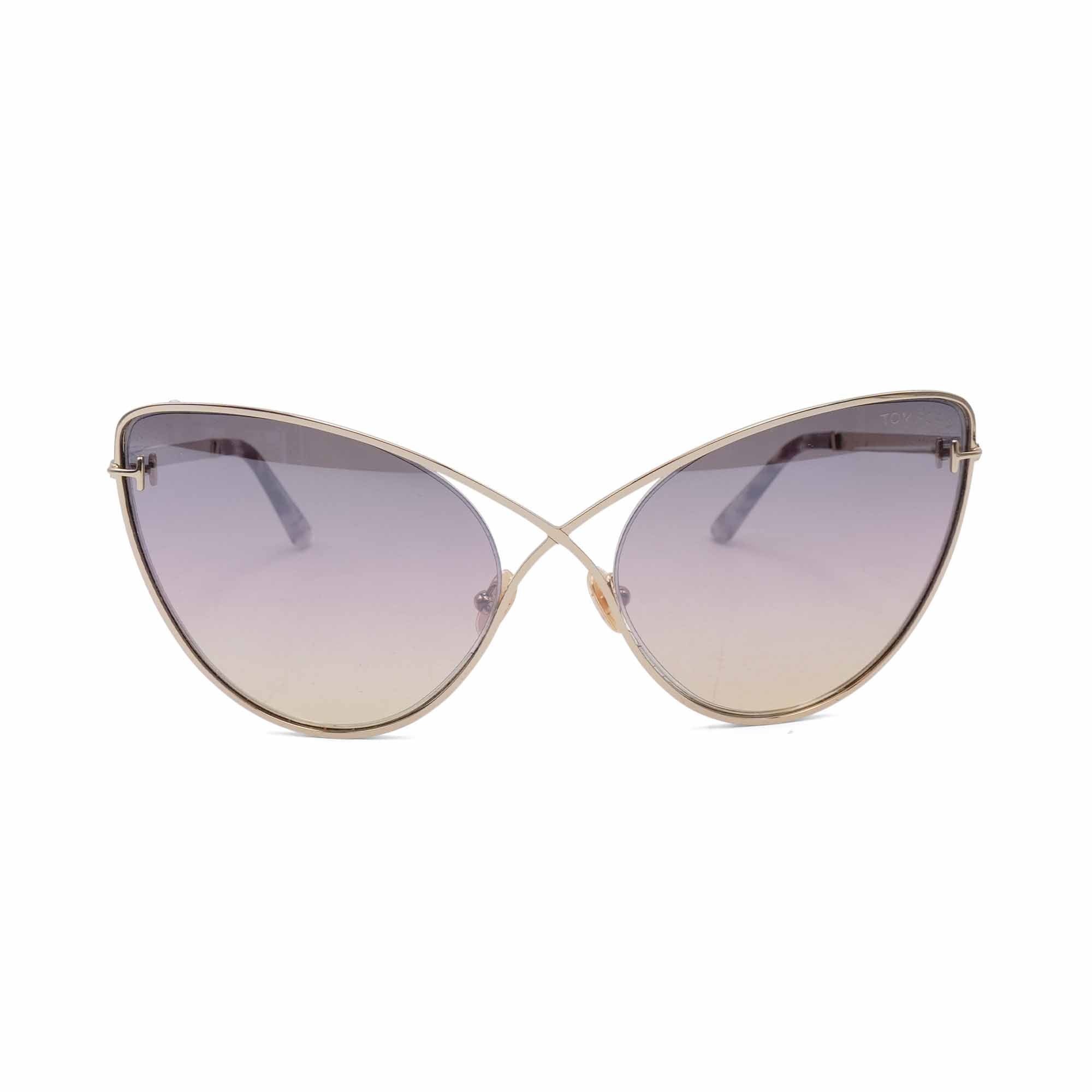 Tom Ford 'Leila' sunglasses with large purple butterfly lenses, gold metal frames, and a purple tortoise acetate trim on the arms.