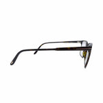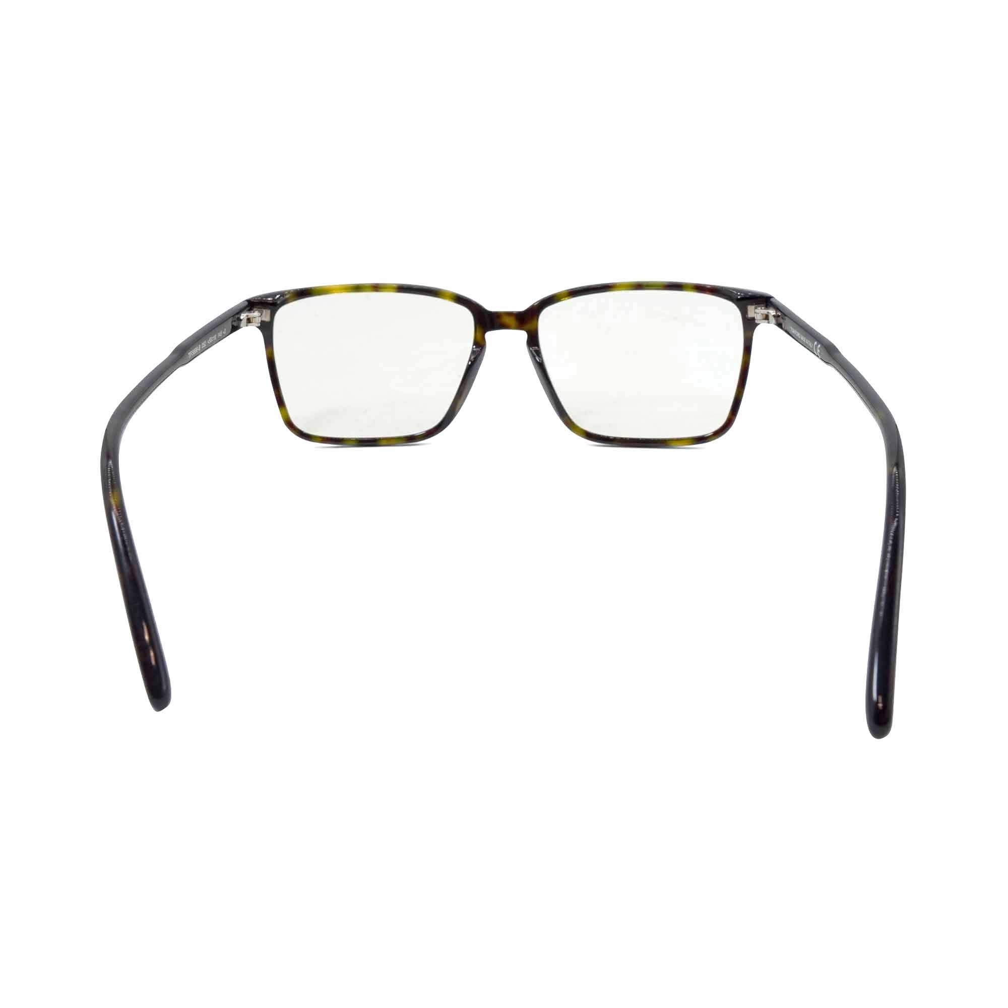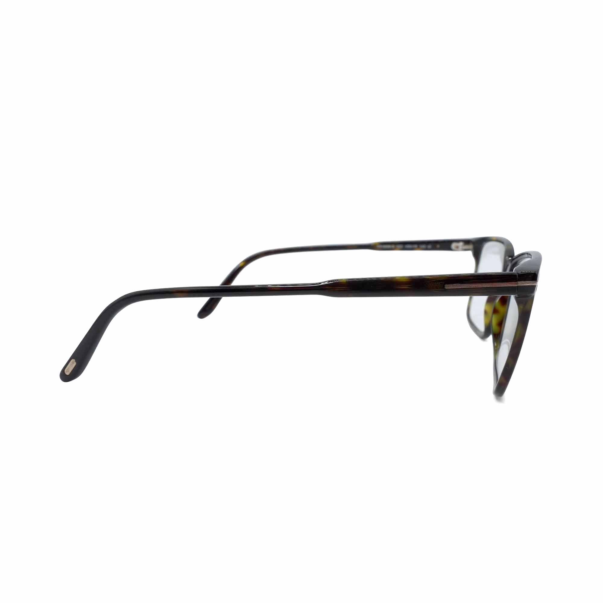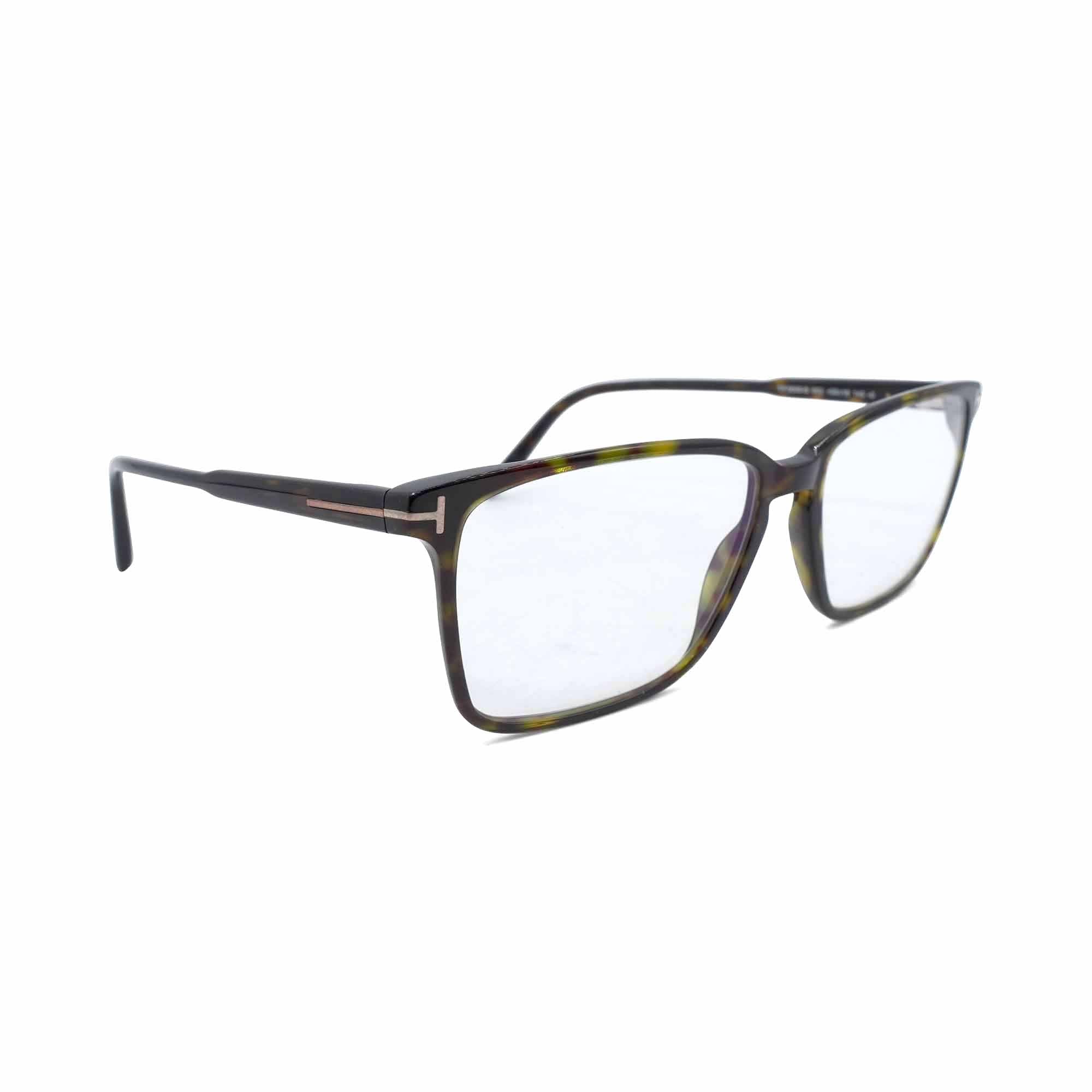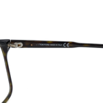 Tom Ford wayfarer eyeglasses in brown tortoise acetate with blue light lenses and a signature metal 'T' on the temples.