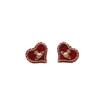 Vivienne Westwood 'Petra' heart stud earrings in rose gold toned metal with a red mother of pearl inlay and a rhinestone trim.