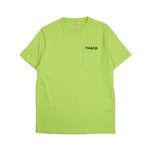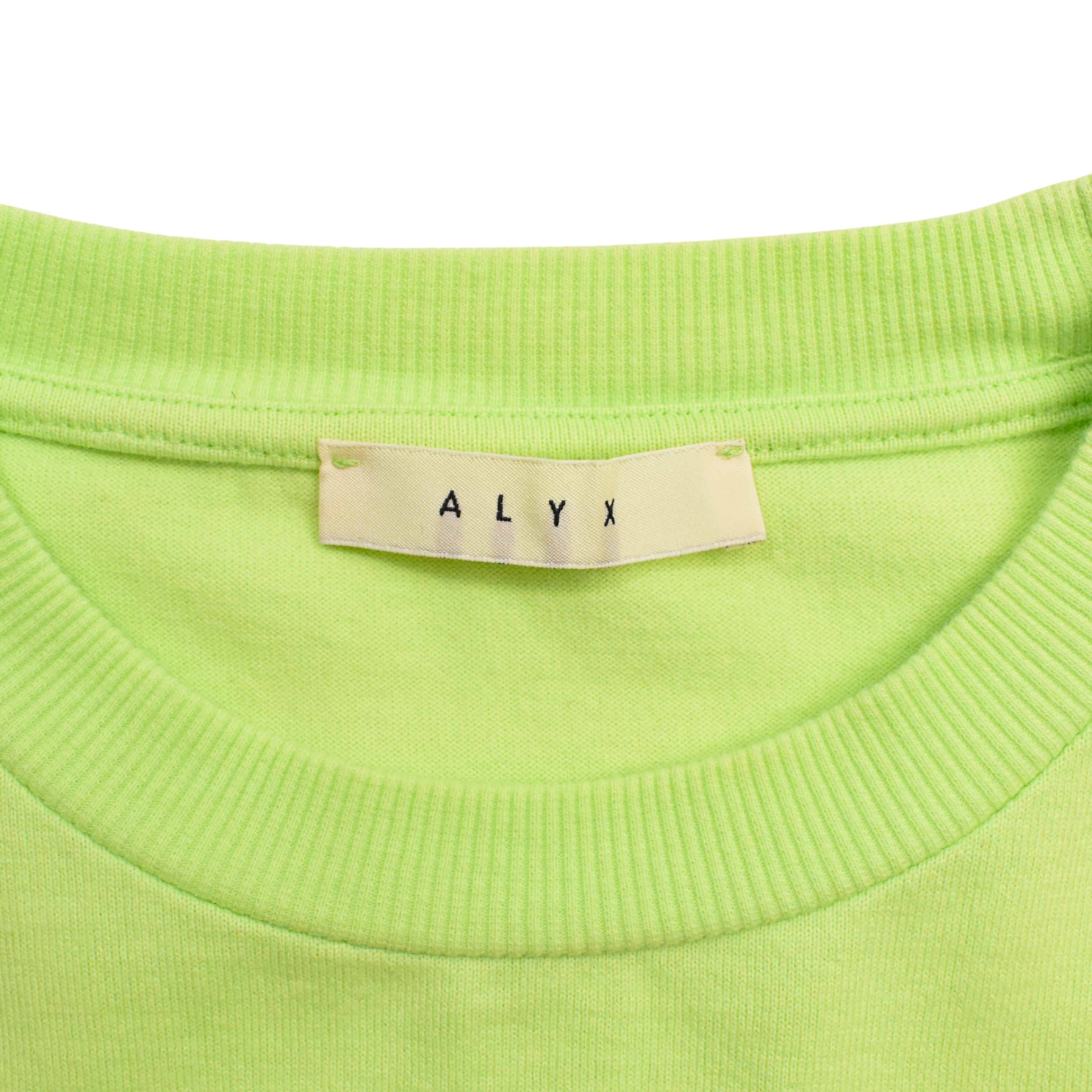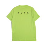 Alyx 'Chaos' t-shirt in neon green cotton with breast patch pocket with black lettering above and black logo on the back with ribbed collar.