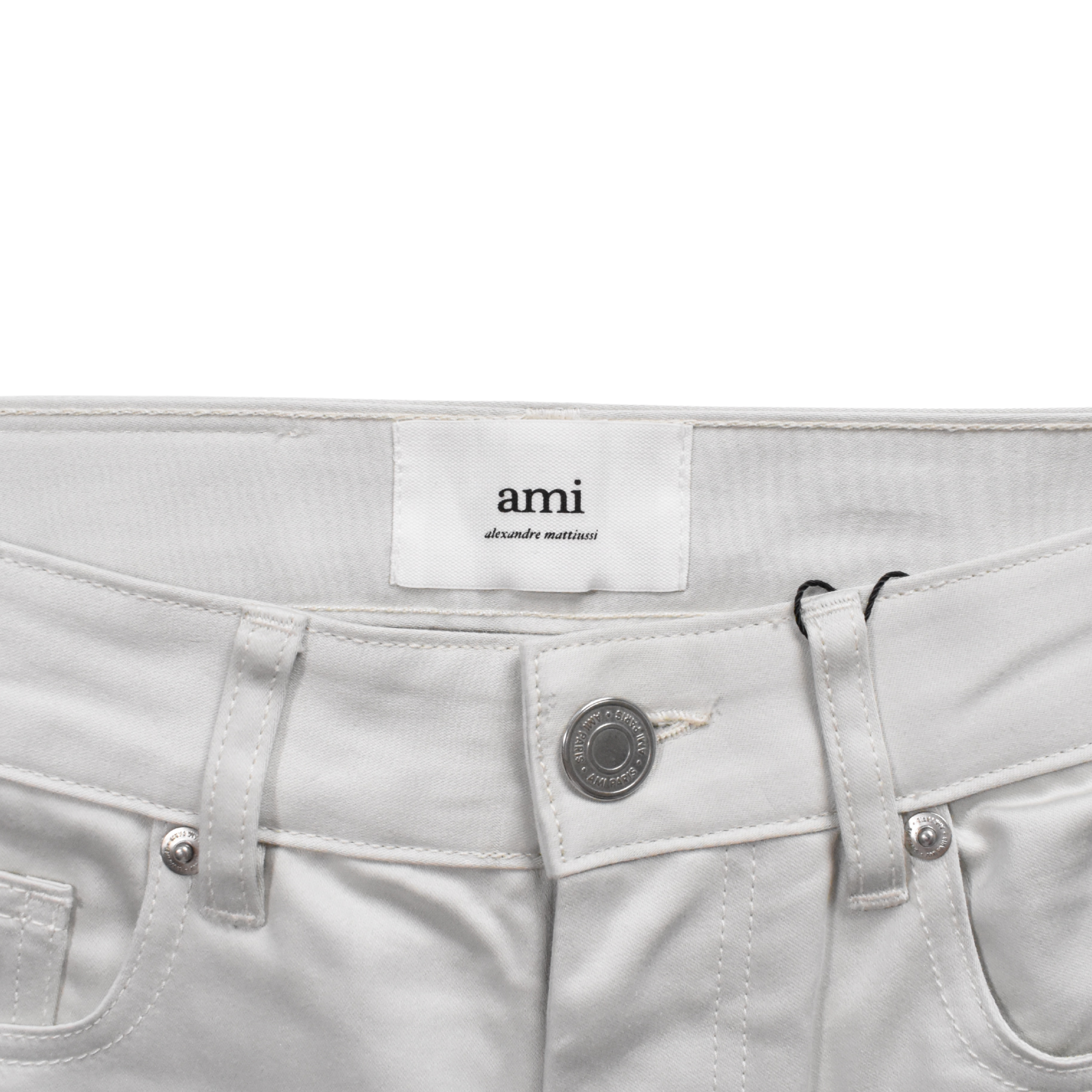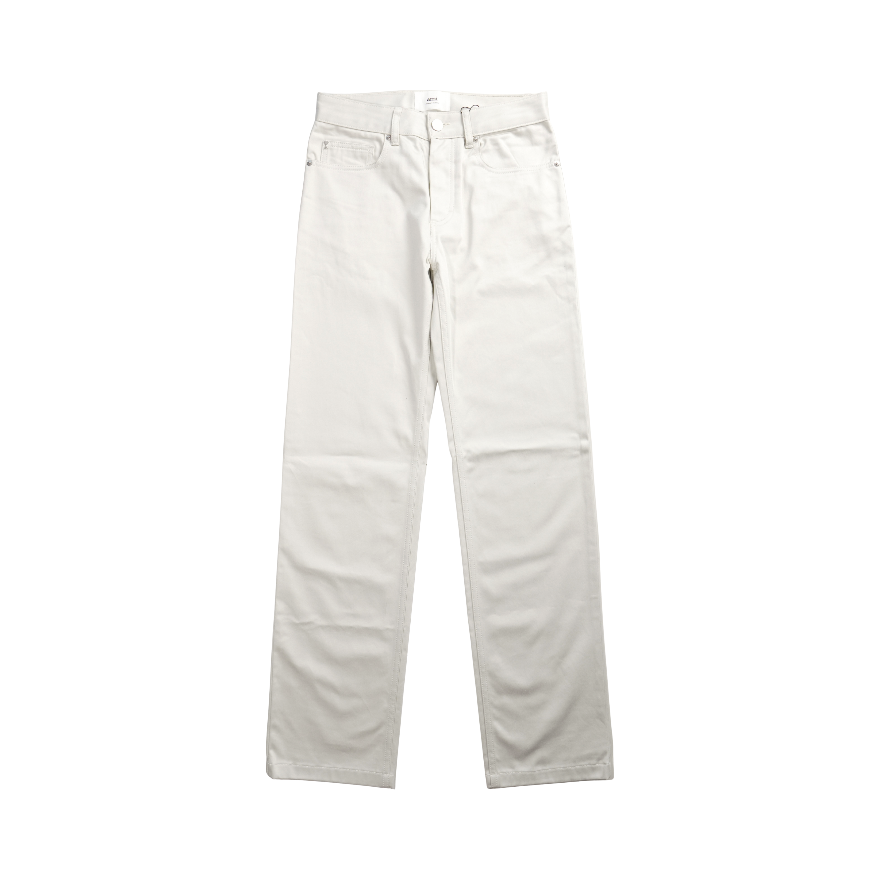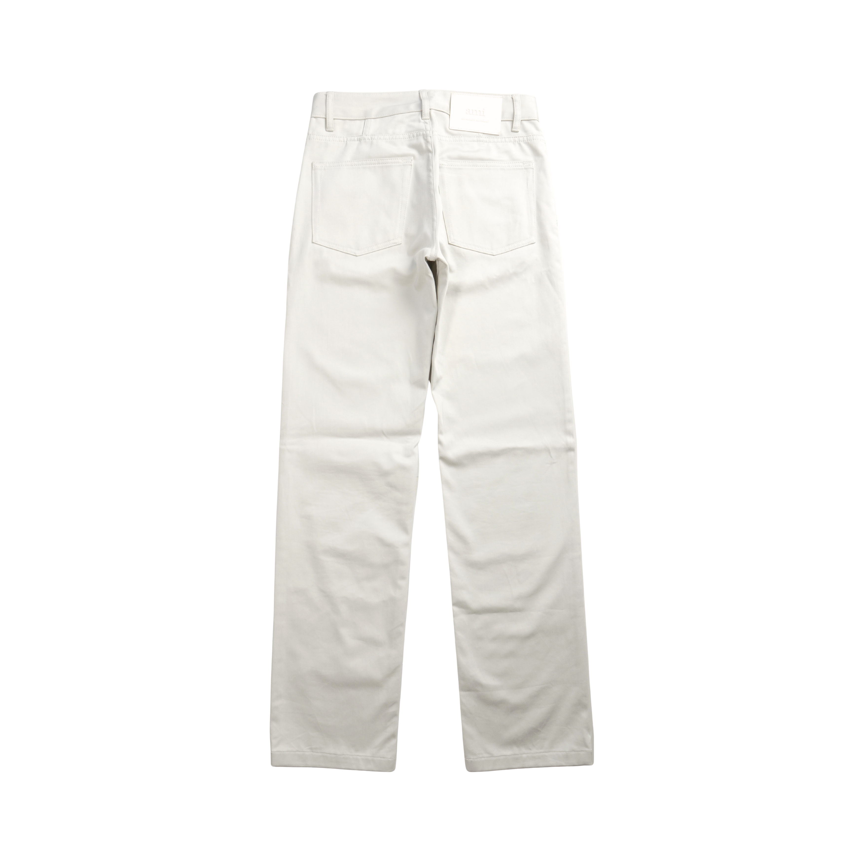 Ami Paris straight fit trousers in off white cotton with a cream leather logo patch on the back of the waistband.