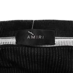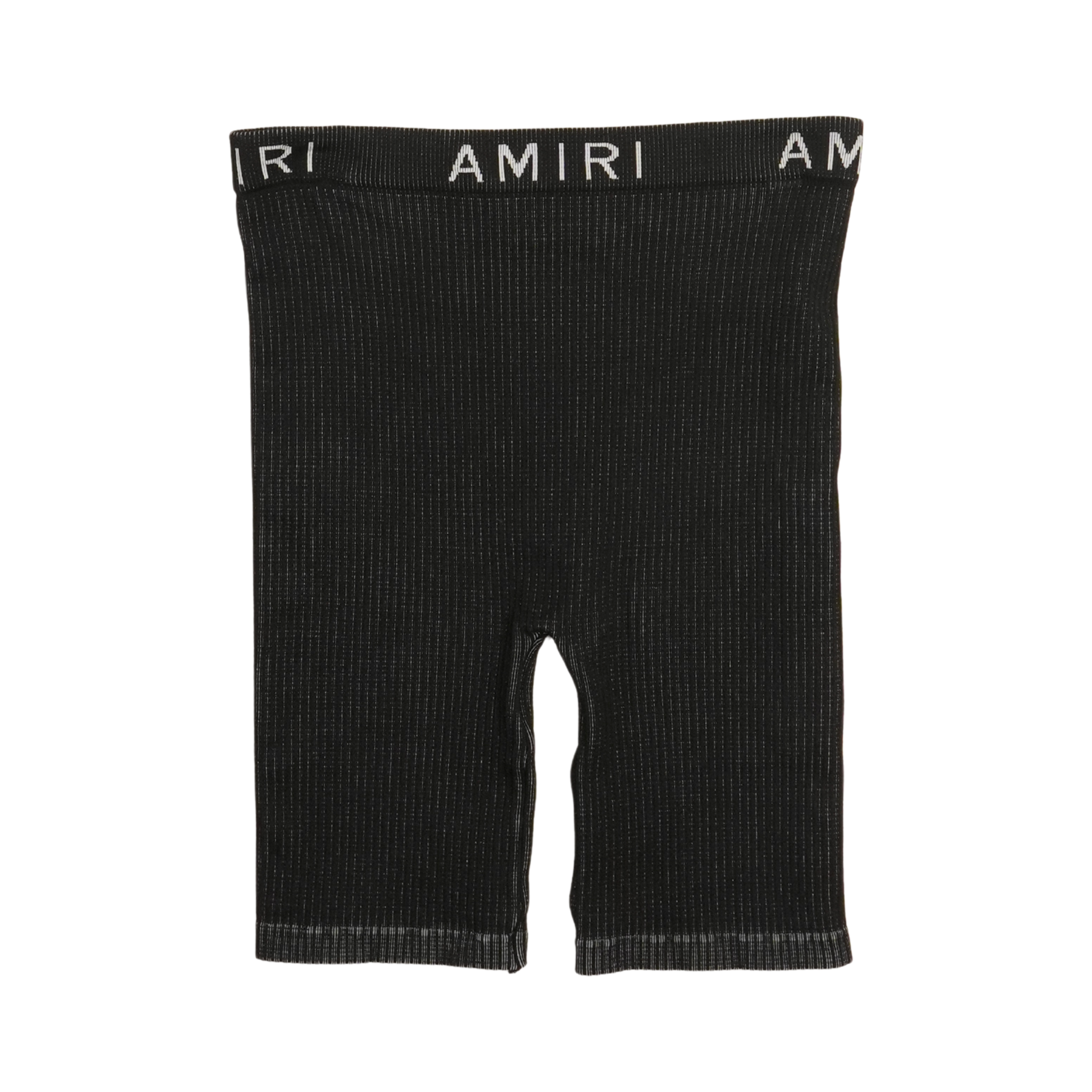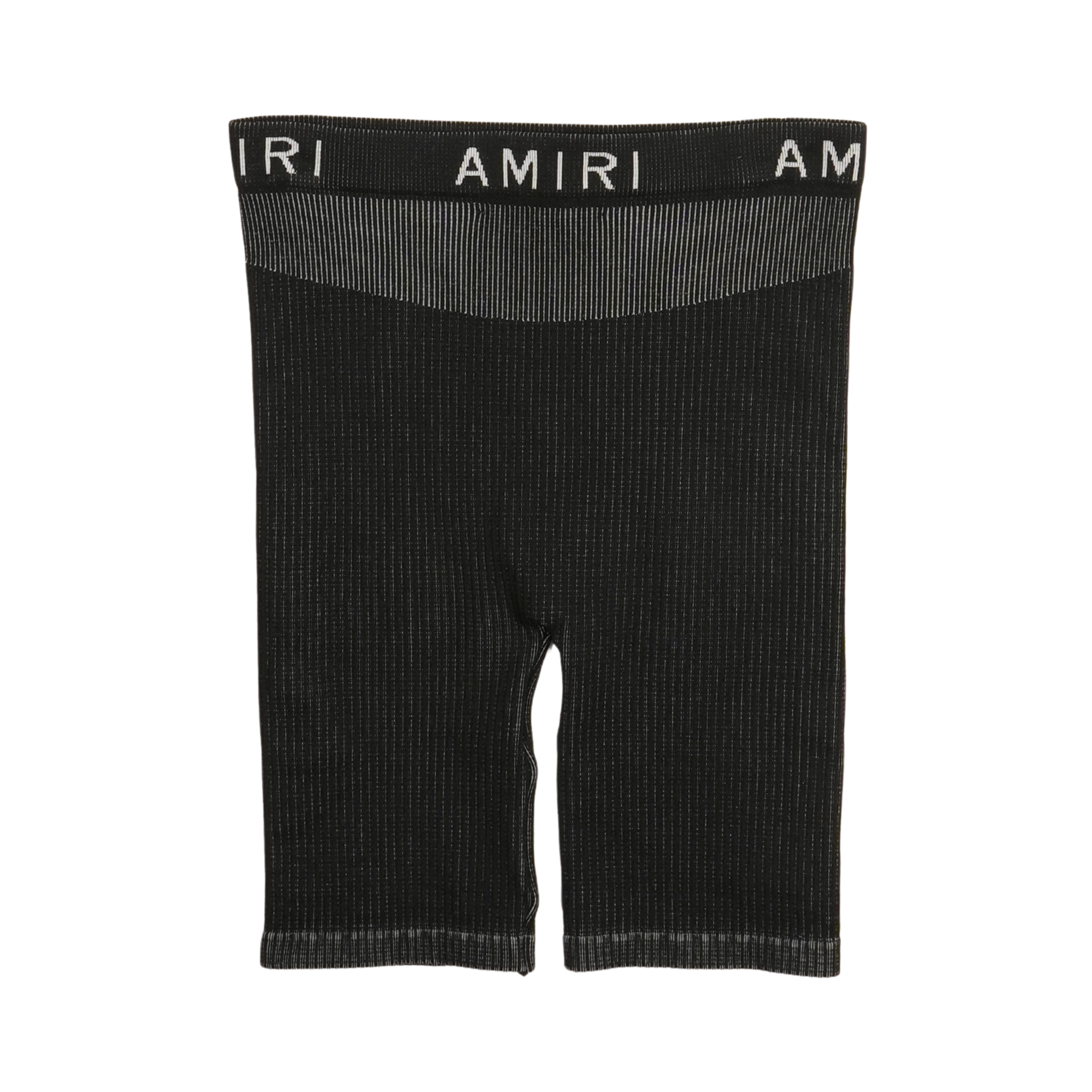 Amiri high waisted, ribbed biker shorts with logo waistband in black with white interior that shows when stretched.