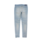 Amiri 'Thrasher' slim fit jeans in medium washed distressed denim with white and black paisley underlay, five pocket styling and button fly.