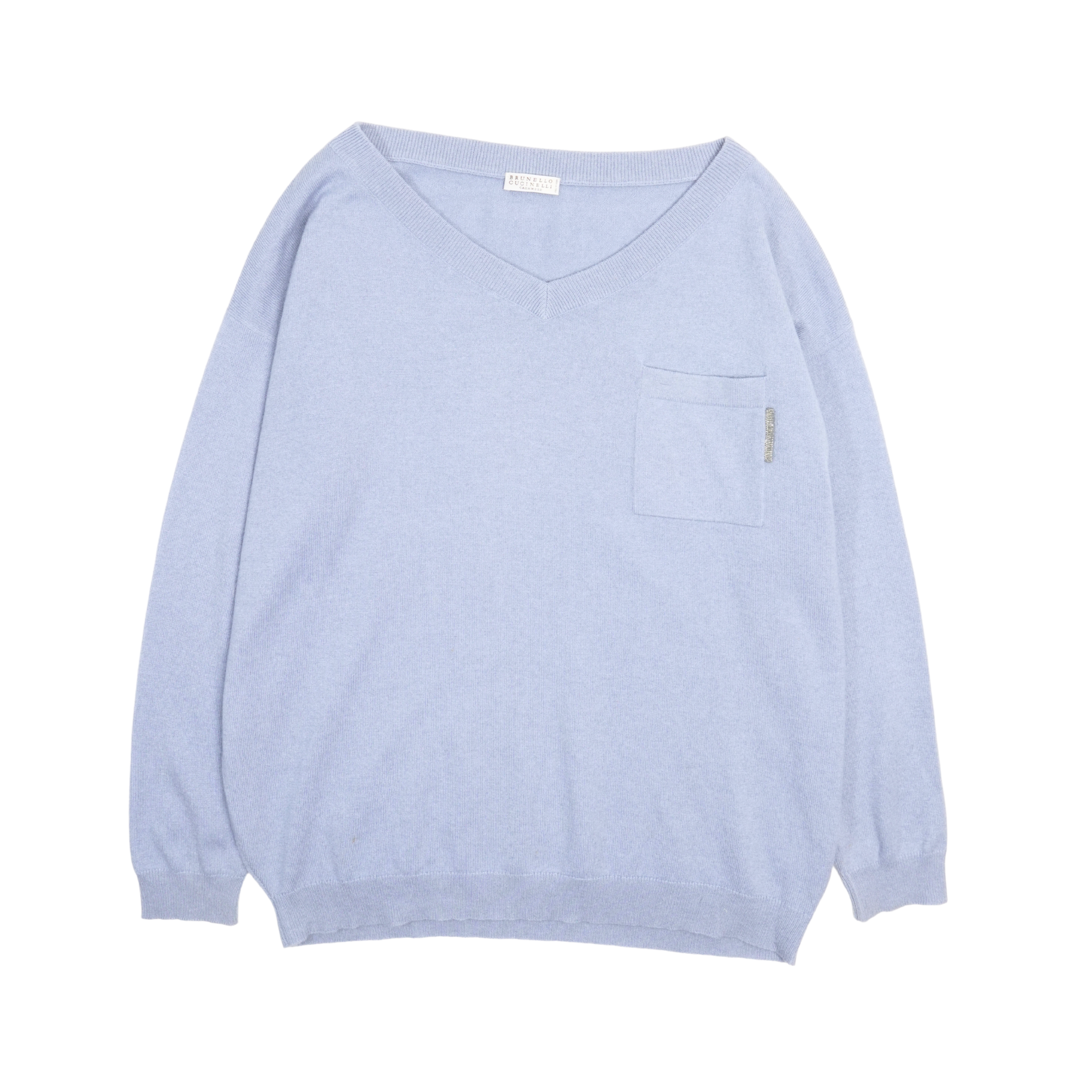 Brunello Cucinelli v-neck sweater in light blue cashmere with a chest pocket and a small 'monili' beaded tab.