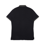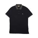 Burberry navy blue polo shirt with heather grey collar and silver knight logo on chest.