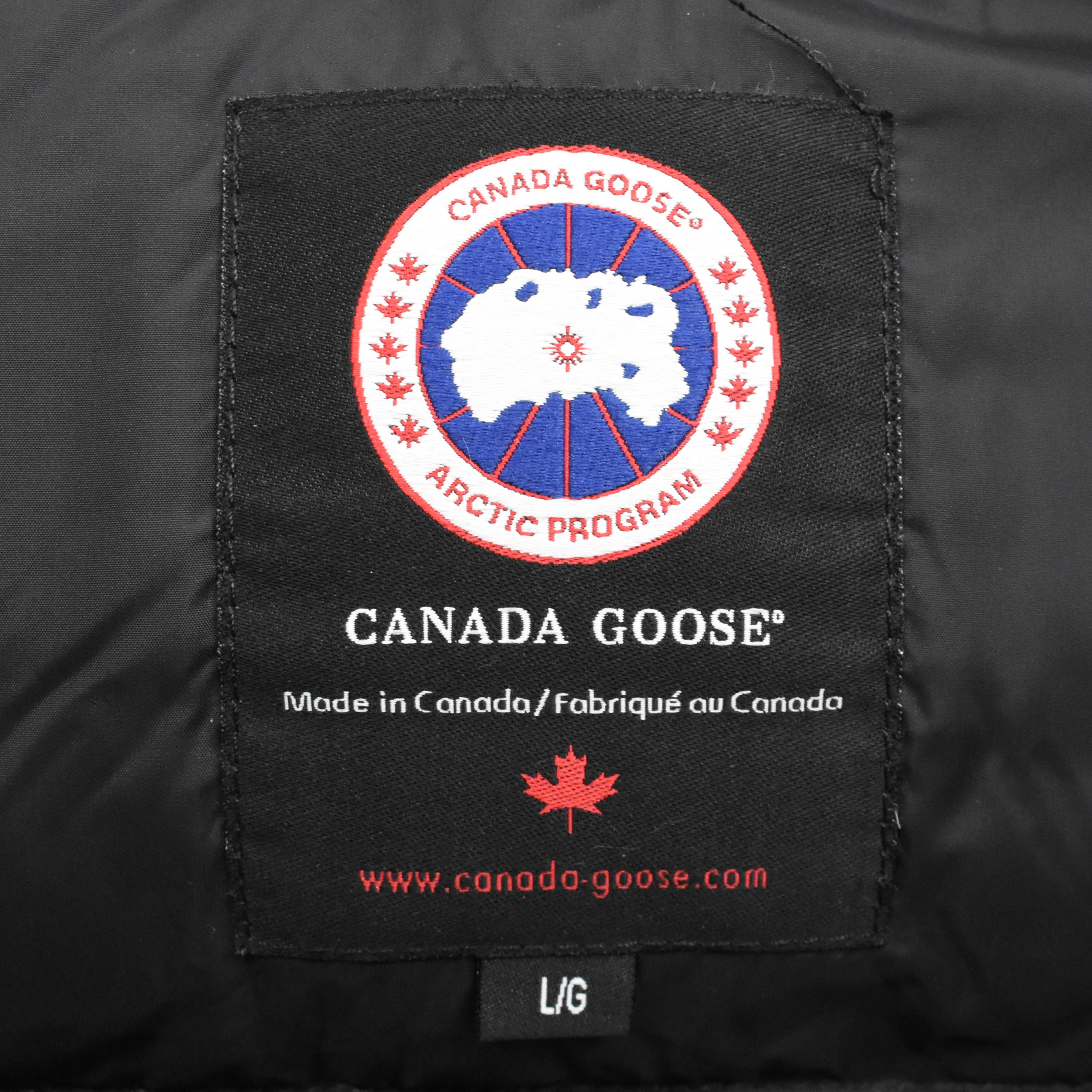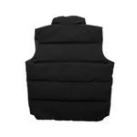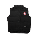 Canada Goose 'Freestyle' puffer vest in black nylon with a hidden front zip closure, tonal snap buttons, front slip pockets, and a signature logo patch on the chest.