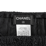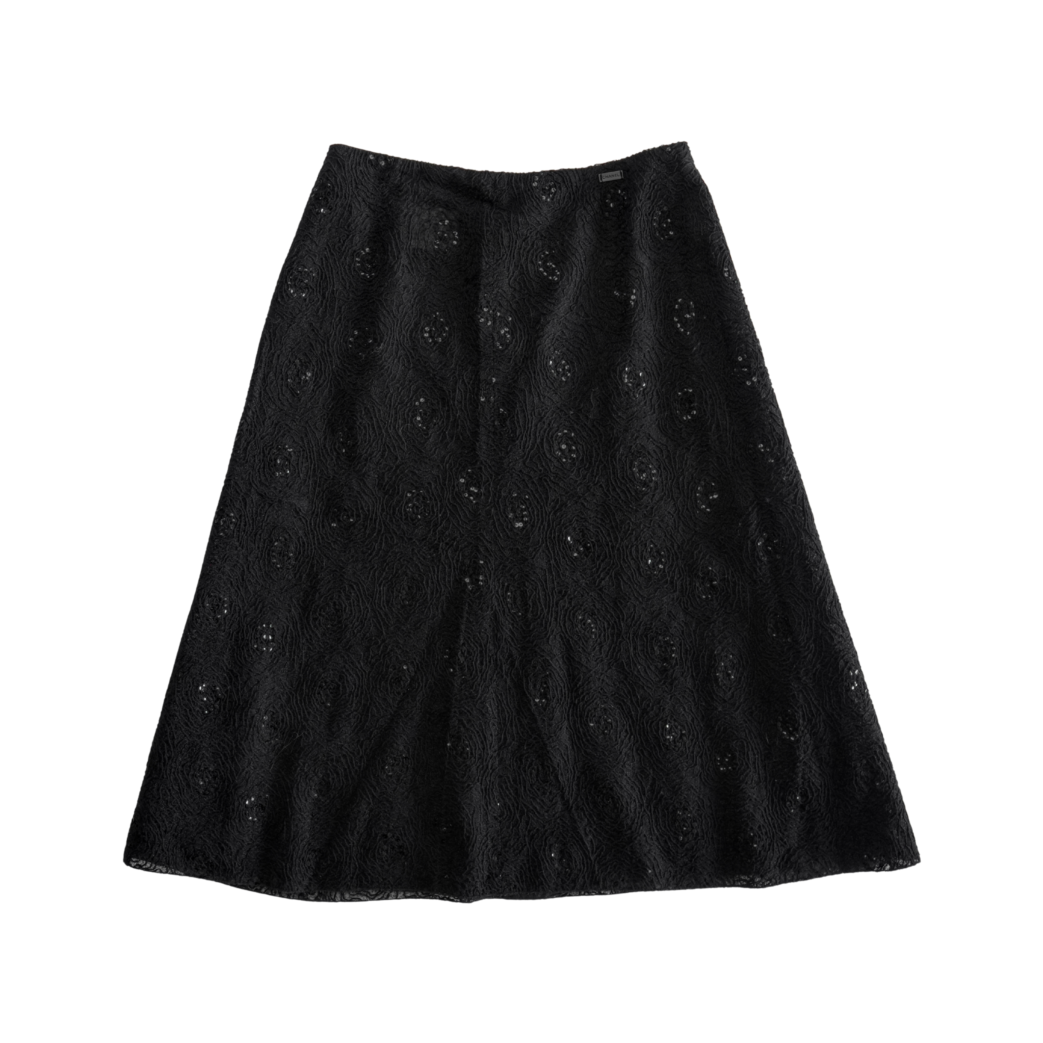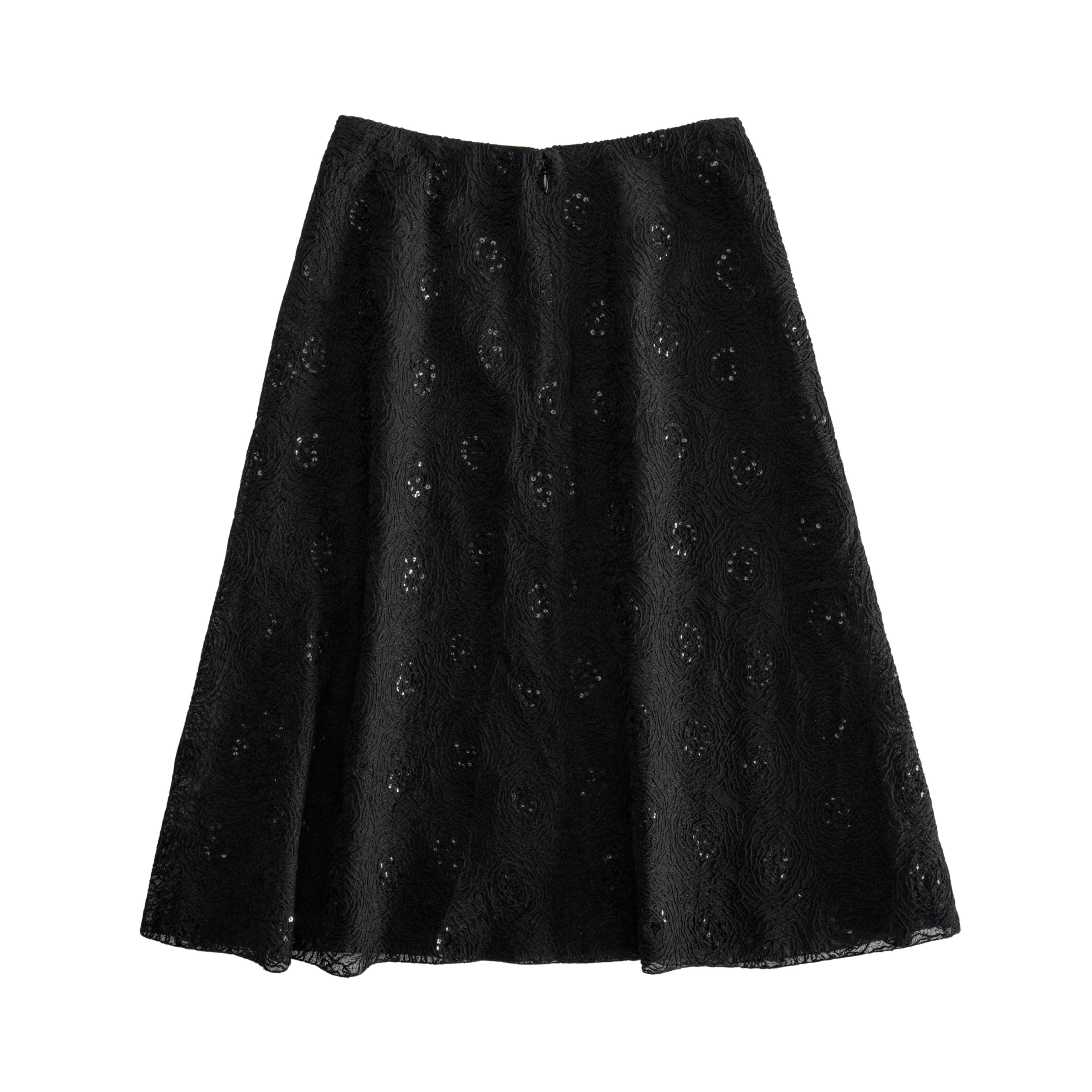 Chanel a-line skirt in black with spiral stitching throughout, sequin appliqués, and a hidden back-zip opening.