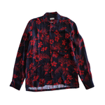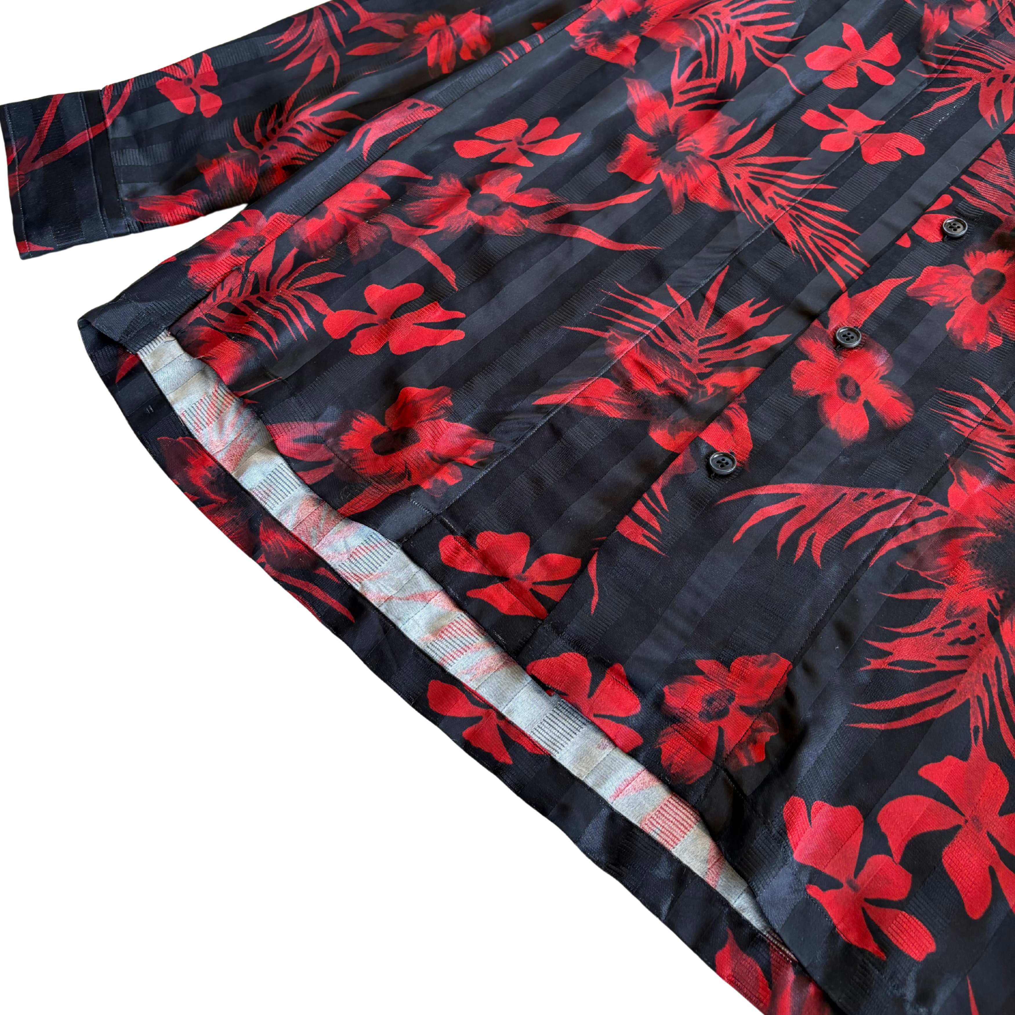 Dries Van Noten button-down shirts in black striped viscose with an all-over red floral print, a chest pocket, and small black buttons.