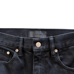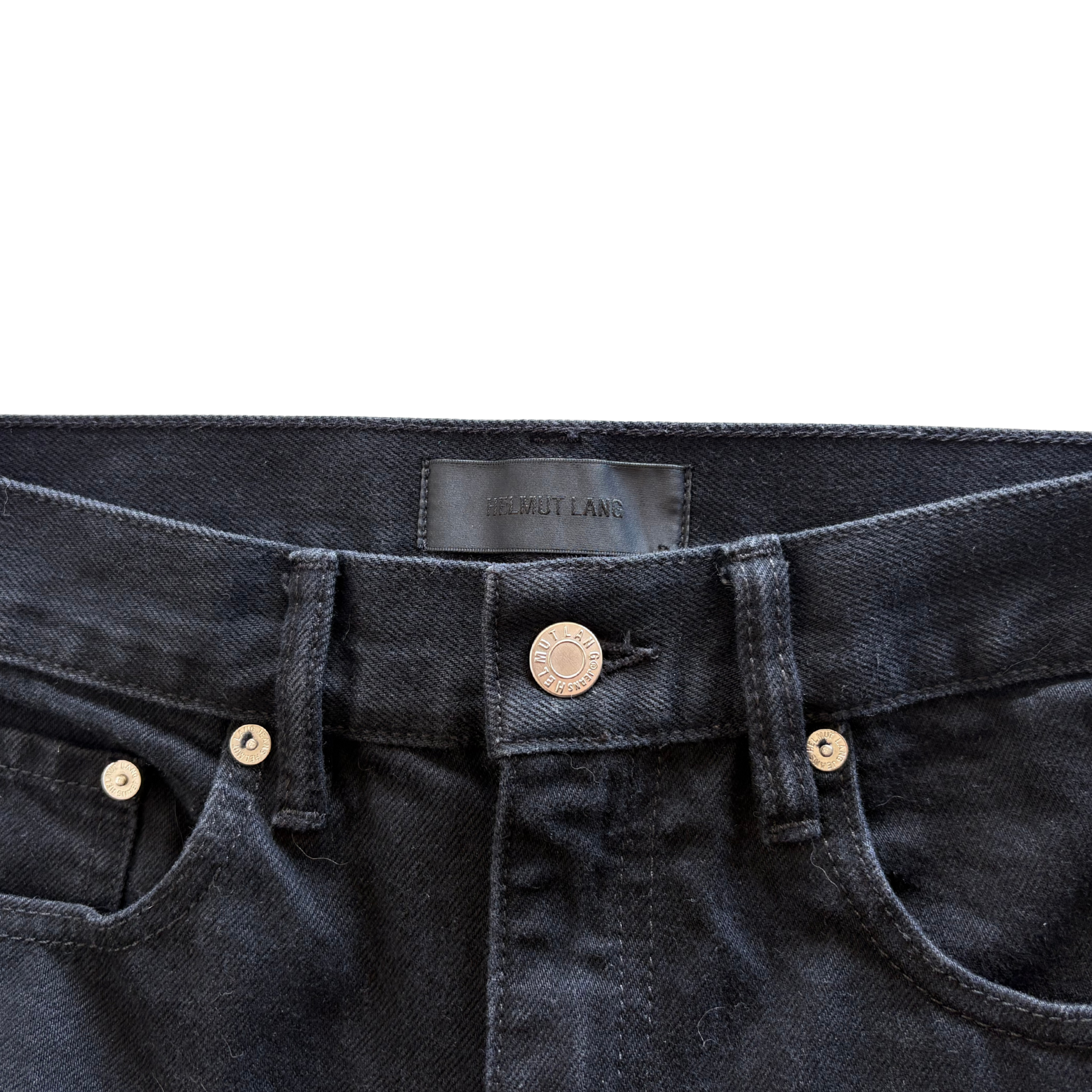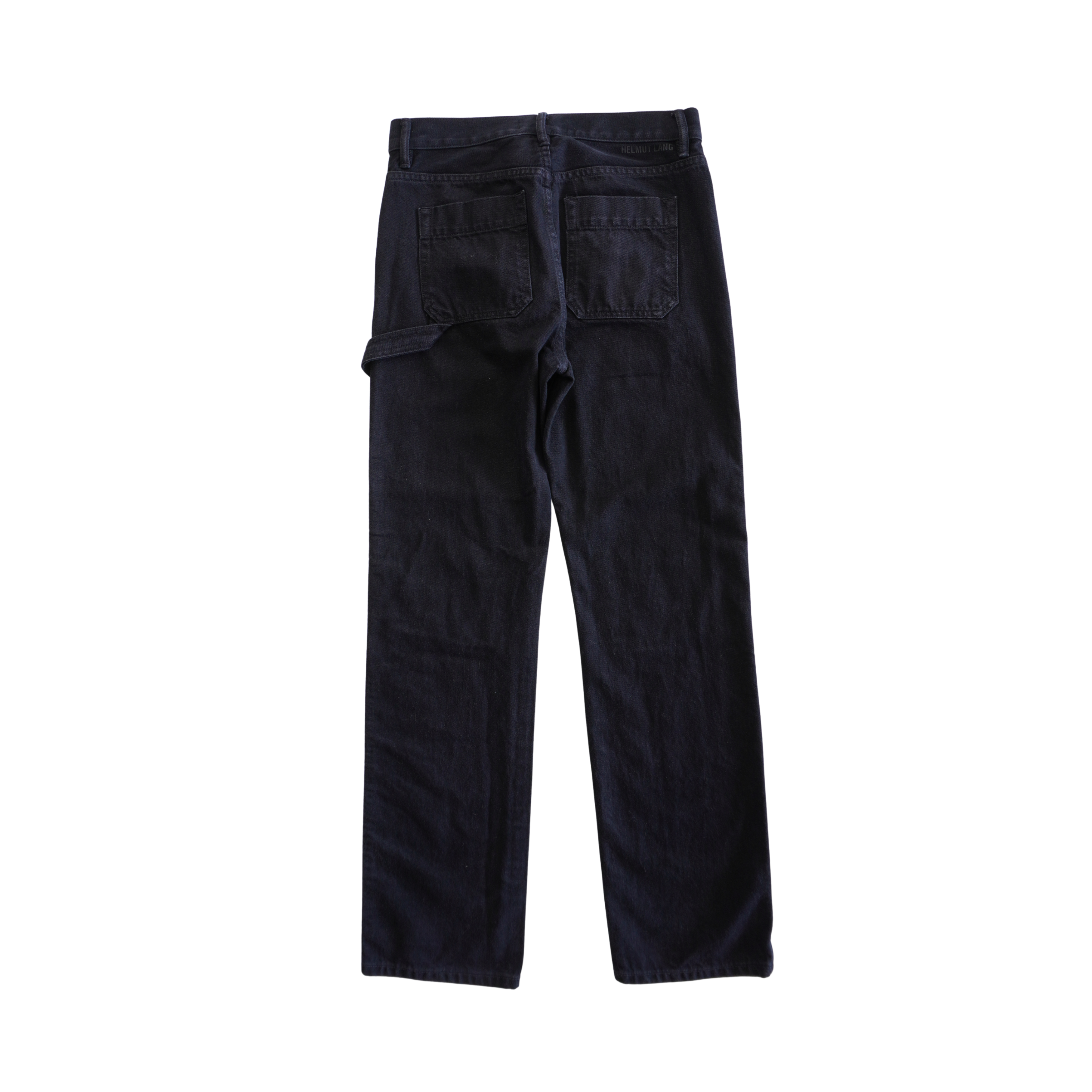 Helmut Lang straight legged cargo pants in black denim with front double knee panels, five-pocket styling, and small logo on right back.
