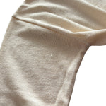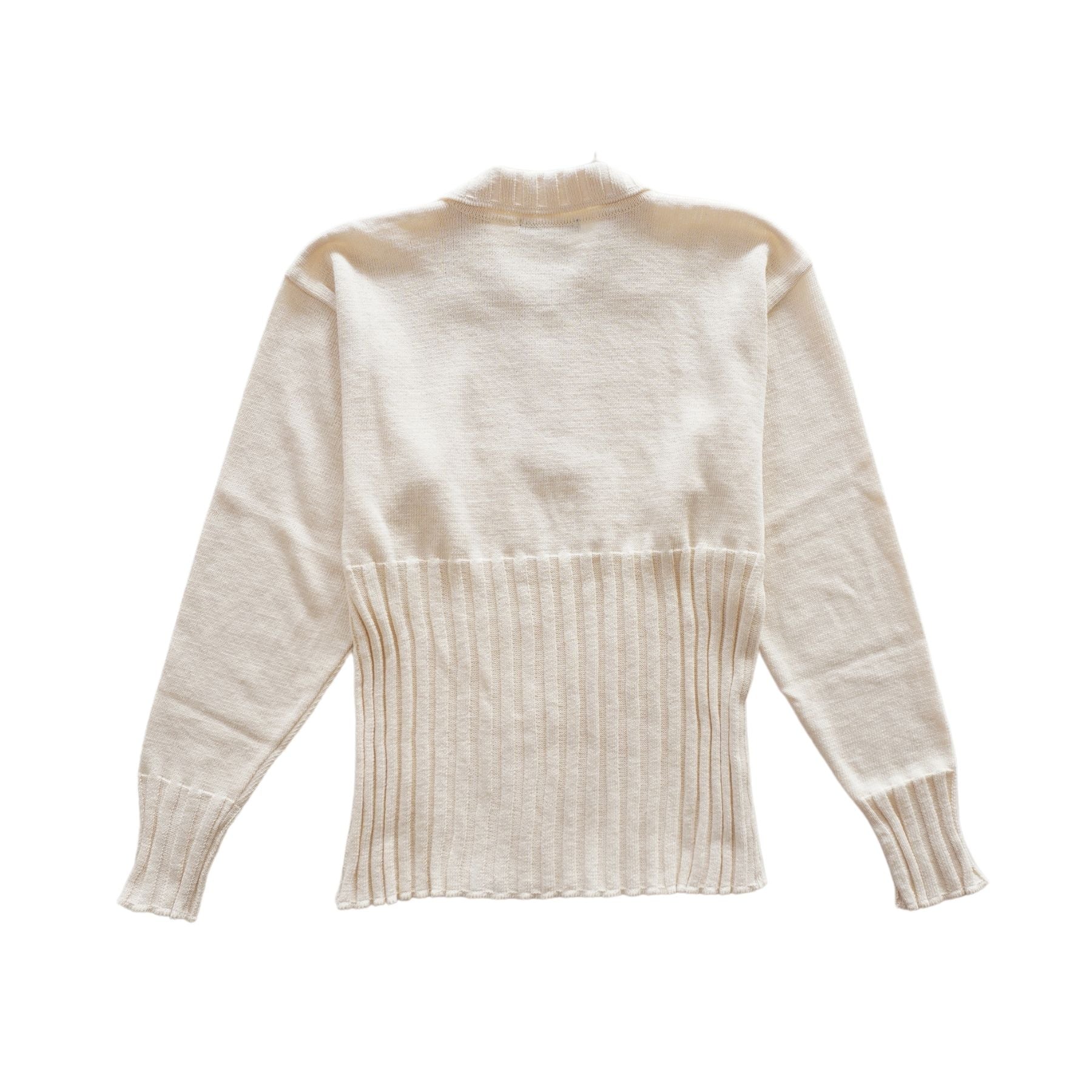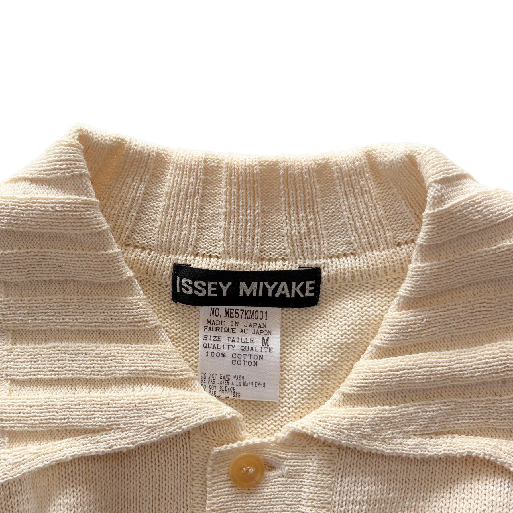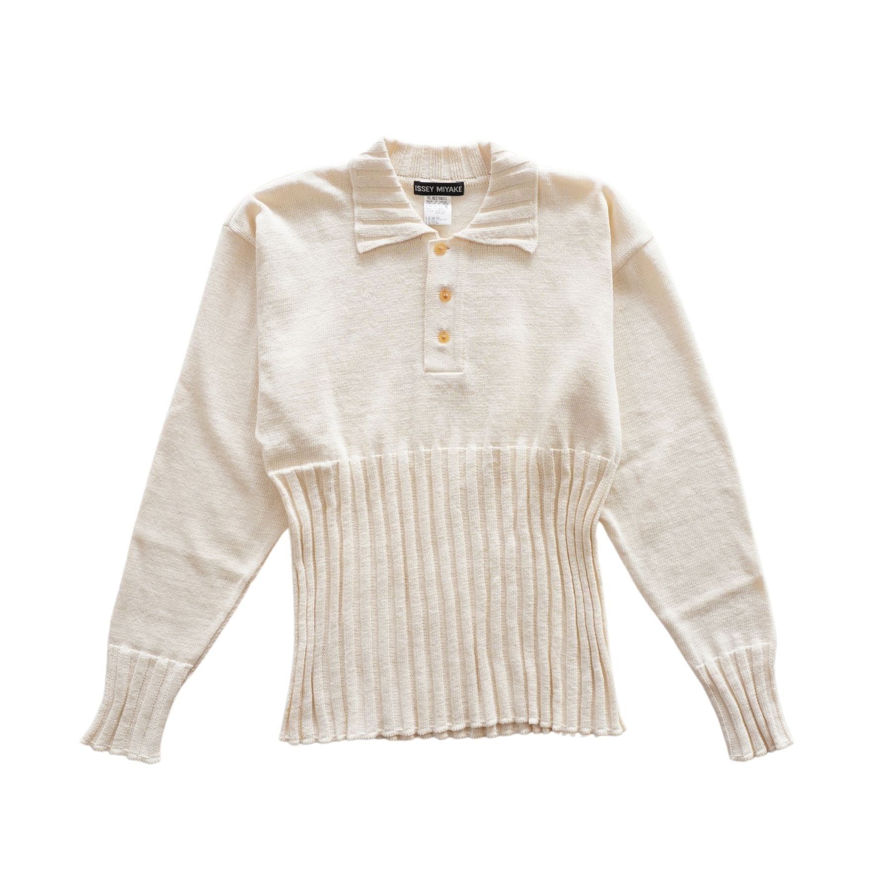 Issey Miyake polo sweater in cream knit cotton with ribbed knit details on the lower body and sleevs, a collar, and a half-button opening with small tan buttons.