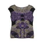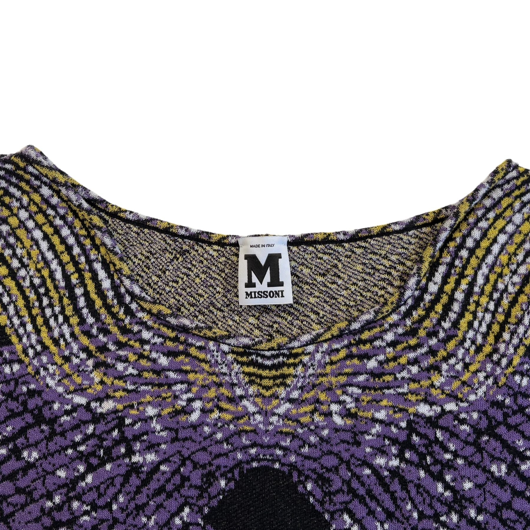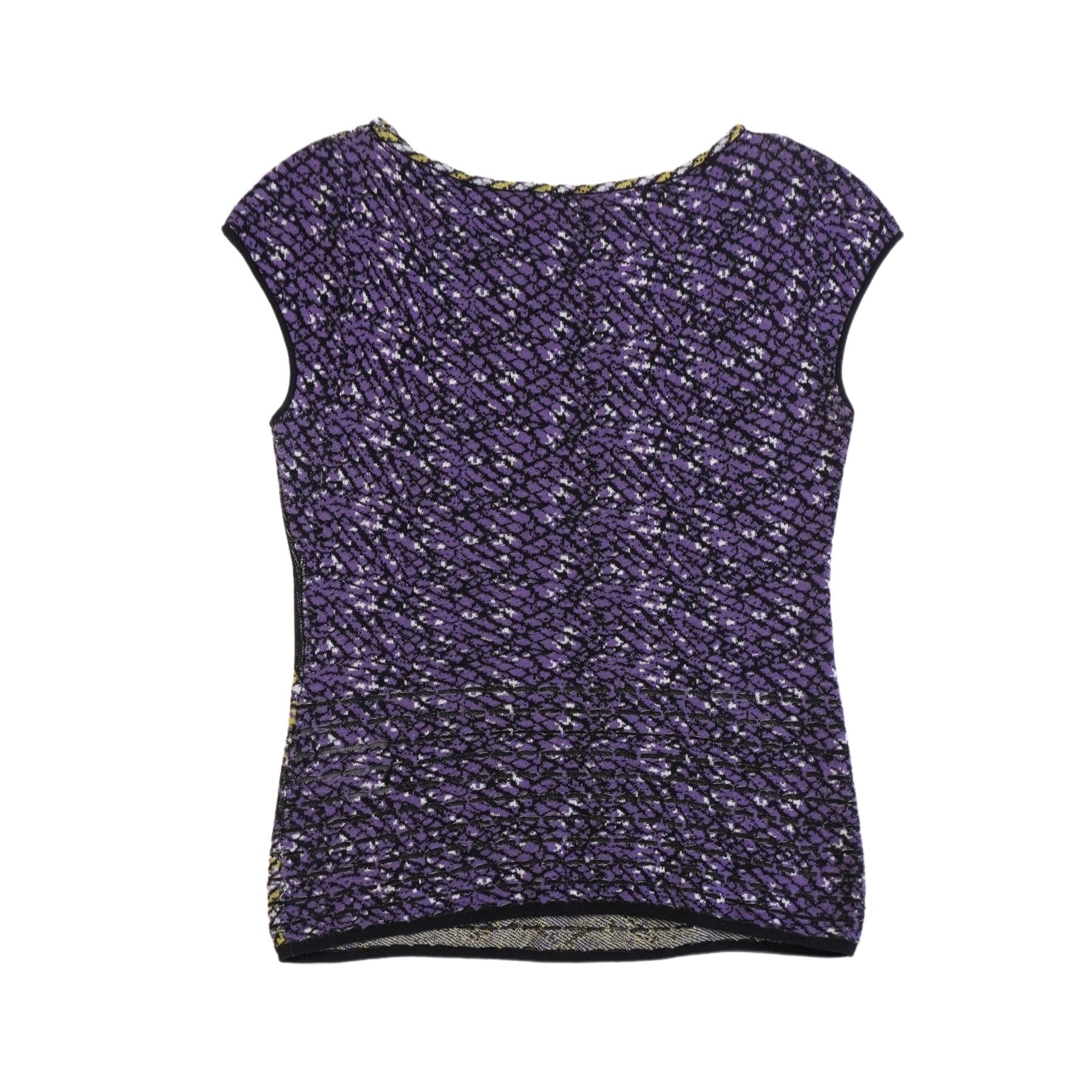 Missoni top in a black, yellow and purple abstract stretch knit with a black trim, cap sleeves, and a round neckline.