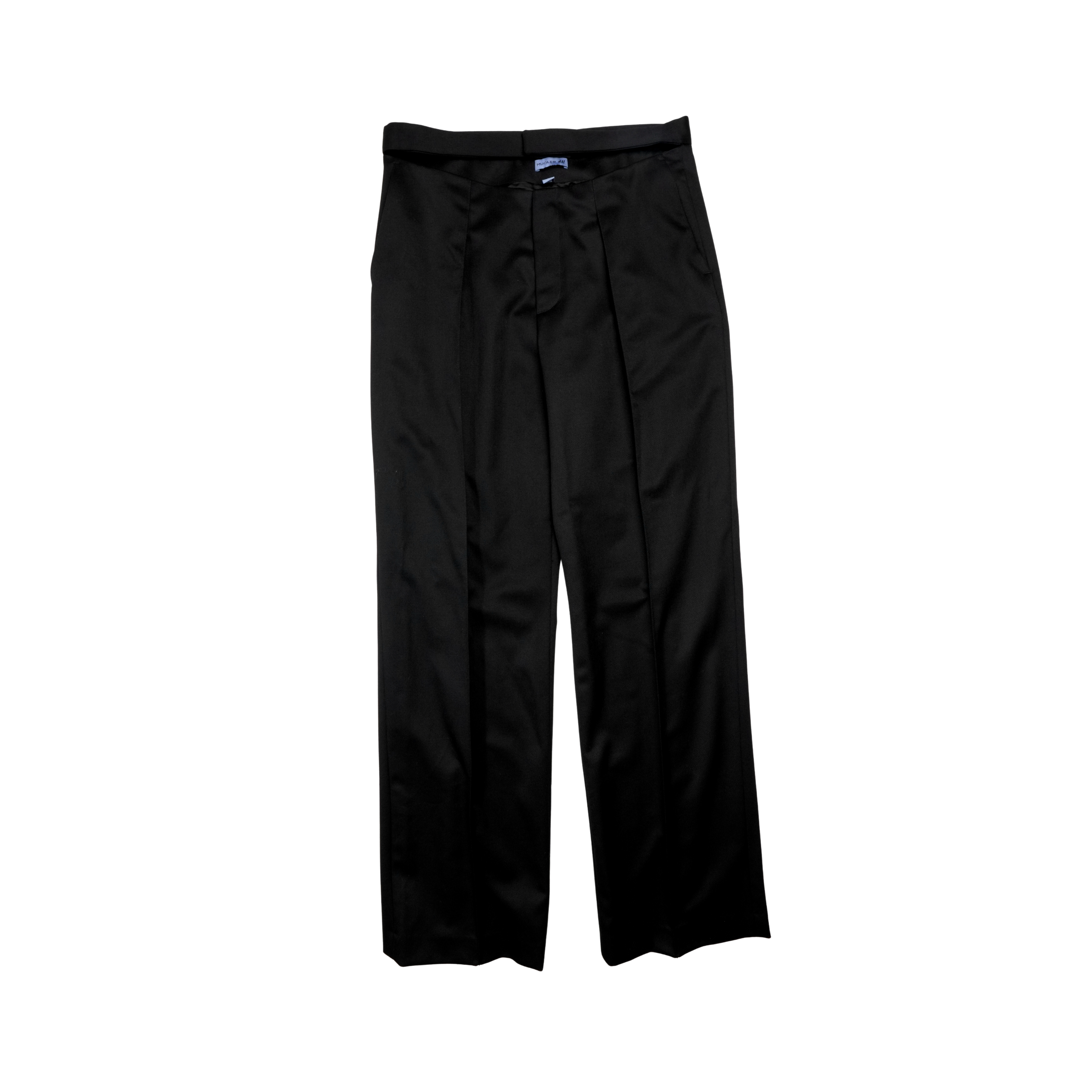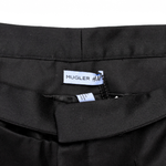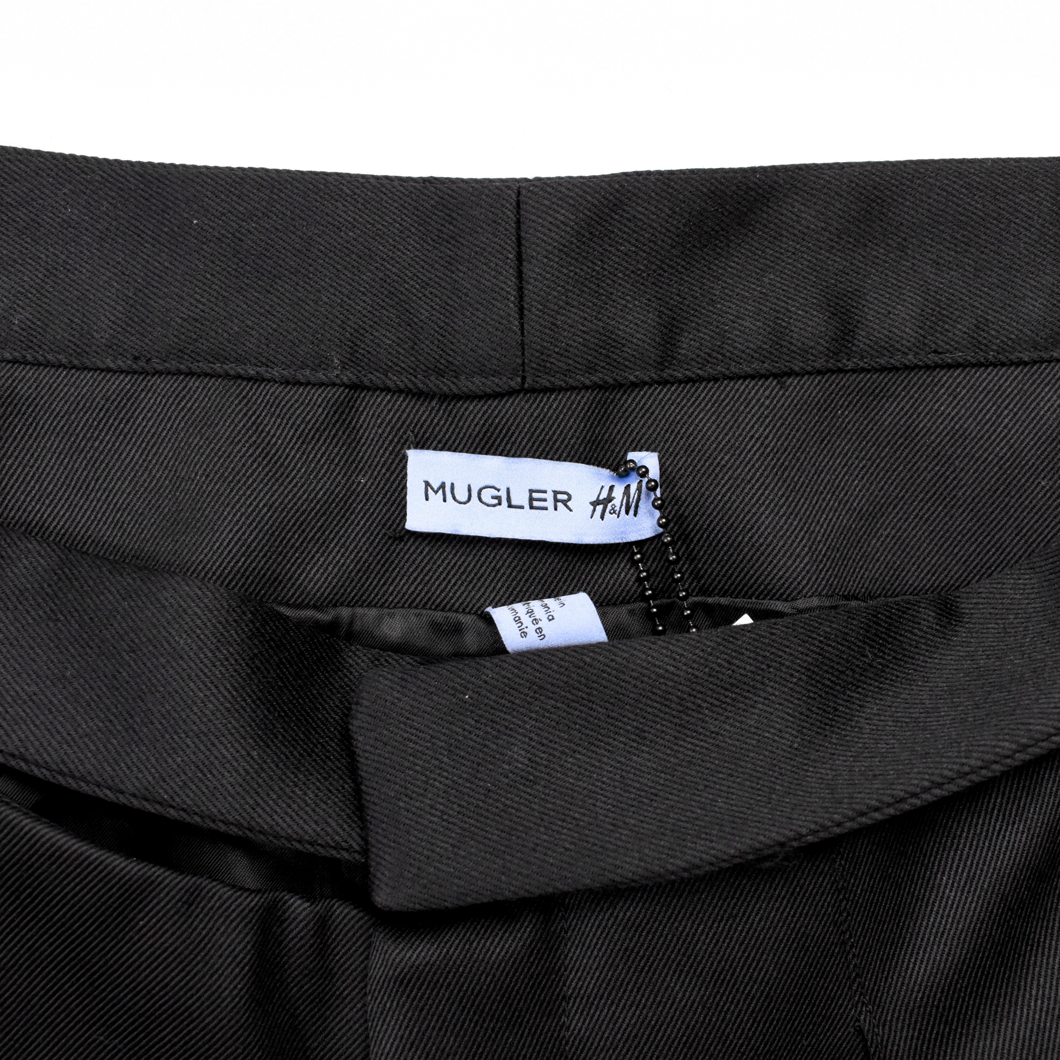 Mugler x H&M straight legged trousers in black wool with three pocket styling, front pleats and stylized waistband cutout.
