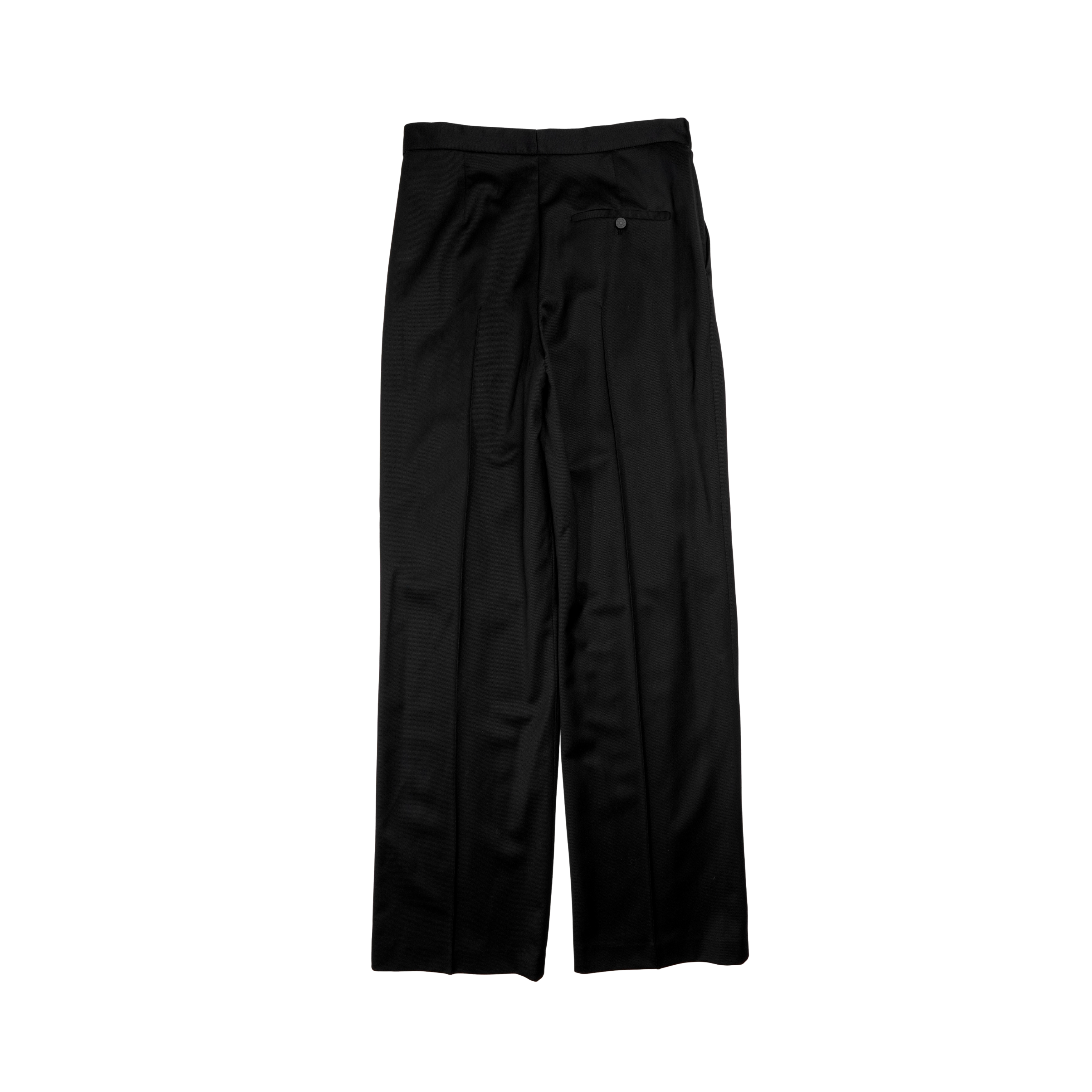 Mugler x H&M straight legged trousers in black wool with three pocket styling, front pleats and stylized waistband cutout.