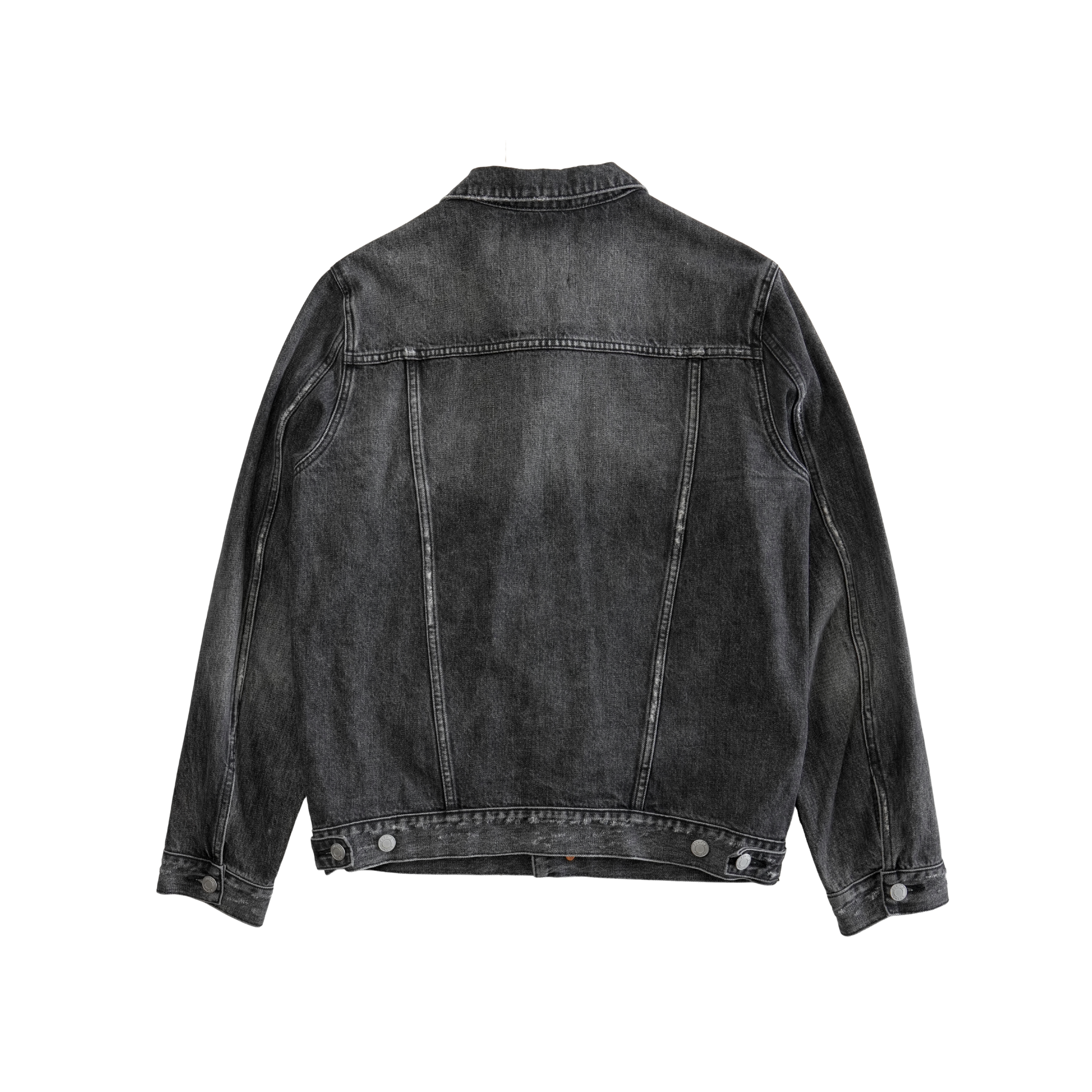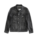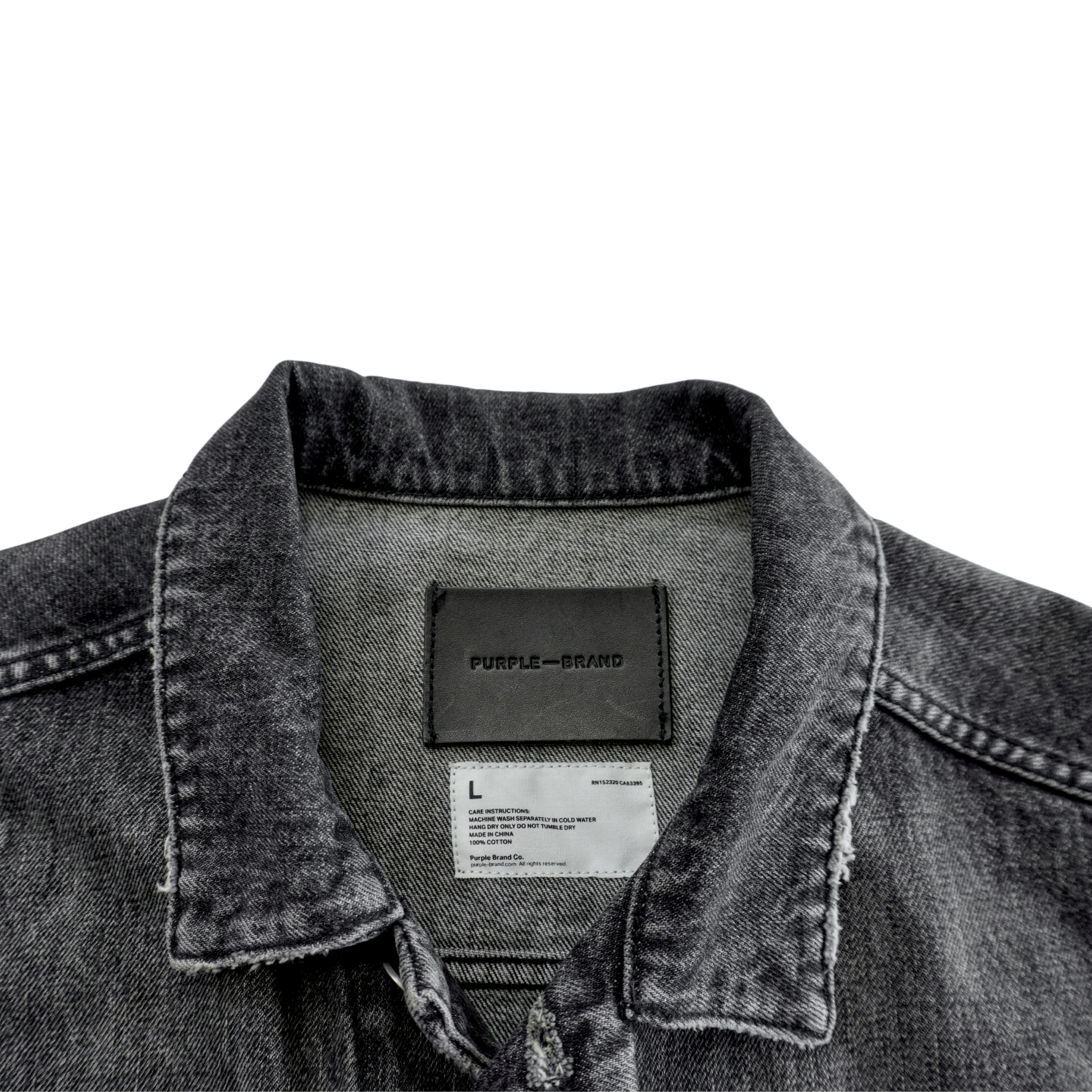 Purple Brand denim jacket in grey distressed denim with silver button hardware, chest pockets, and a collar.