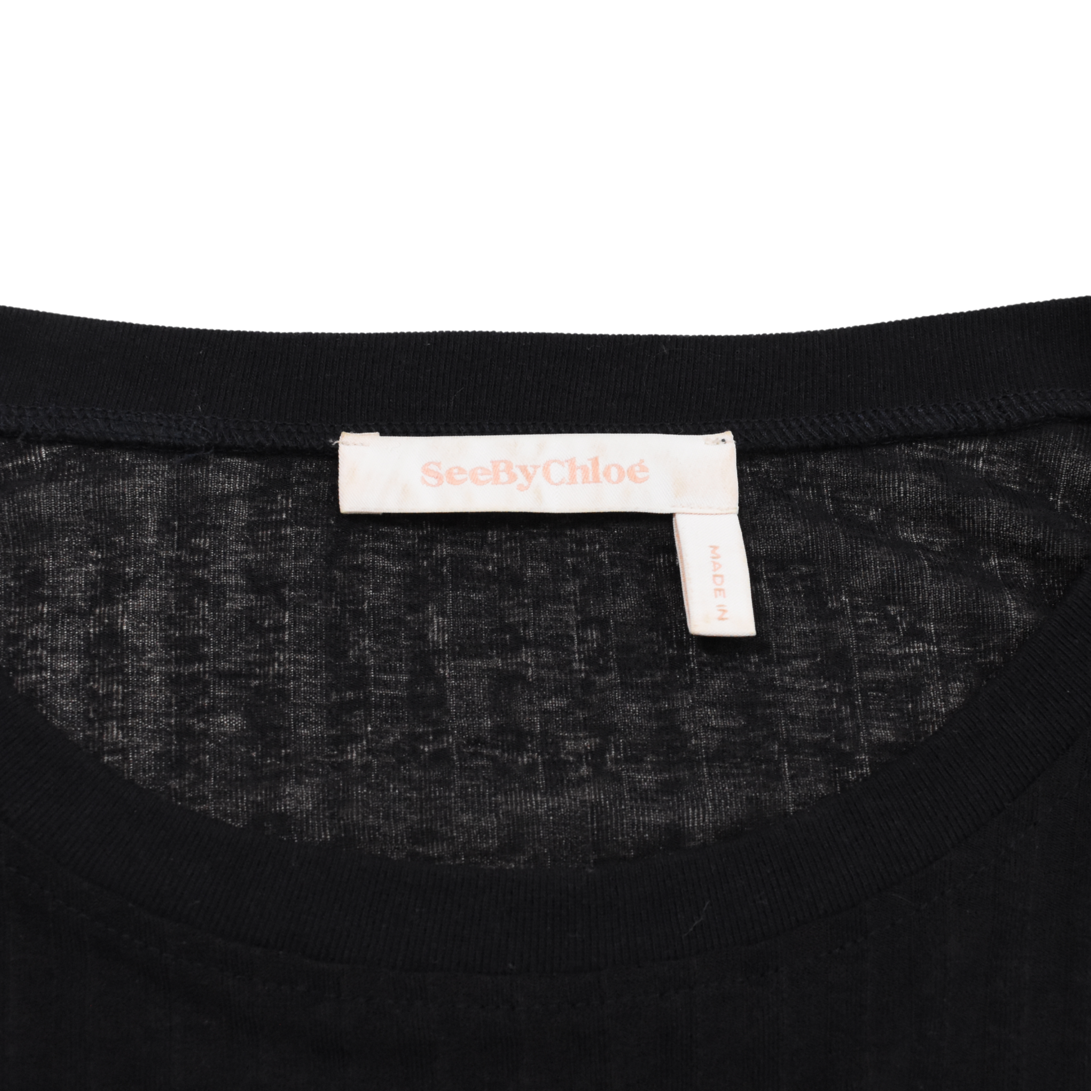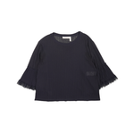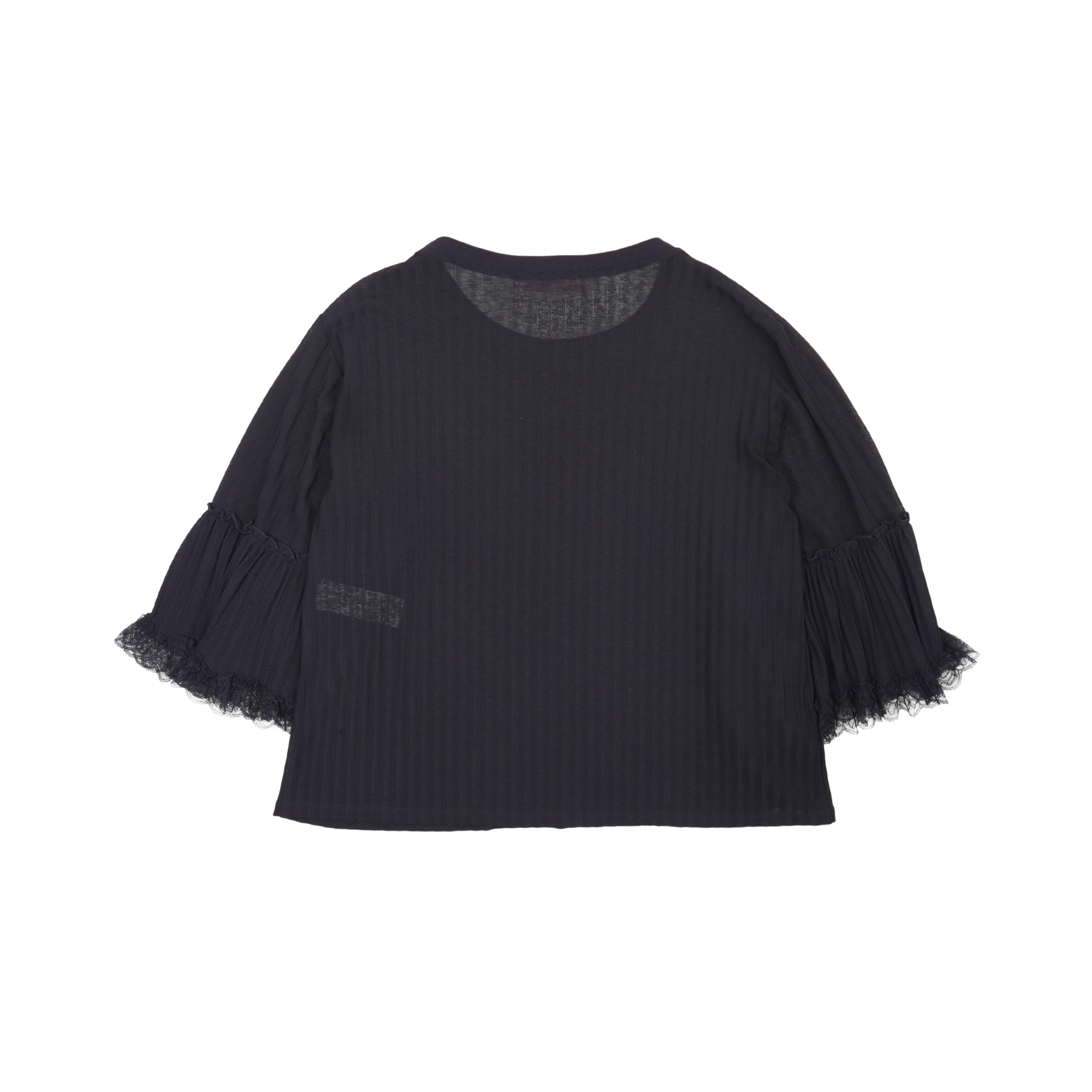 See By Chloe boxy blouse top in purple with all-over ribbing, flared three quarter sleeves, and lace trim details.