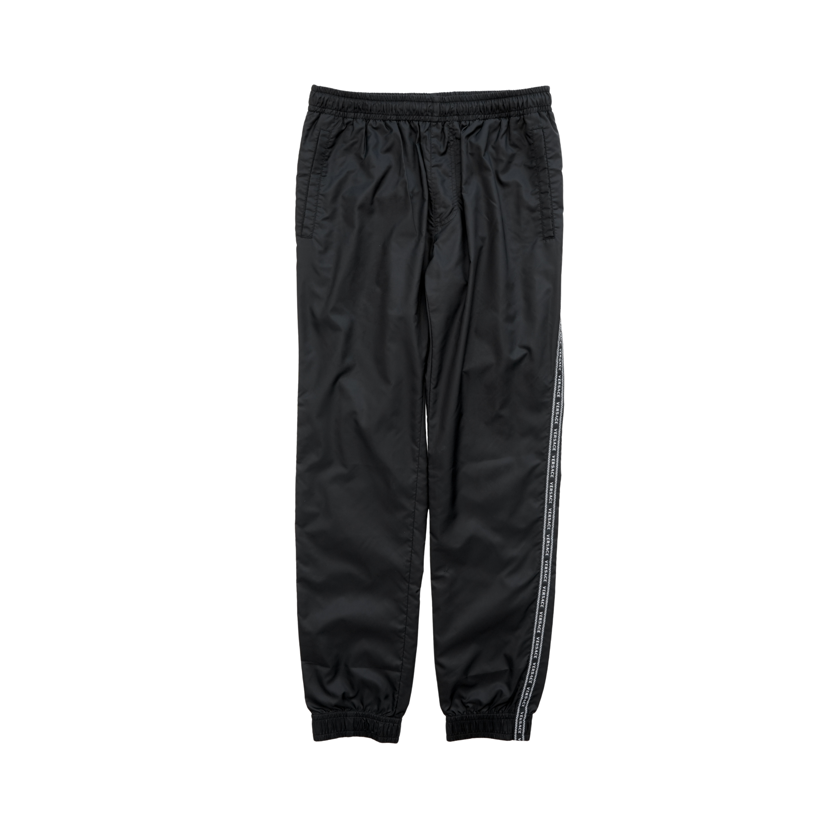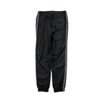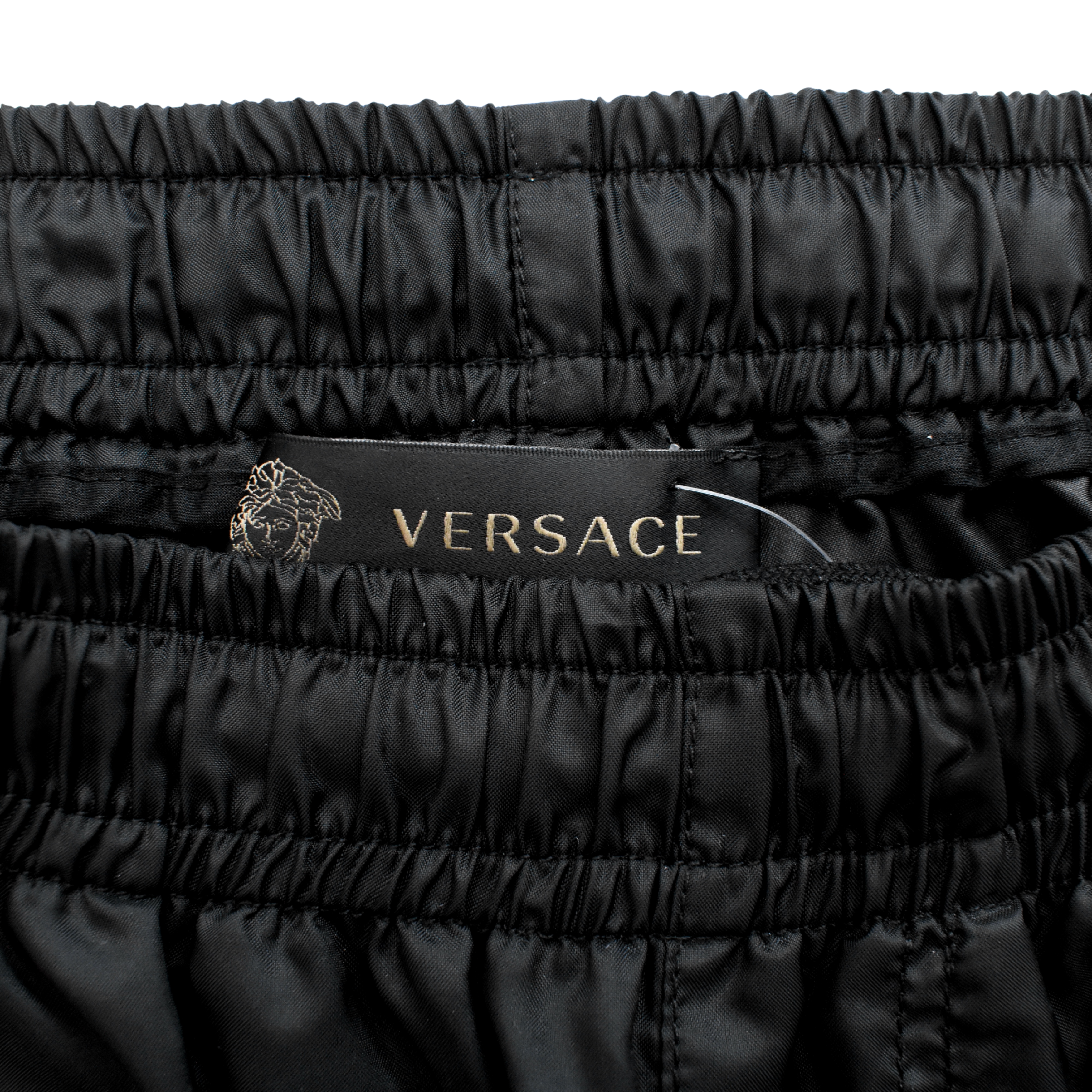 Versace track pants in black nylon with white logo tape along the sides with elastic waistband and drawstrings, cinched cuffs and with three pocket styling.