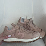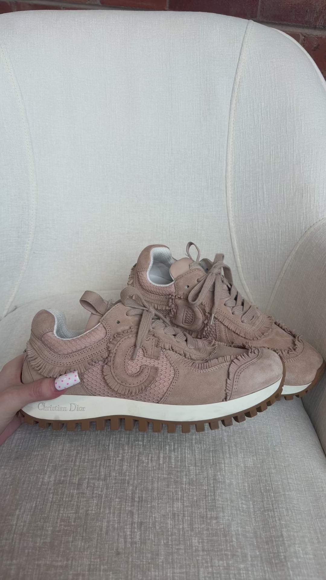 Christian Dior 'C'est Dior' low top sneakers in blush suede with fringe trim, mesh panels, and raised 'CD' logos on the sides.