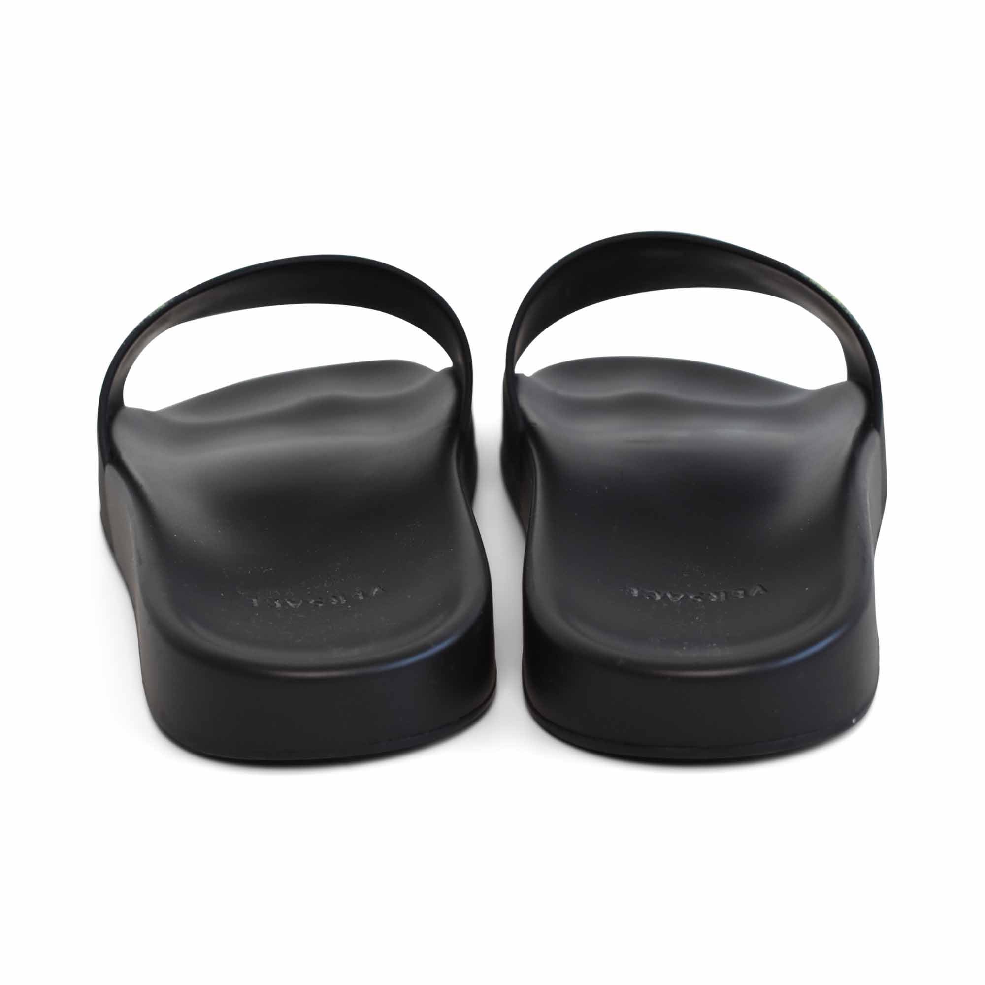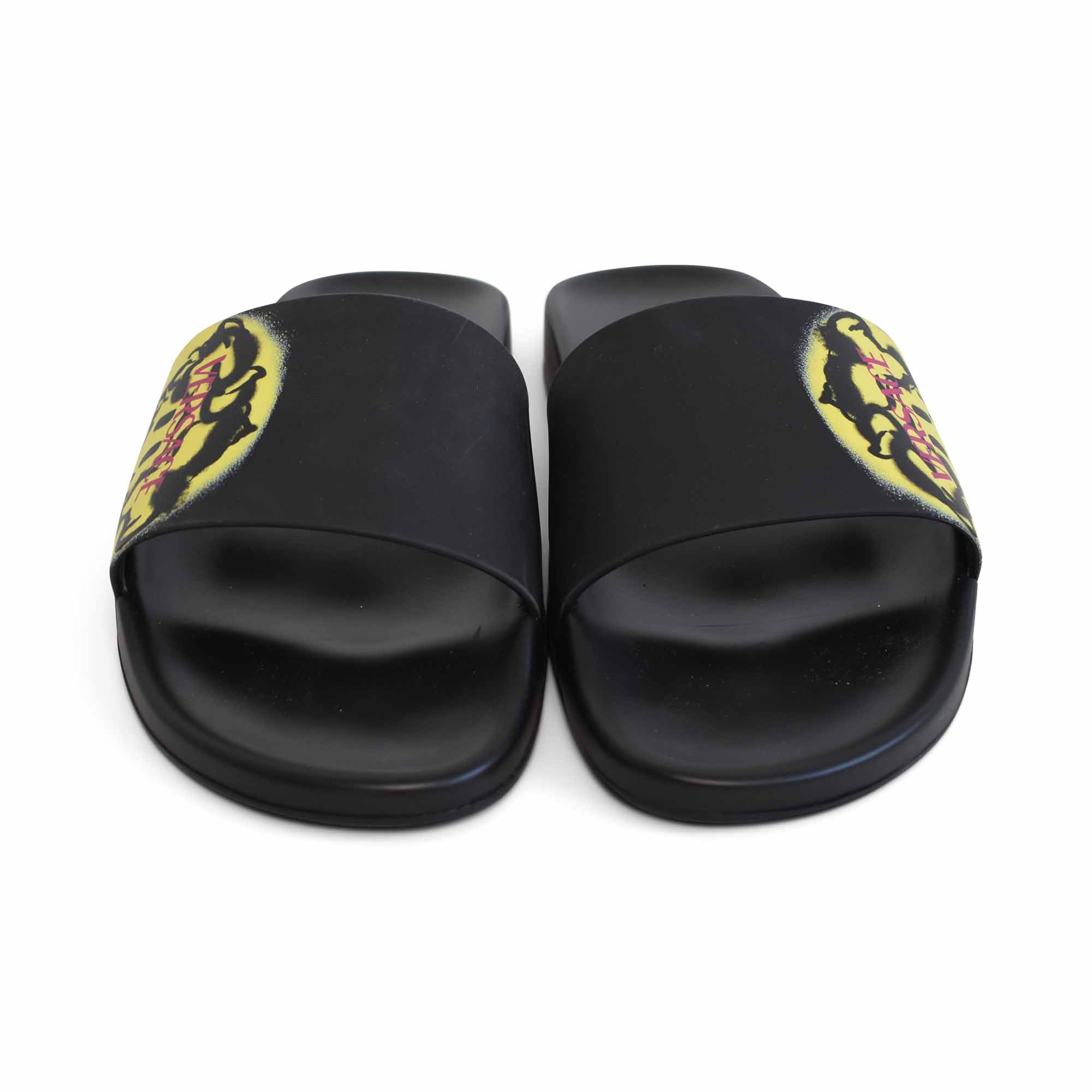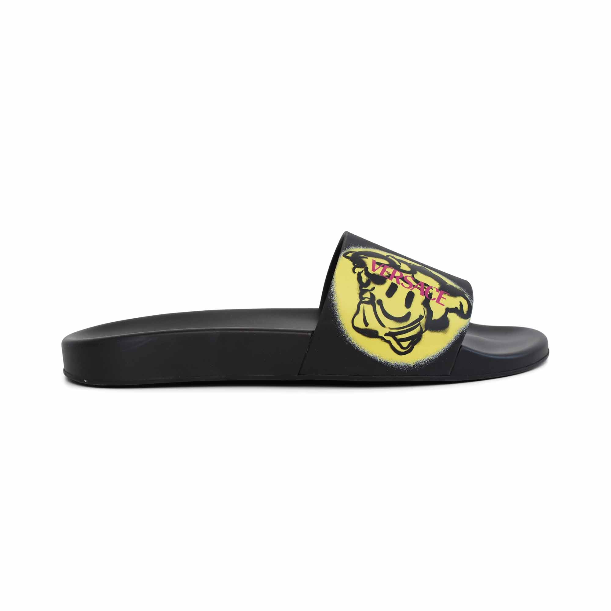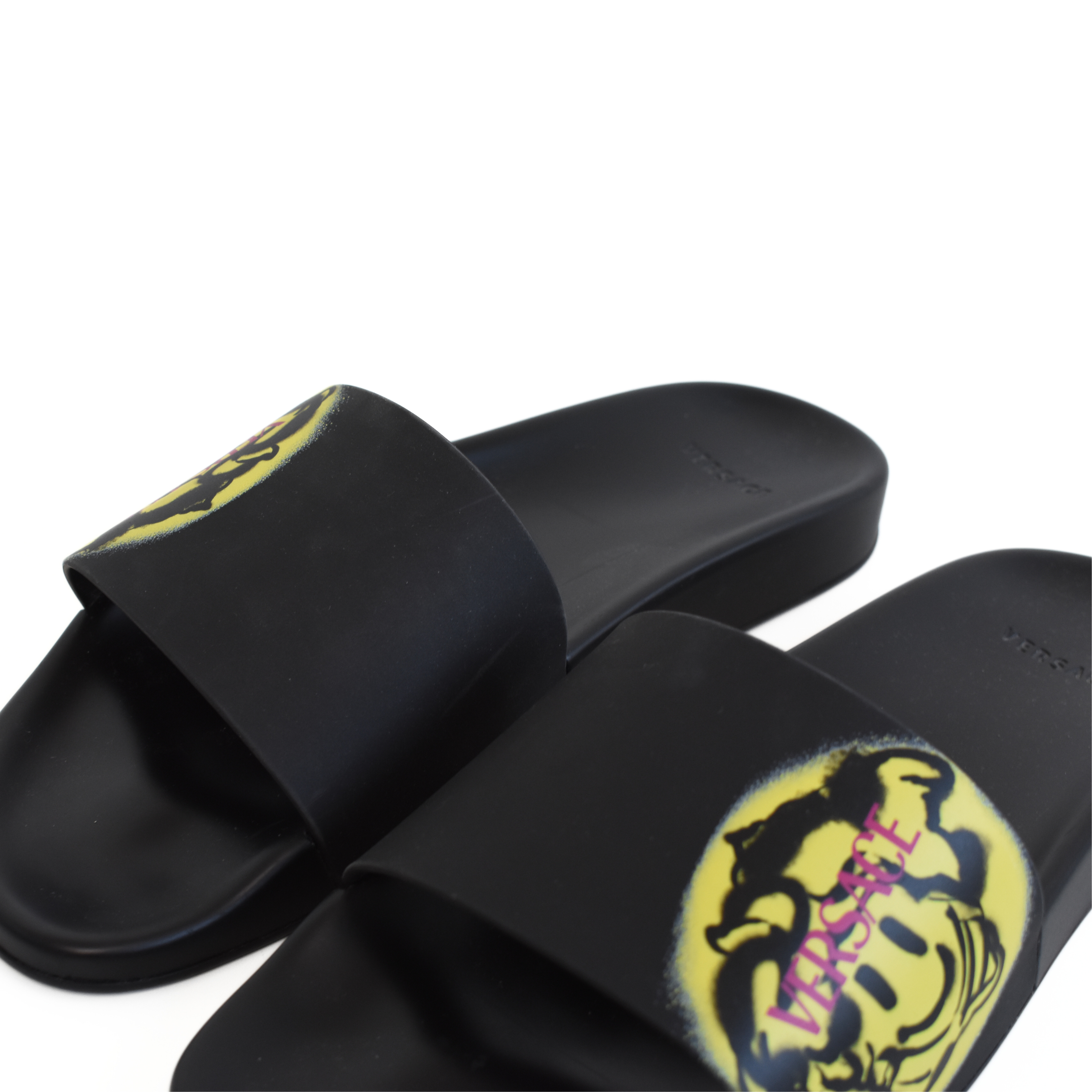 Versace 'Medusa Tag' pool slides in black rubber with a neon spray painted medusa smiley face graphic on the straps.
