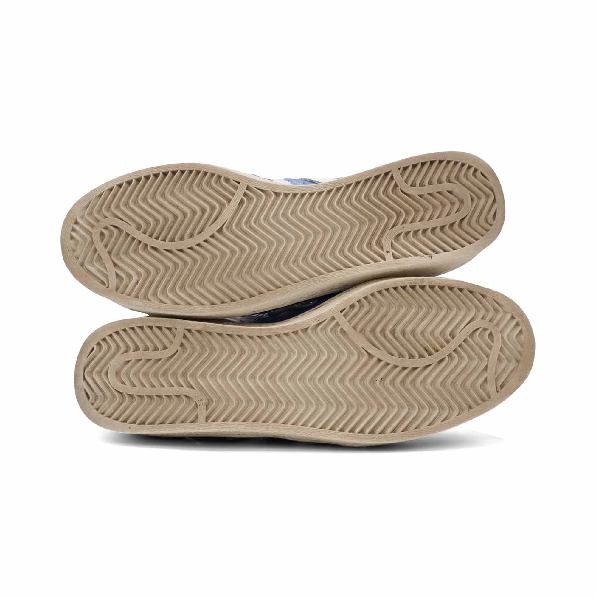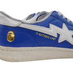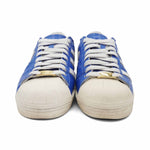 Adidas x Bape 'Superstar Vintage' low top sneakers in blue embossed leather with white details. Features a white rubber toe cap, white patent 'Bape Star' on one side and Adidas 'Three-Stripe' on the other side, a gold logo lace aglet, gold Bape logo on the back and under star.