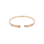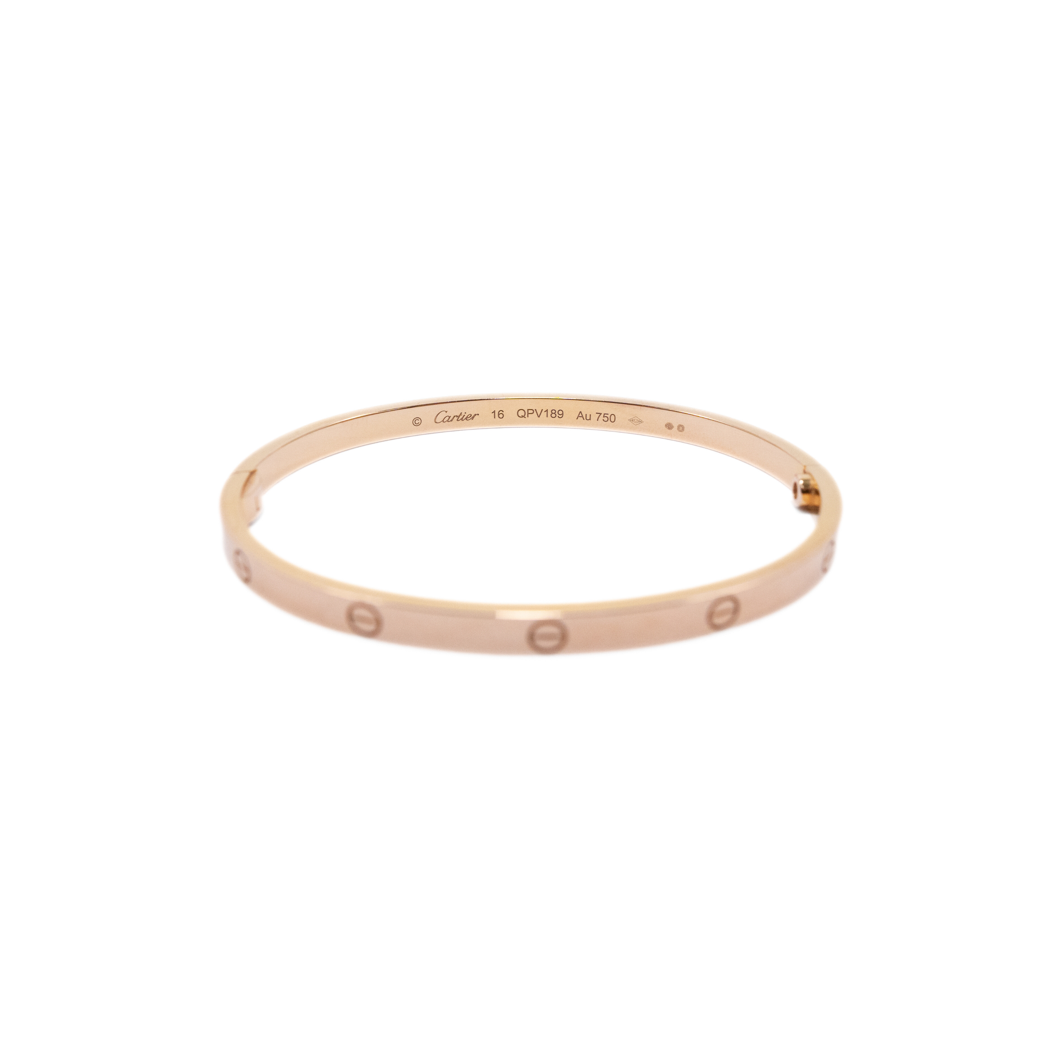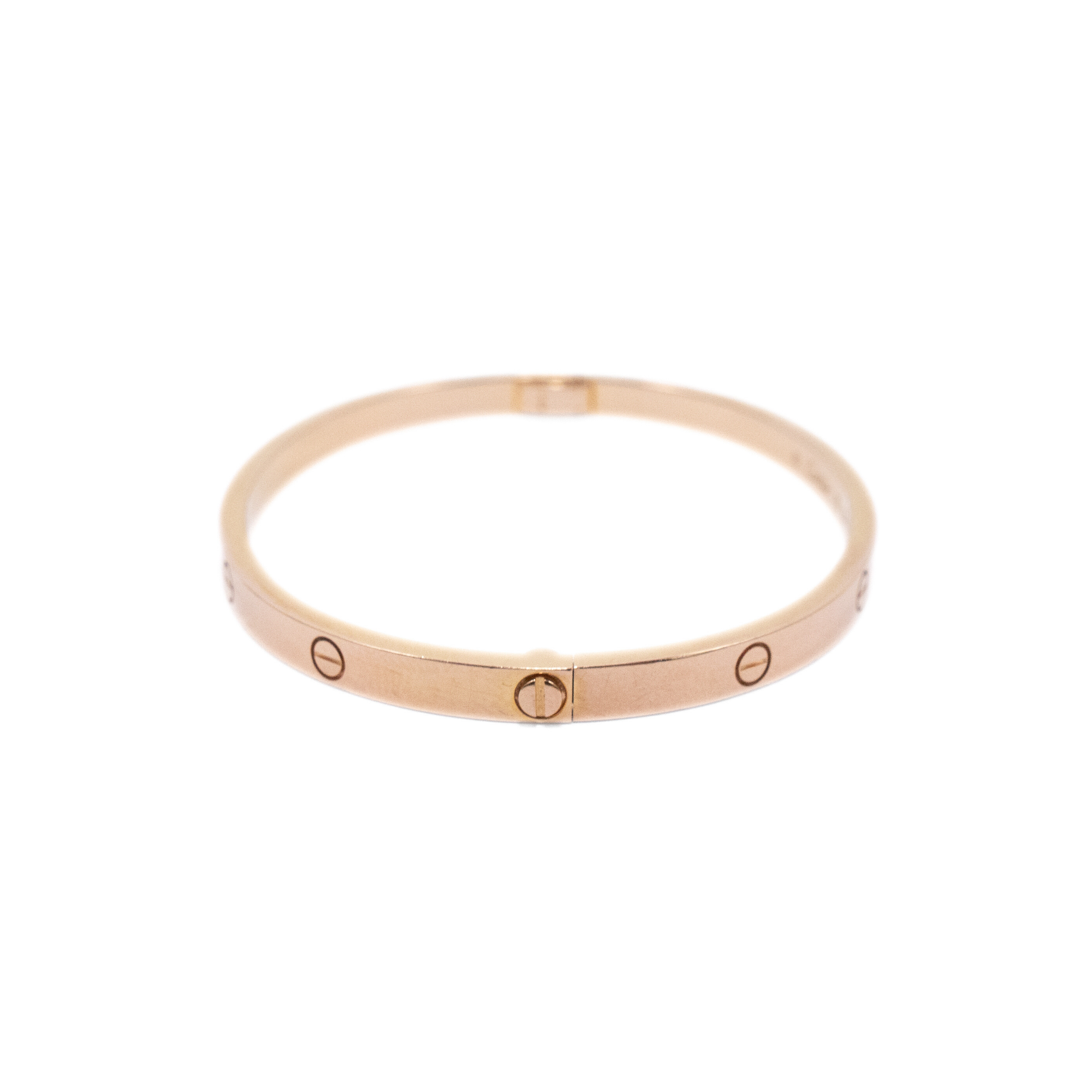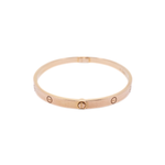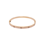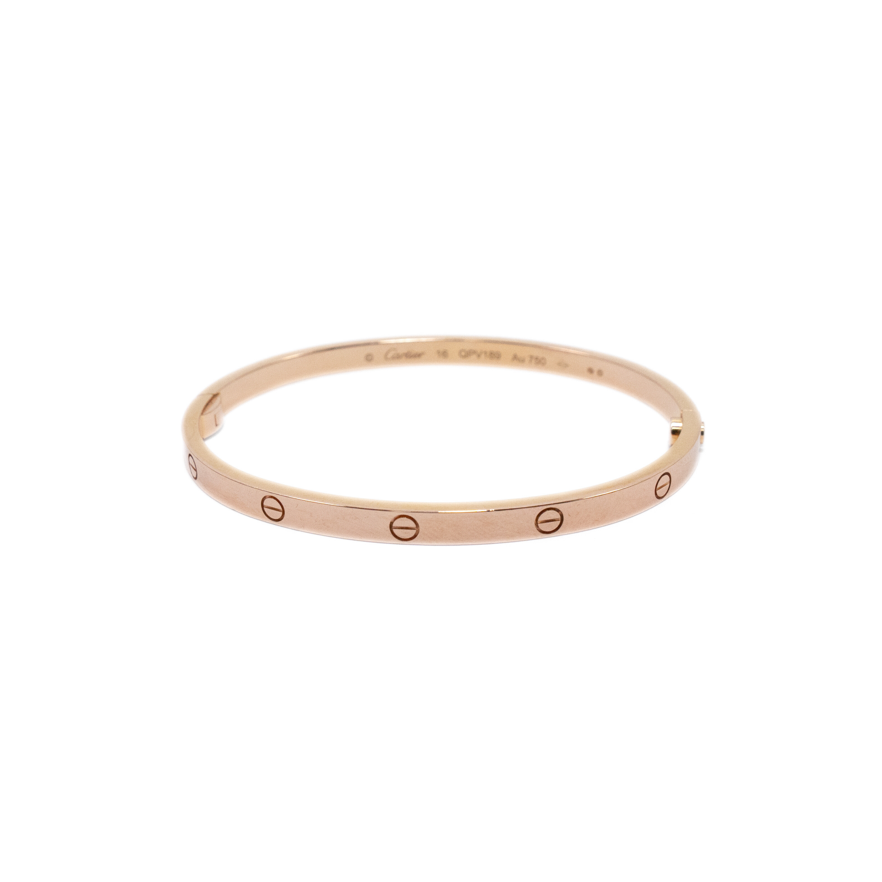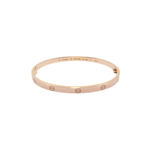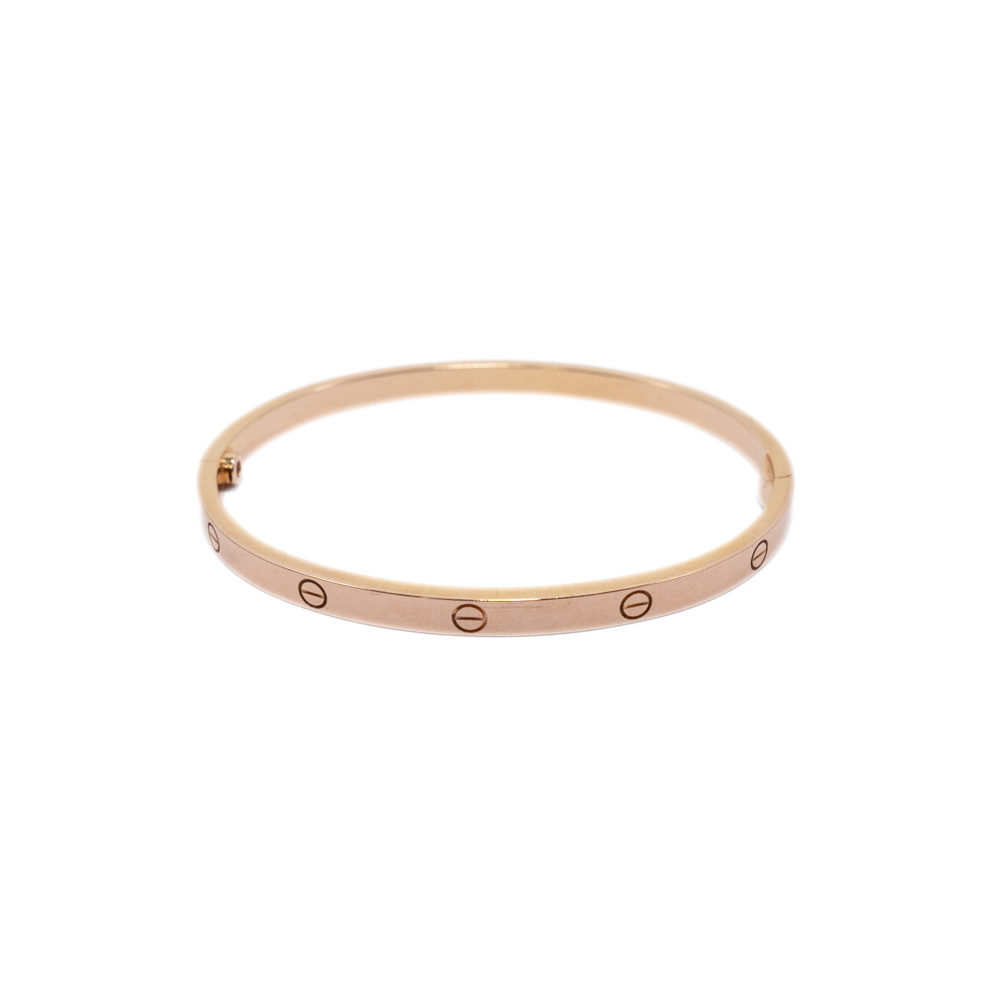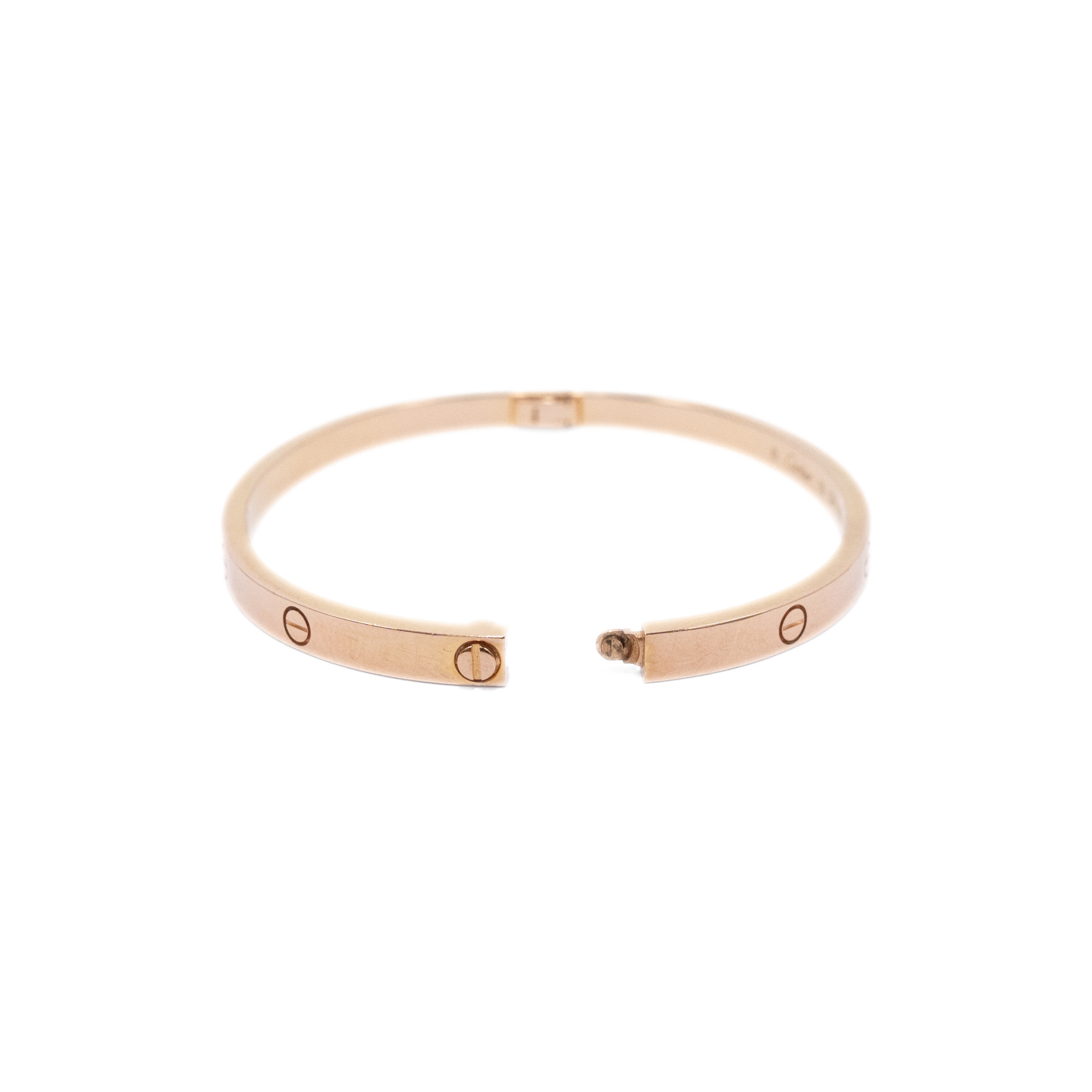 Cartier 18k Rose Gold 'Love' bracelet in 4 mm diameter. Features embossed screw motif throughout, engraved logo on interior, stamped with 'Au 750' inside of bracelet, and classic screw fastening.