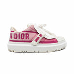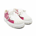 Christian Dior 'Dior ID' low-top chunky sneakers in white and pink ombre mesh. Features white rubber toe and lace cover, rubber 'DIOR-ID' logo on velcro strap and pink logo all across back on shoe.