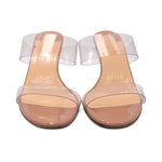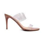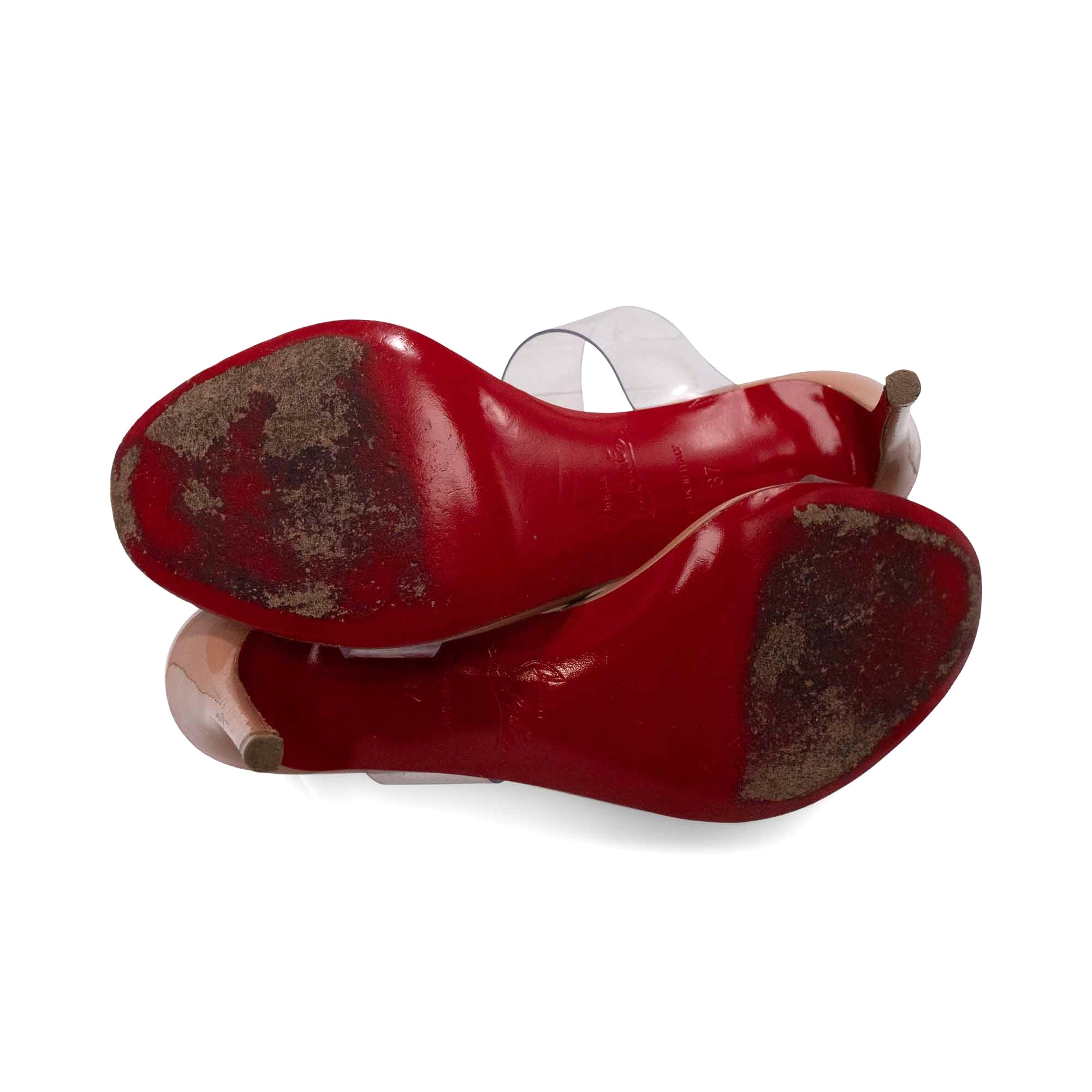 Christian Louboutin 'Just Nothing 85' mules in beige nude patent leather with clear PVC straps.