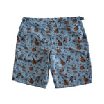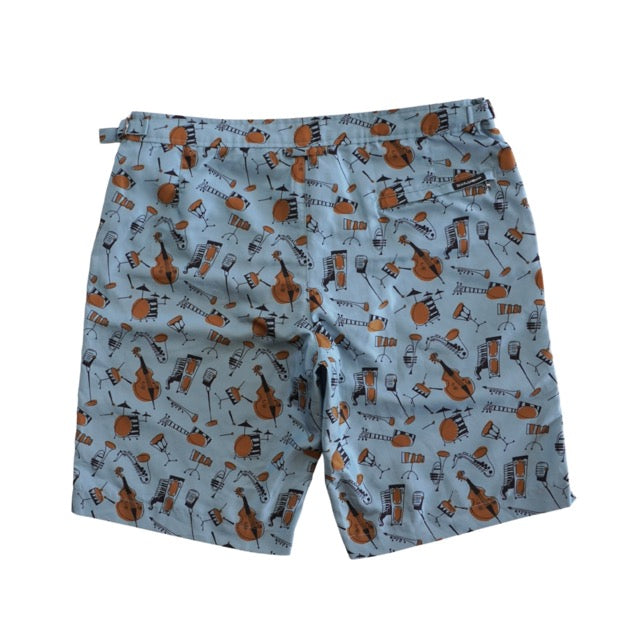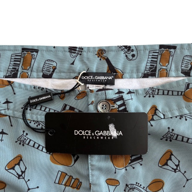 Dolce & Gabbana swim shorts in pale blue with brown and black instrument all-over pattern with button fly, side seam pockets, and back zip pocket. Featuring a thick waistband and side waist adjustor.
