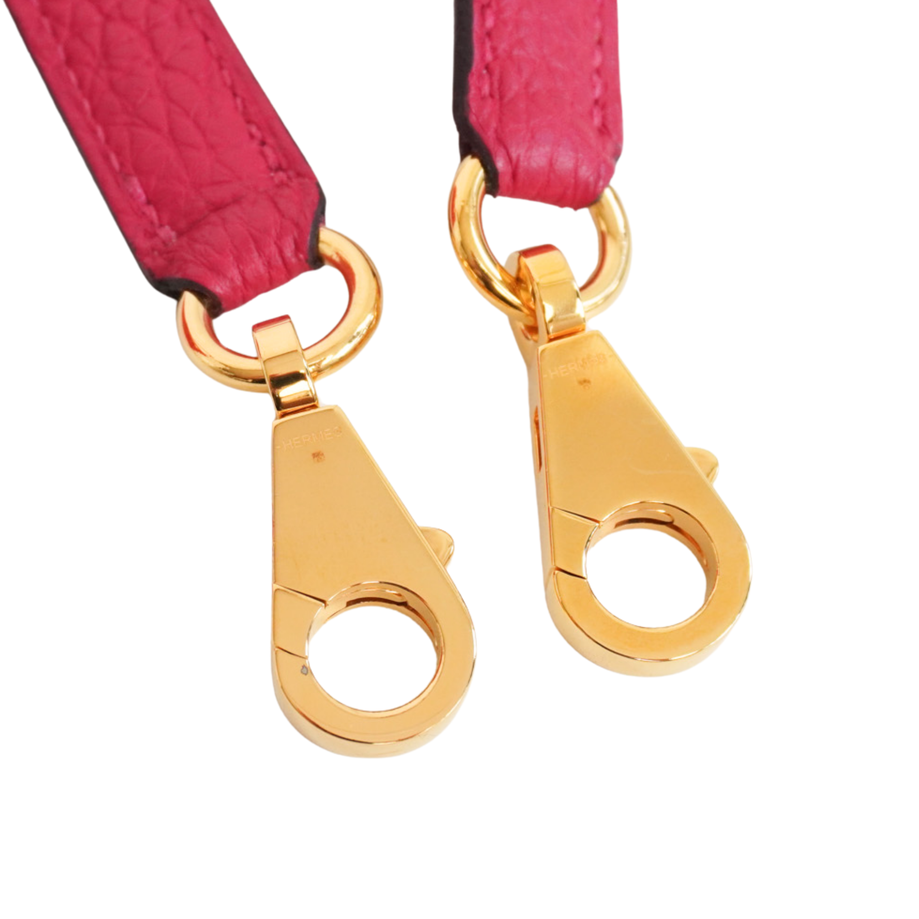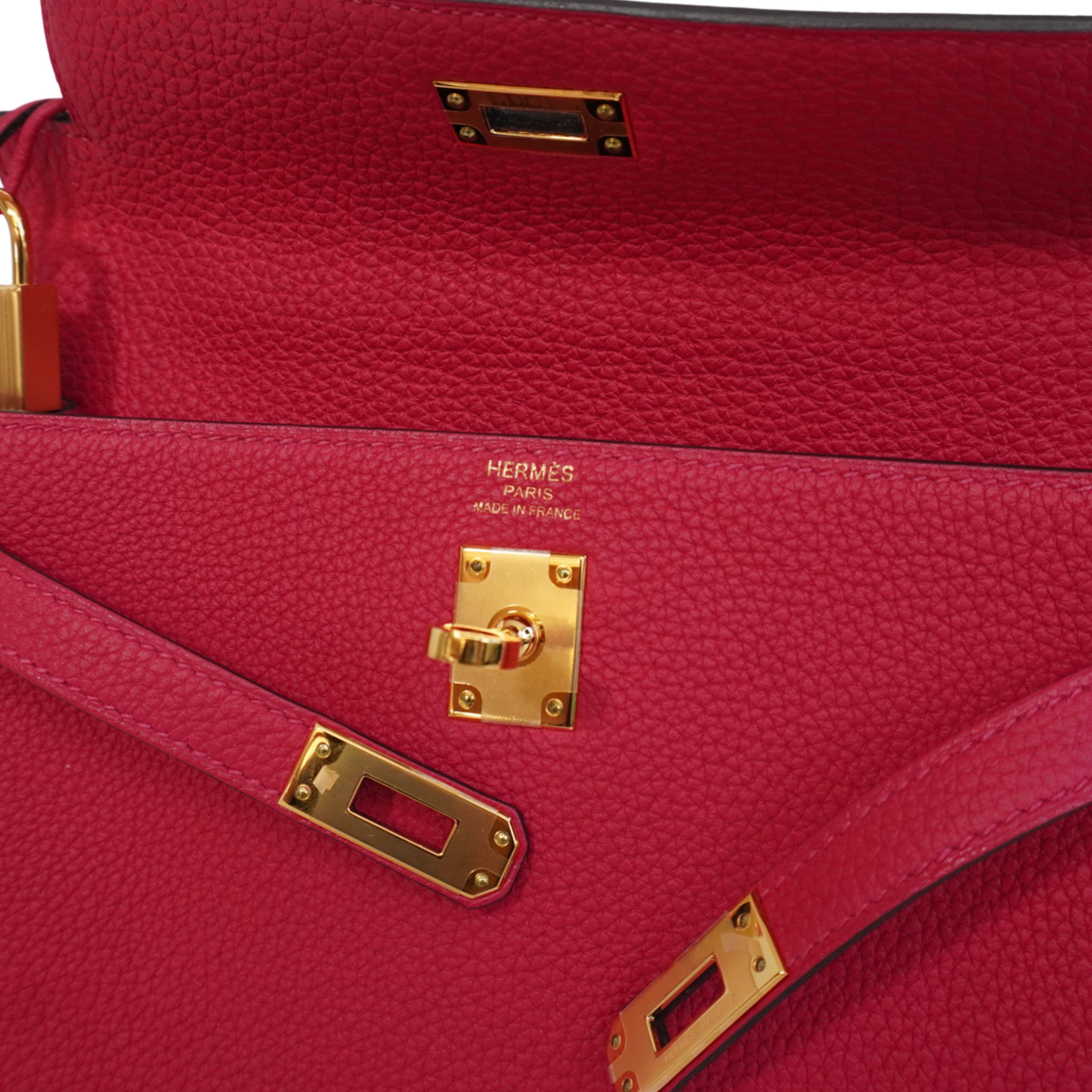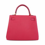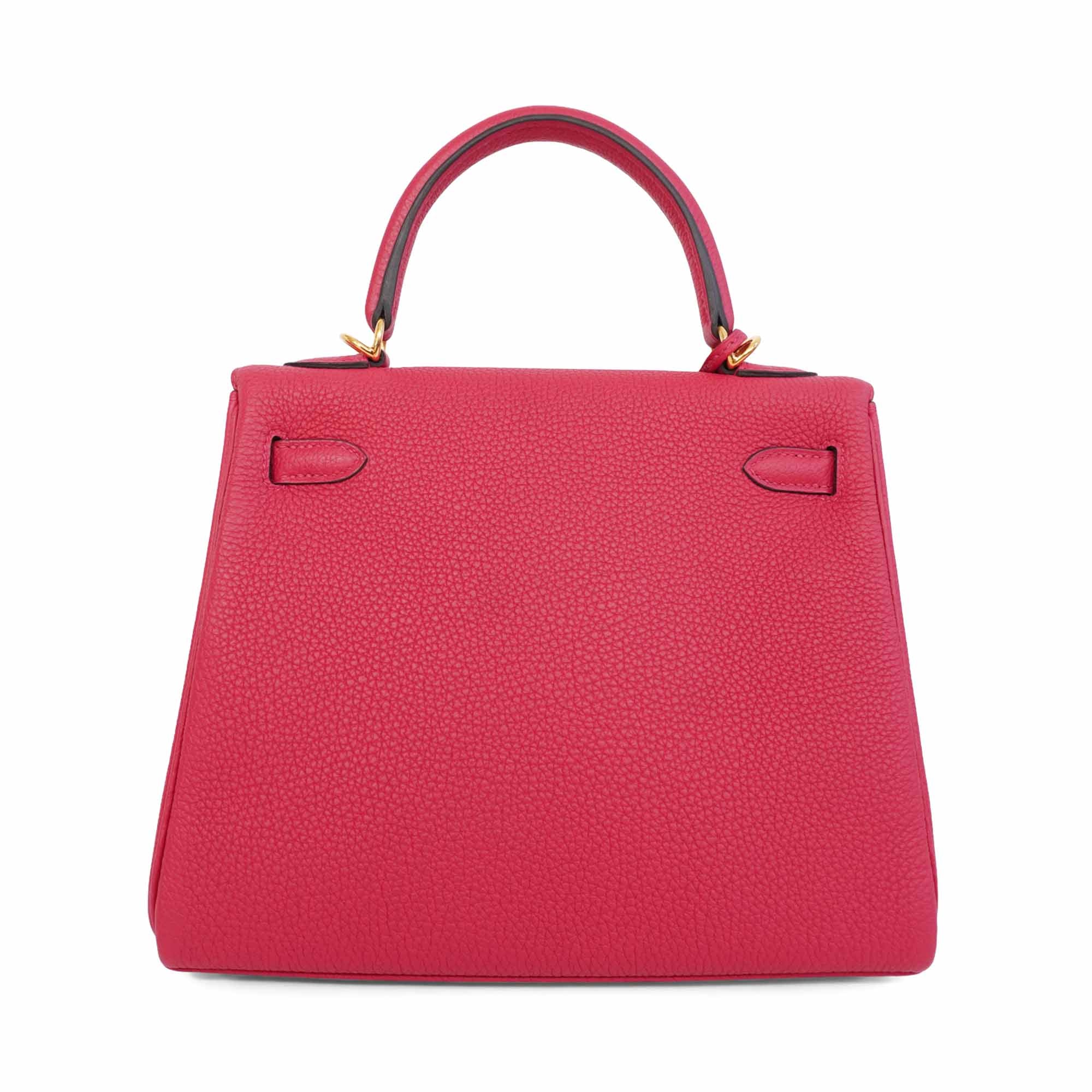 Hermes 'Kelly II Retourne 25' handbag in framboise togo leather with a structured top handle, removable shoulder strap, and gold plated hardware. The bag has a flap closure with sangle straps that fasten with signature 'Kelly' turnlock, opening to reveal a leather lined interior with both a zip and slip pockets.