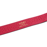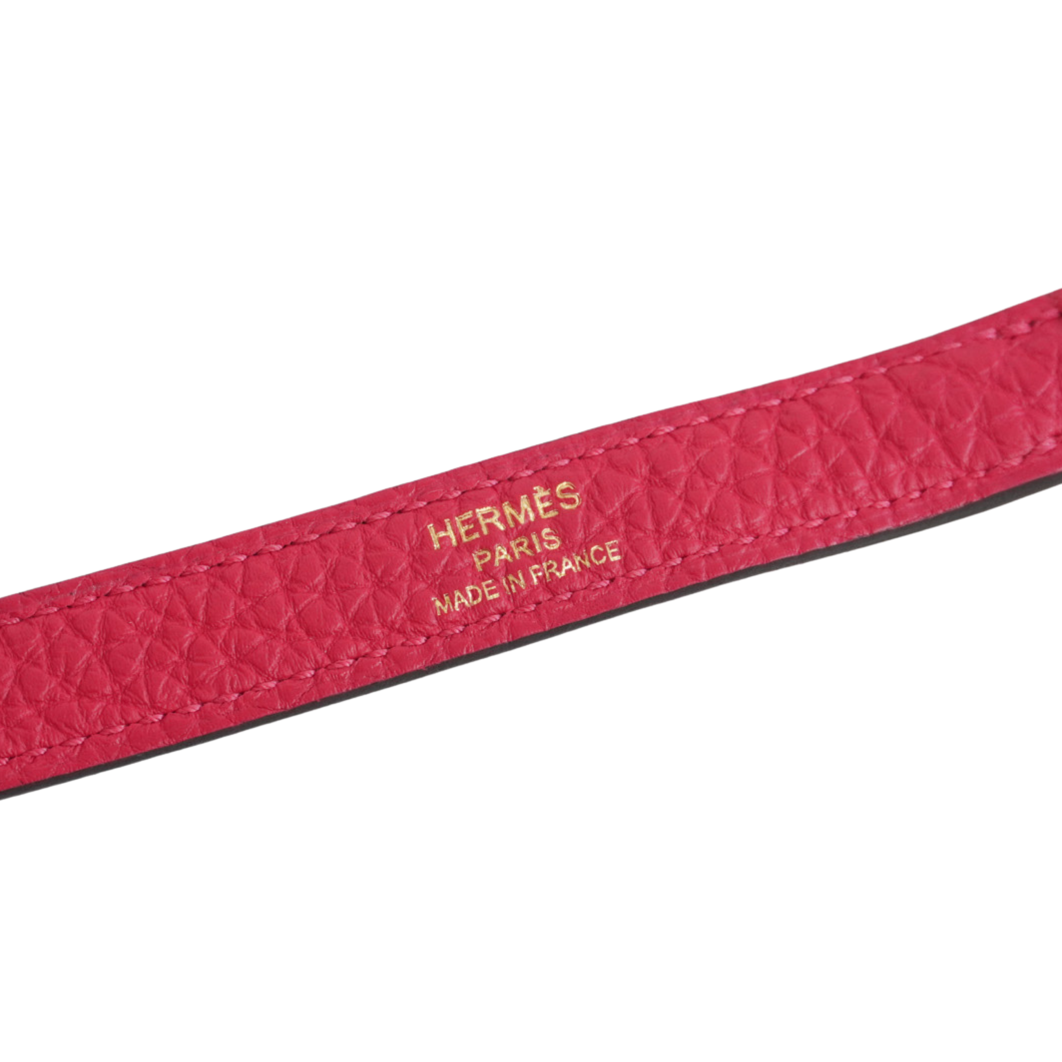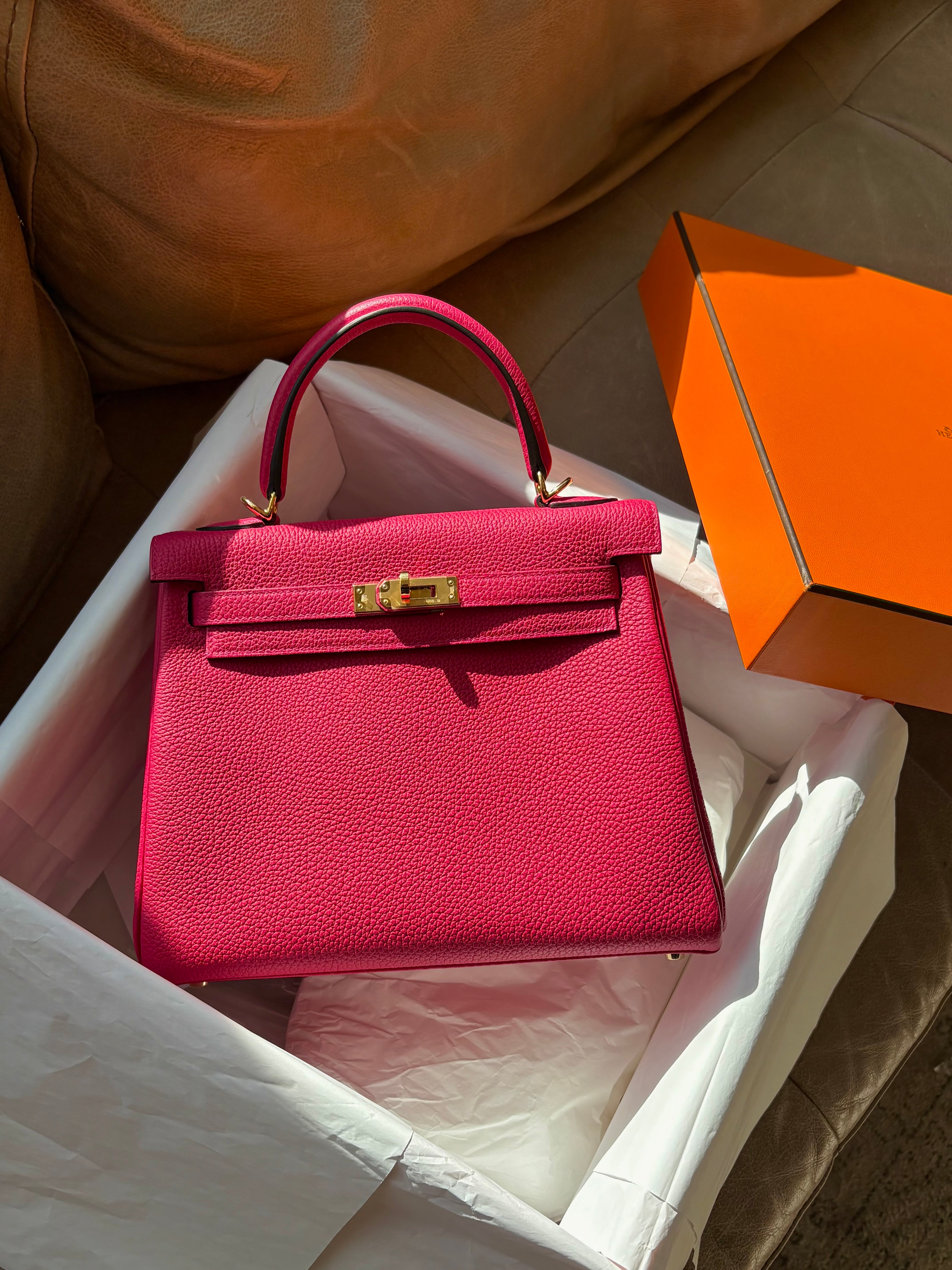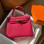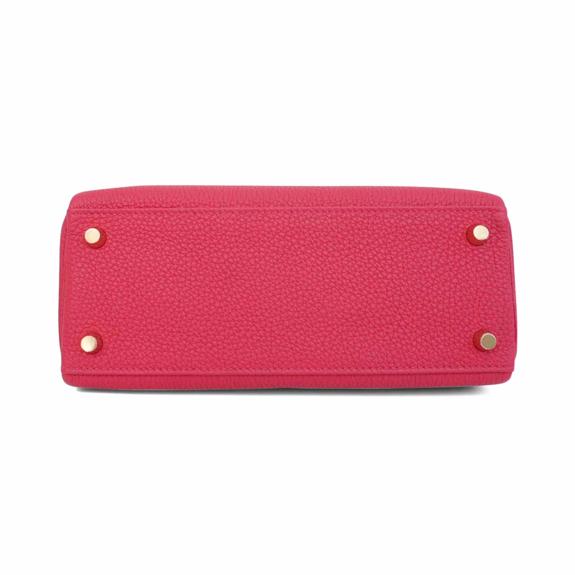 Hermes 'Kelly II Retourne 25' handbag in framboise togo leather with a structured top handle, removable shoulder strap, and gold plated hardware. The bag has a flap closure with sangle straps that fasten with signature 'Kelly' turnlock, opening to reveal a leather lined interior with both a zip and slip pockets.