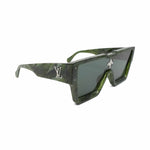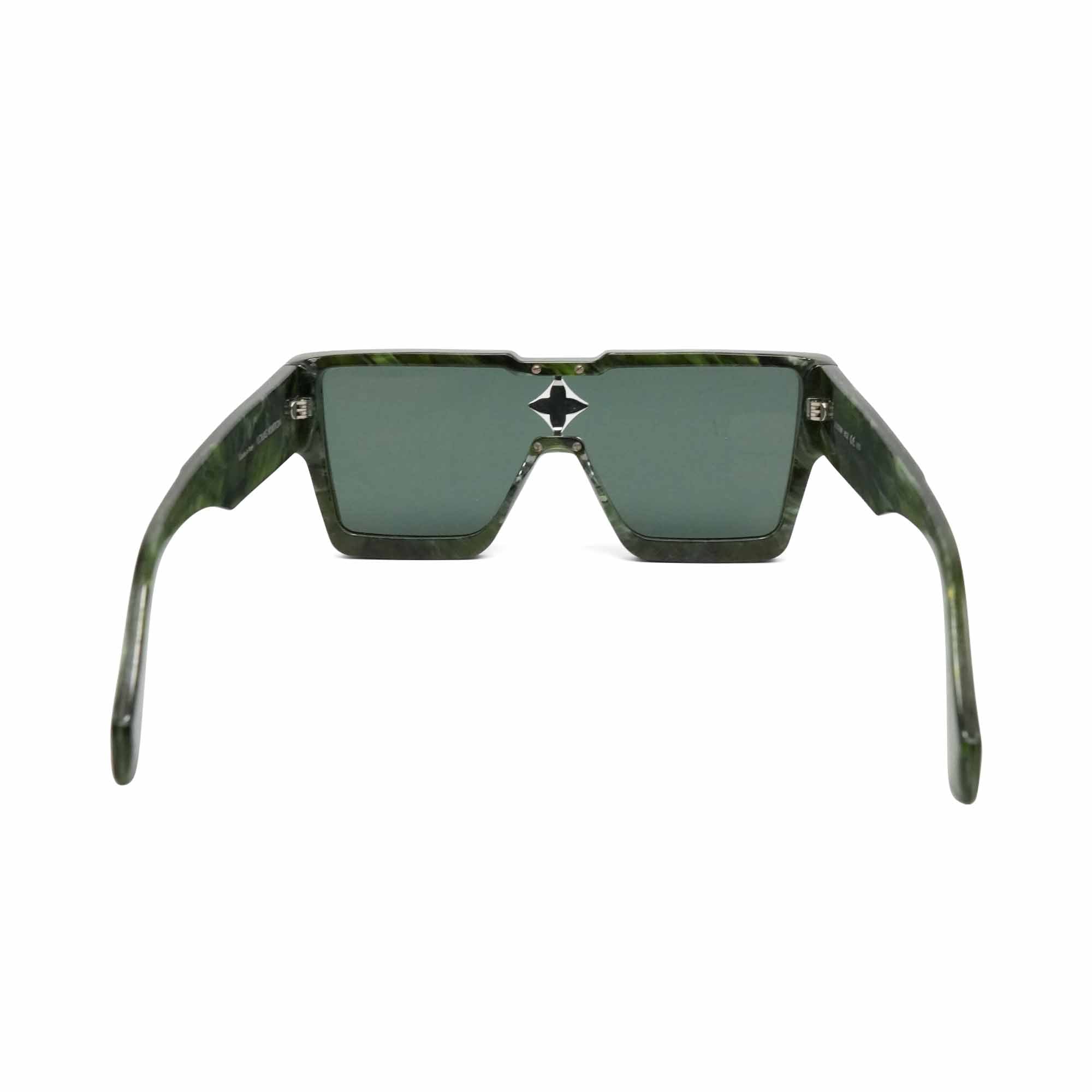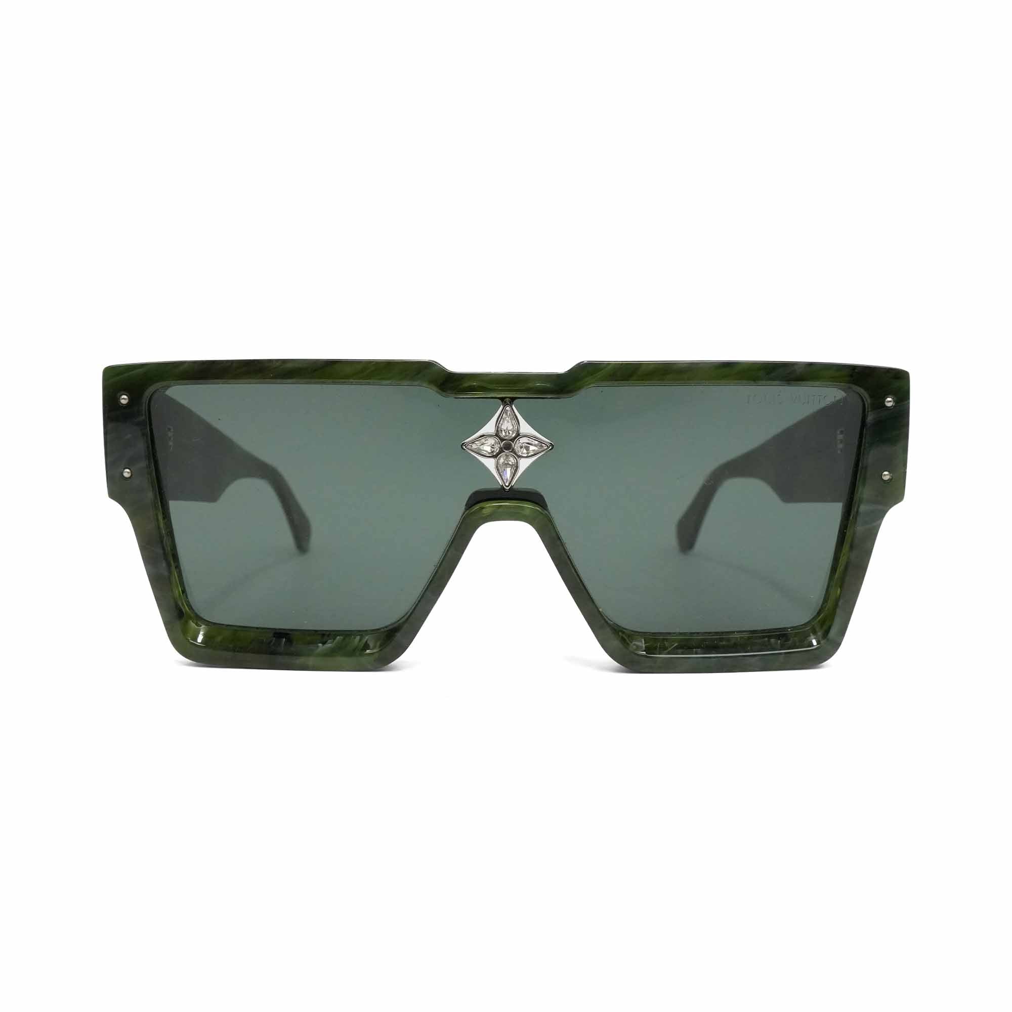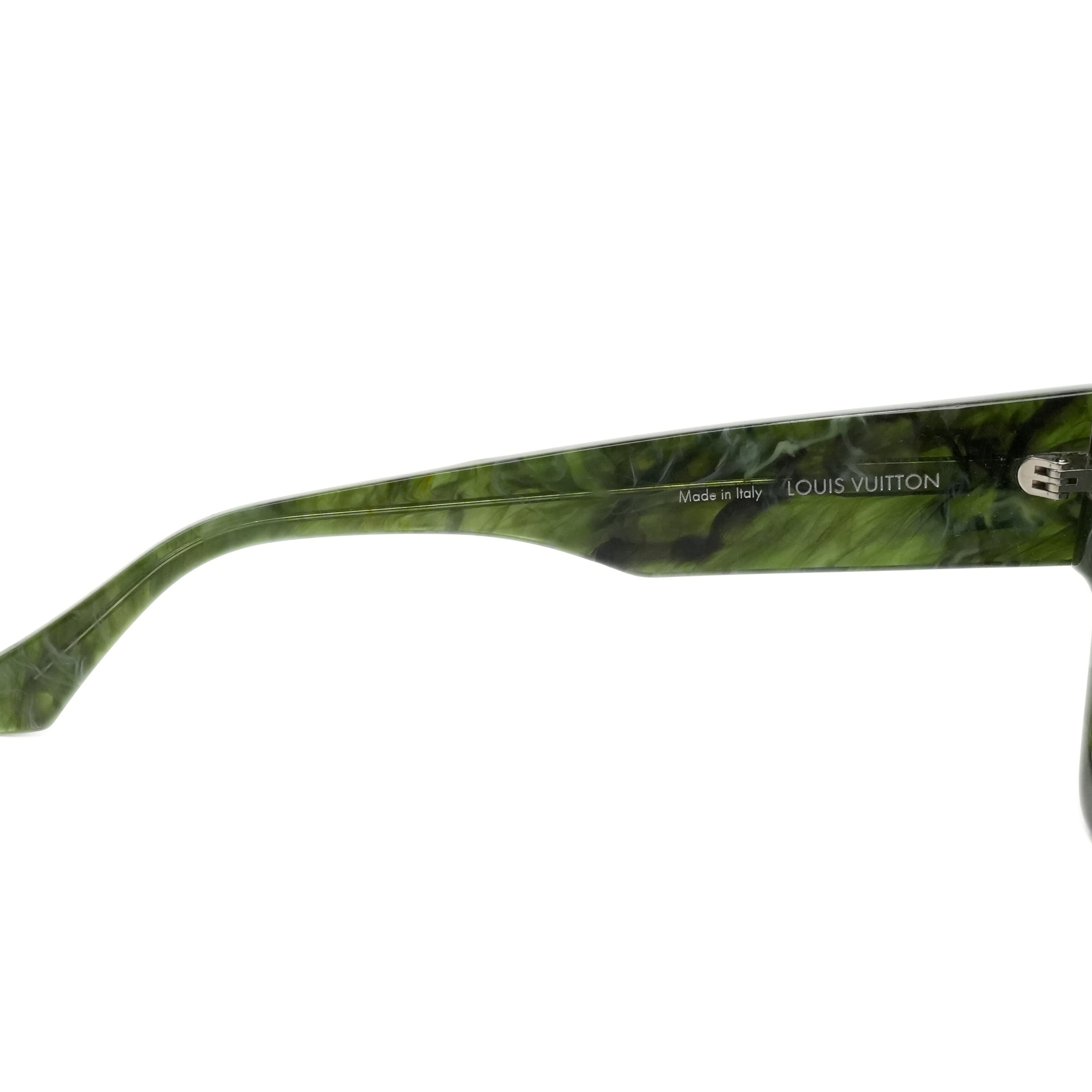 Louis Vuitton 'Cyclone' sunglasses with exaggerated angular marble green acetate frames, a modern take on the iconic 2006 style. Features crystal monogram flower symbol in centre of lens, silver LV logos on arms and small logo etched into lens.