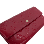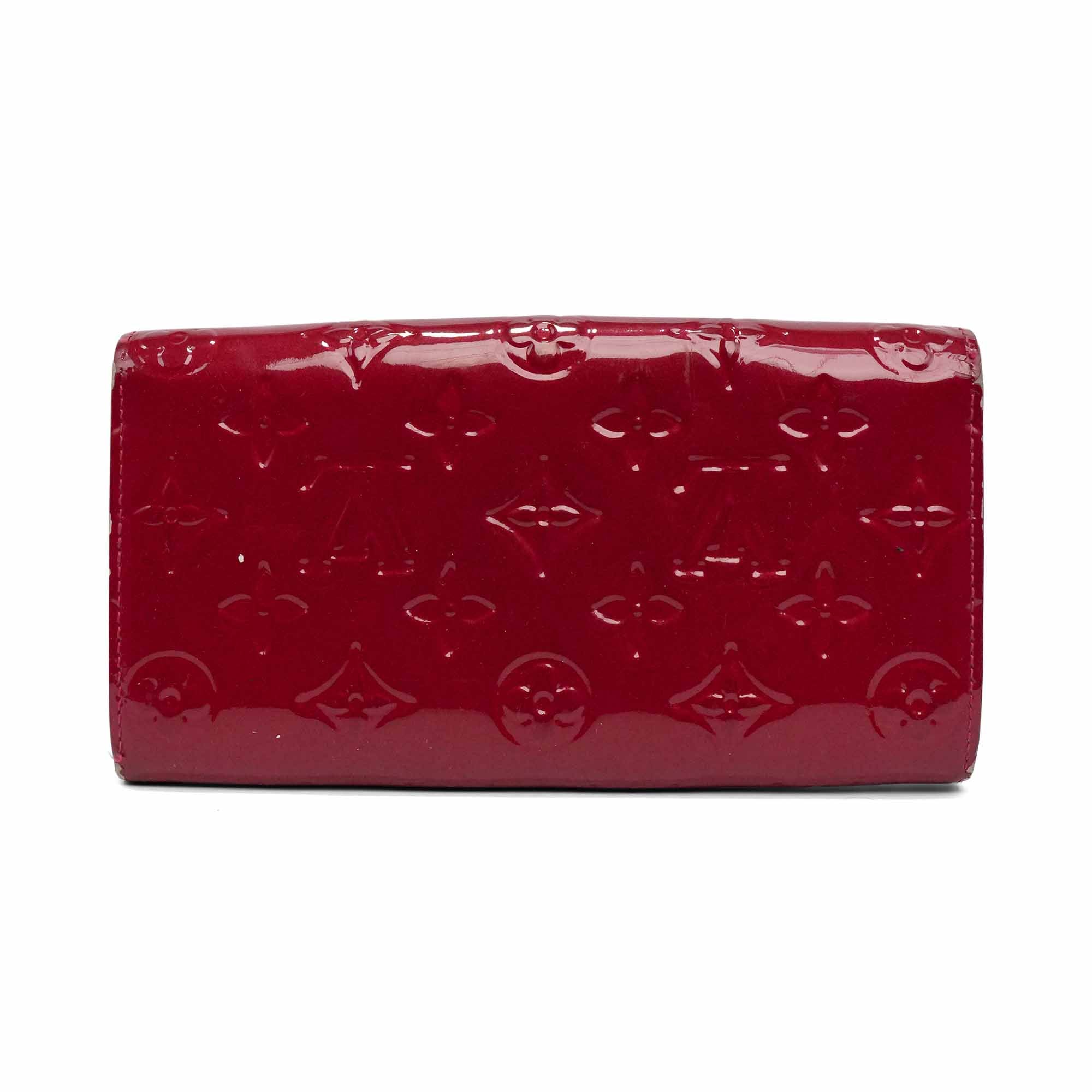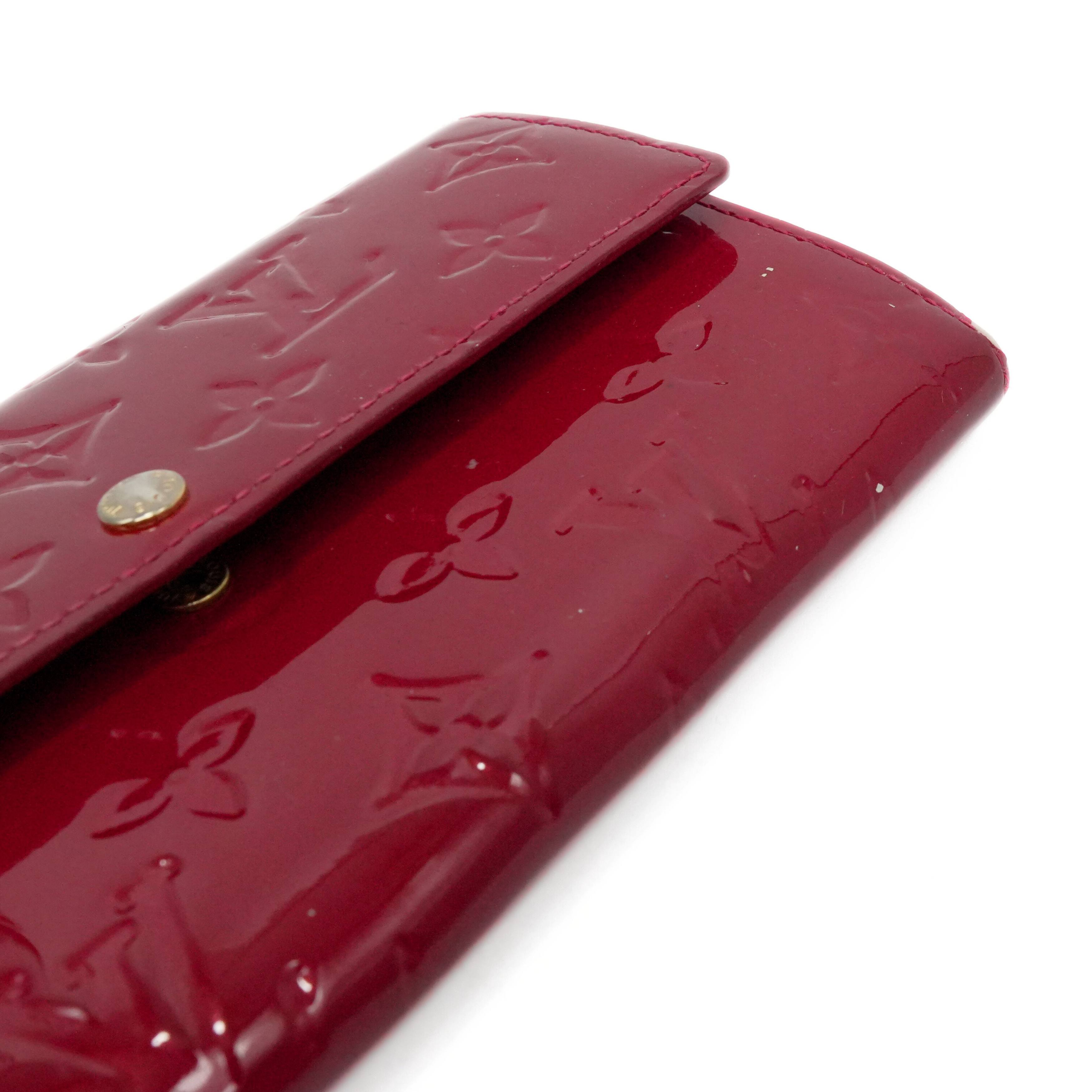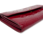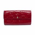 Louis Vuitton 'Sarah' long flap wallet in red monogram vernis leather with gold hardware. Features snap closure on flap, one zipper compartment inside, ten card slots and two cash compartments.