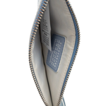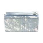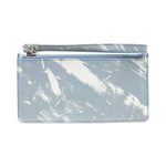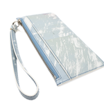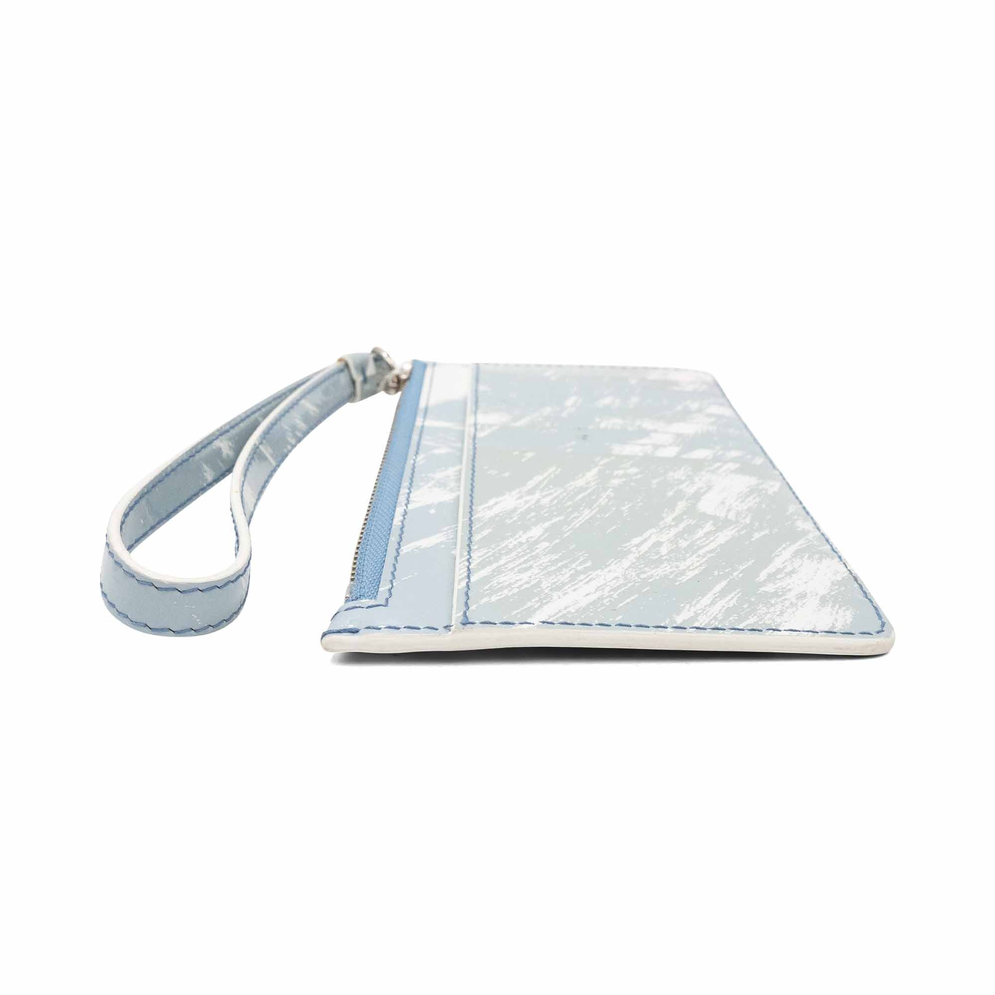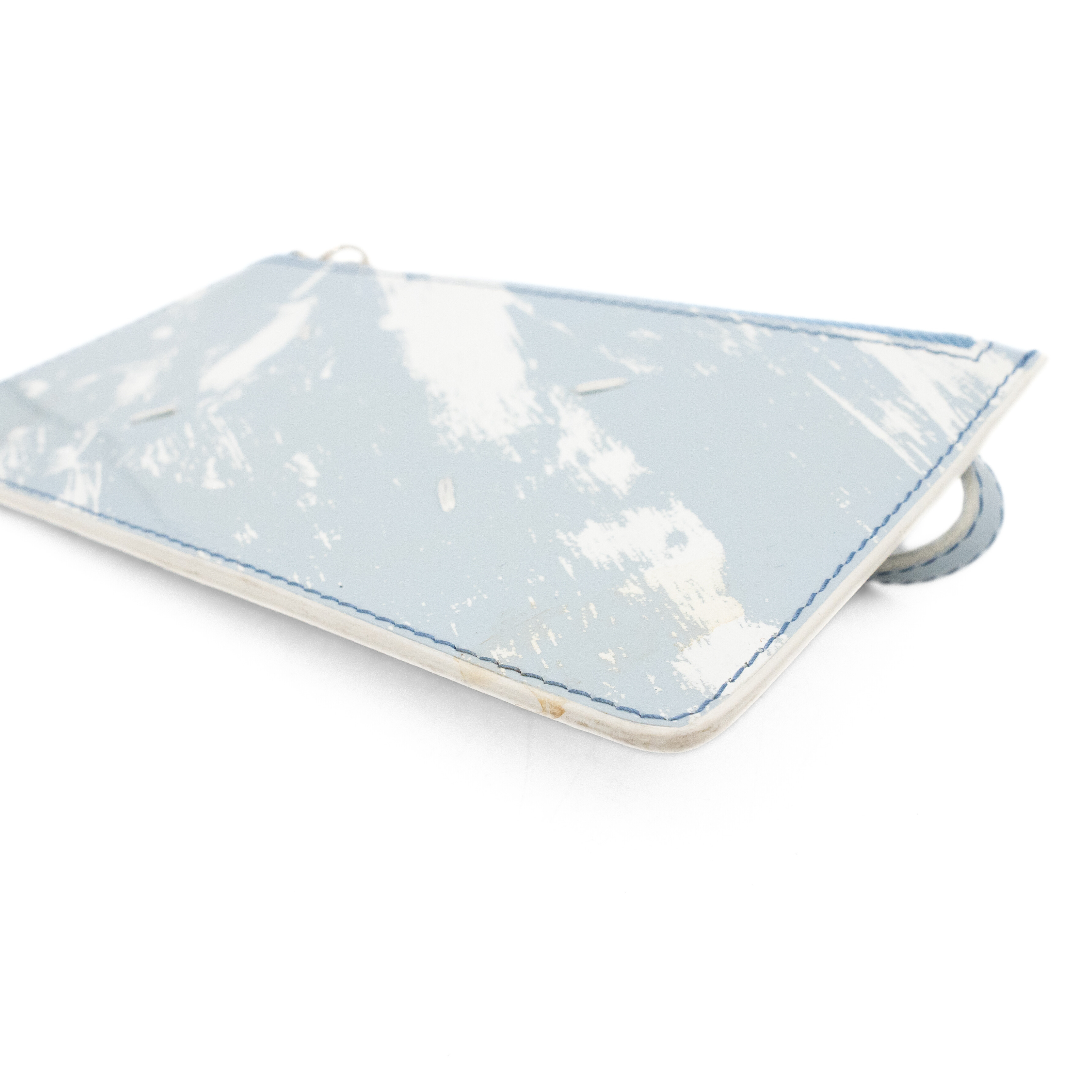 Maison Margiela cardholder wristlet in light blue patent leather with an all-over white paint graphic print, a wristlet strap, card slot pockets, and a cash pocket with a silver zip closure.