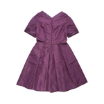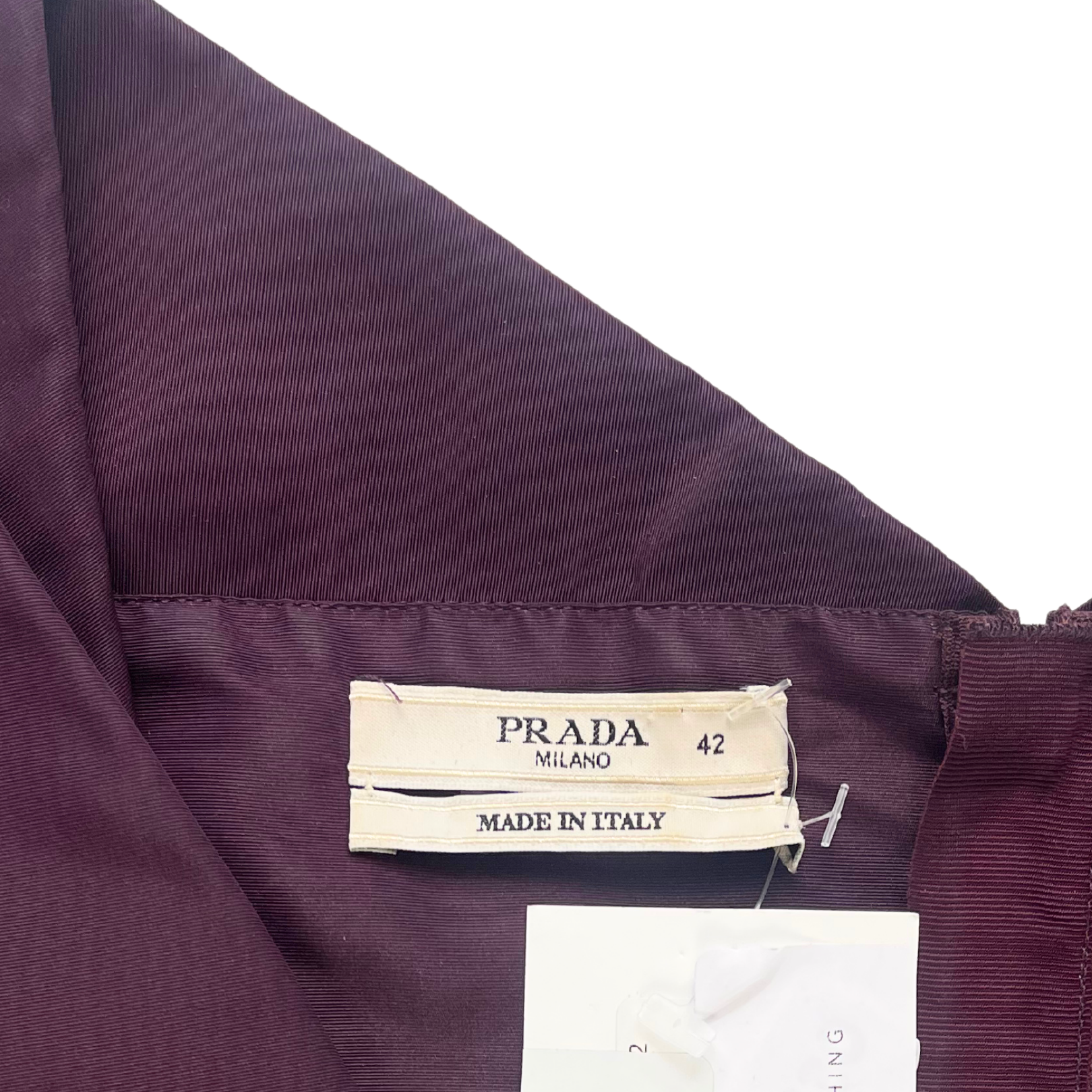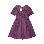 Prada dress in deep purple nylon with a layered neckline, short sleeves, and a flare skirt with pleating details.