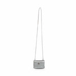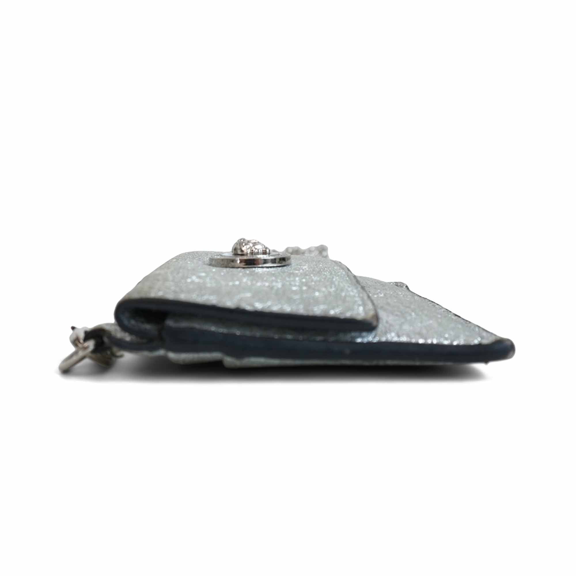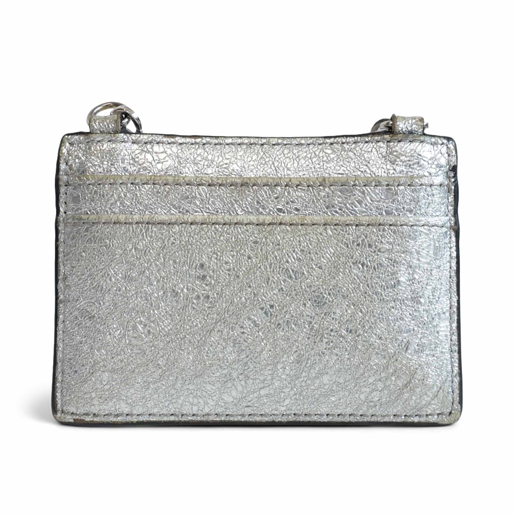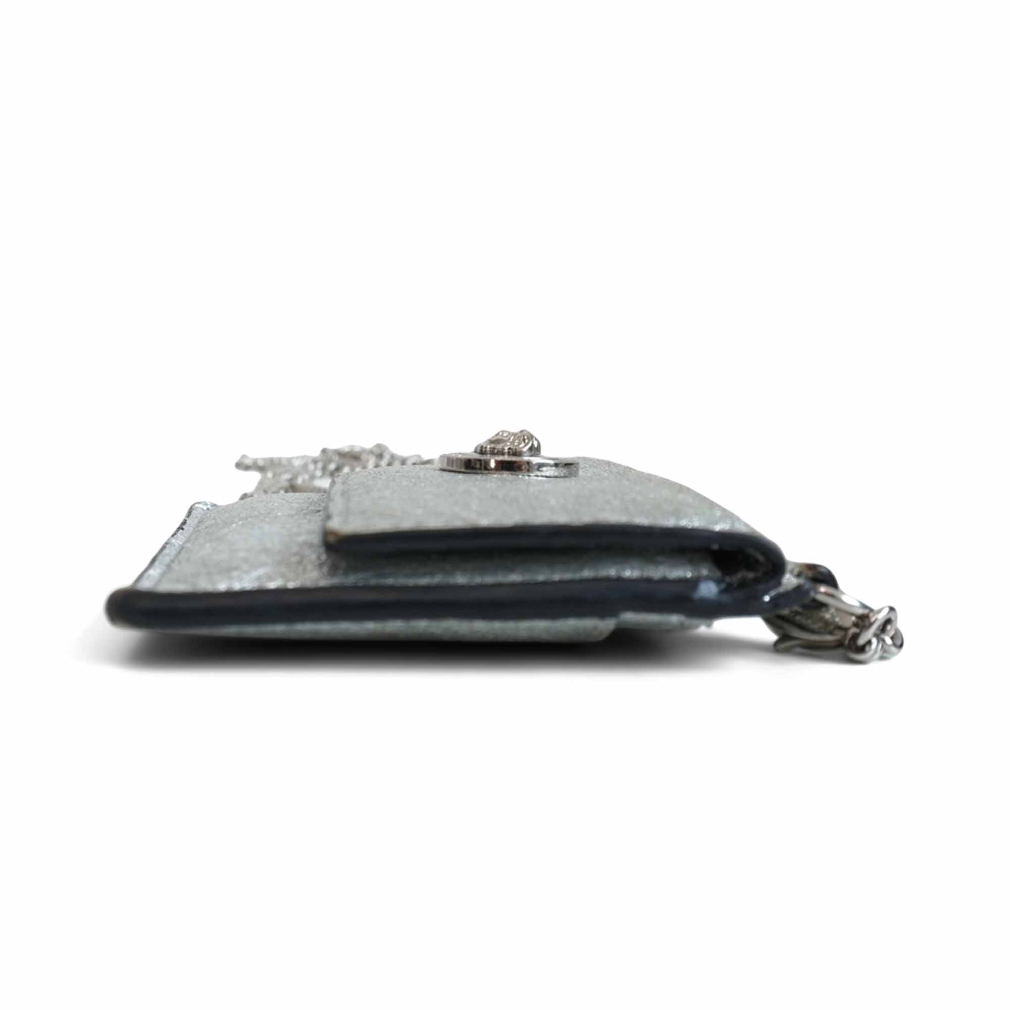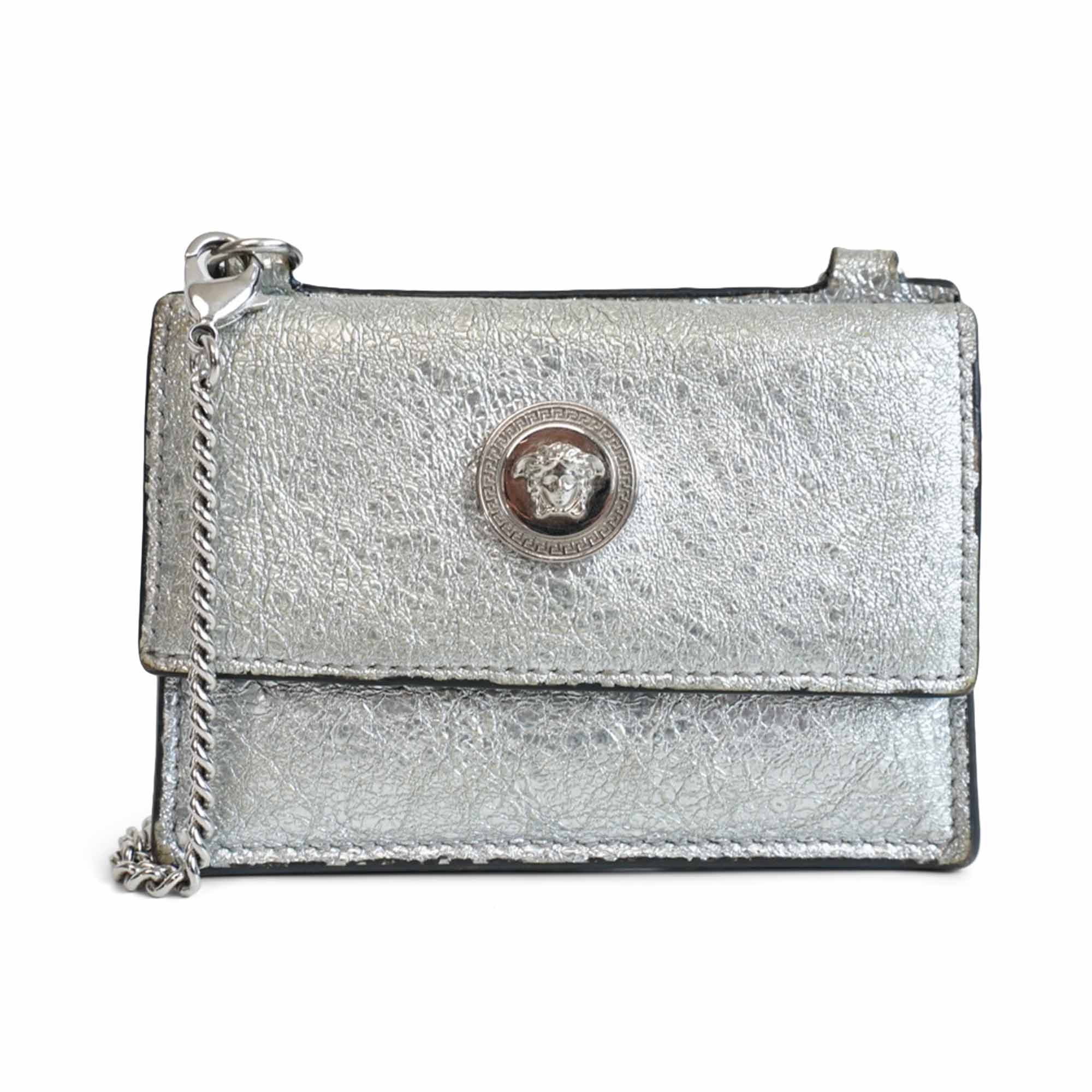Versace cardholder in silver metallic leather with a medusa head emblem in silver metal hardware, a flap pocket on the front, and card slots at the back. The wallet includes a removable silver chain strap.