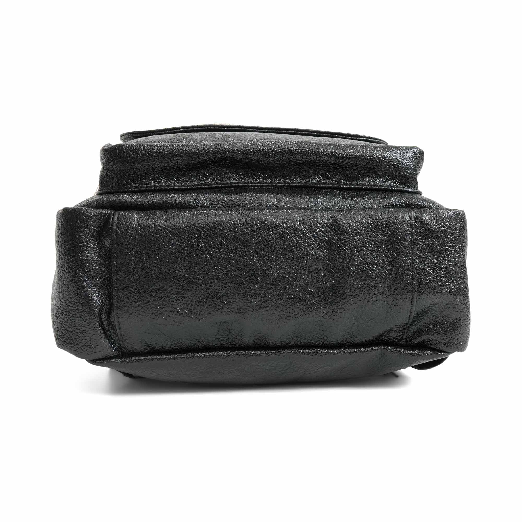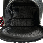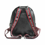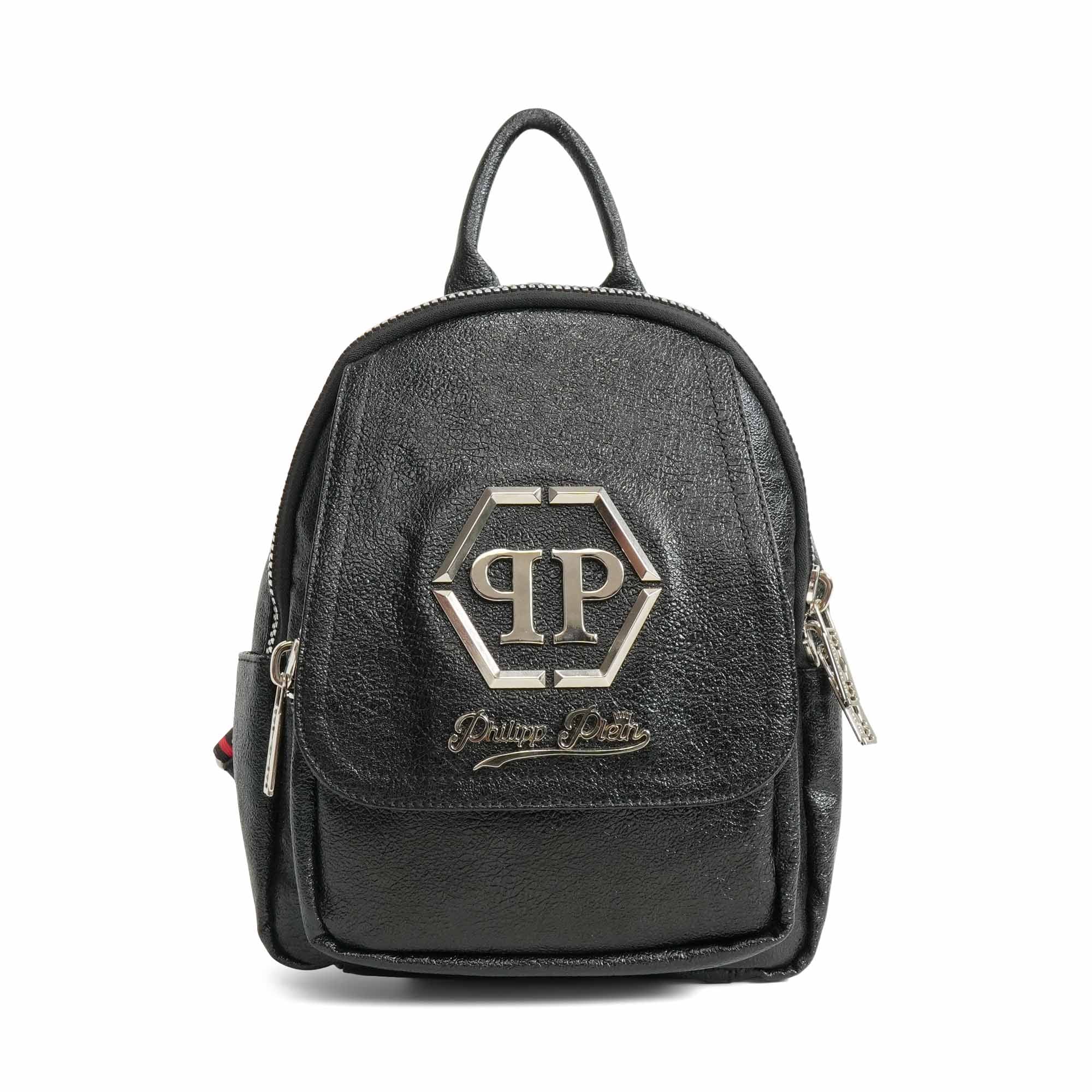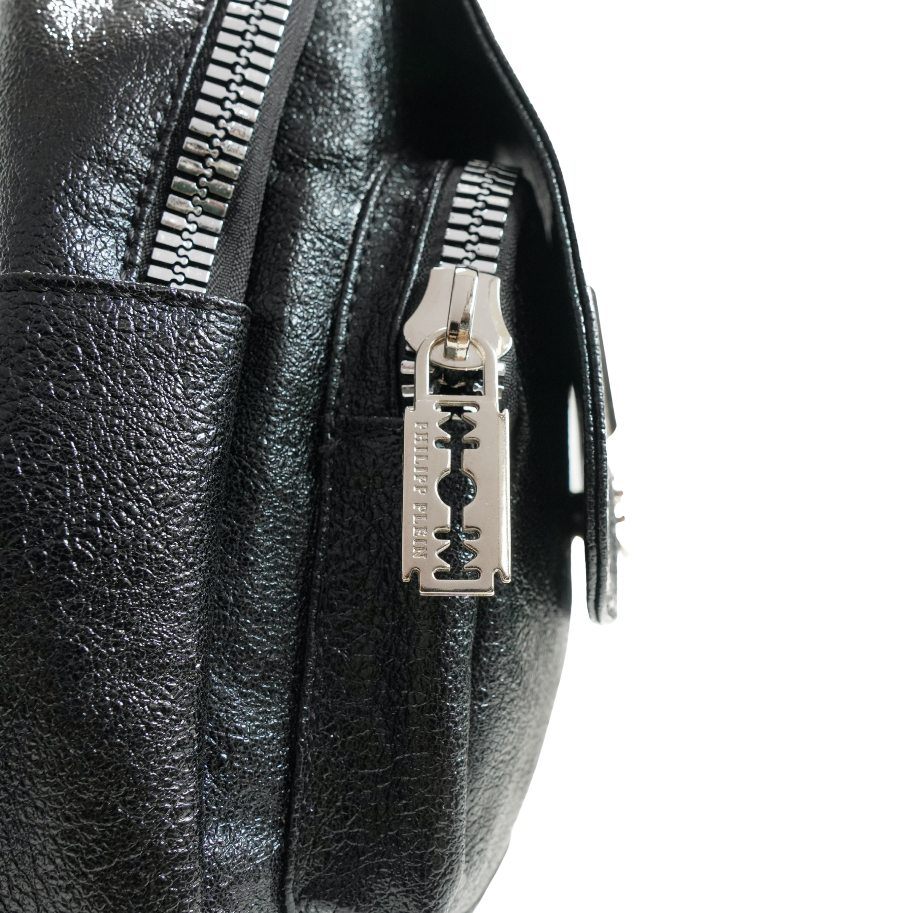 Philipp Plein backpack in black textured patent leather with red and black monogram canvas straps, a large silver logo plaque on the front, and a zip pocket. The bag has a zip opening in silver hardware to the main compartment which is lined with a monogram nylon and has a zip pocket.