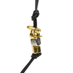 Loewe bag charm in black leather with a gold bunny and 'J' charm and a silver logo embossed charm between.