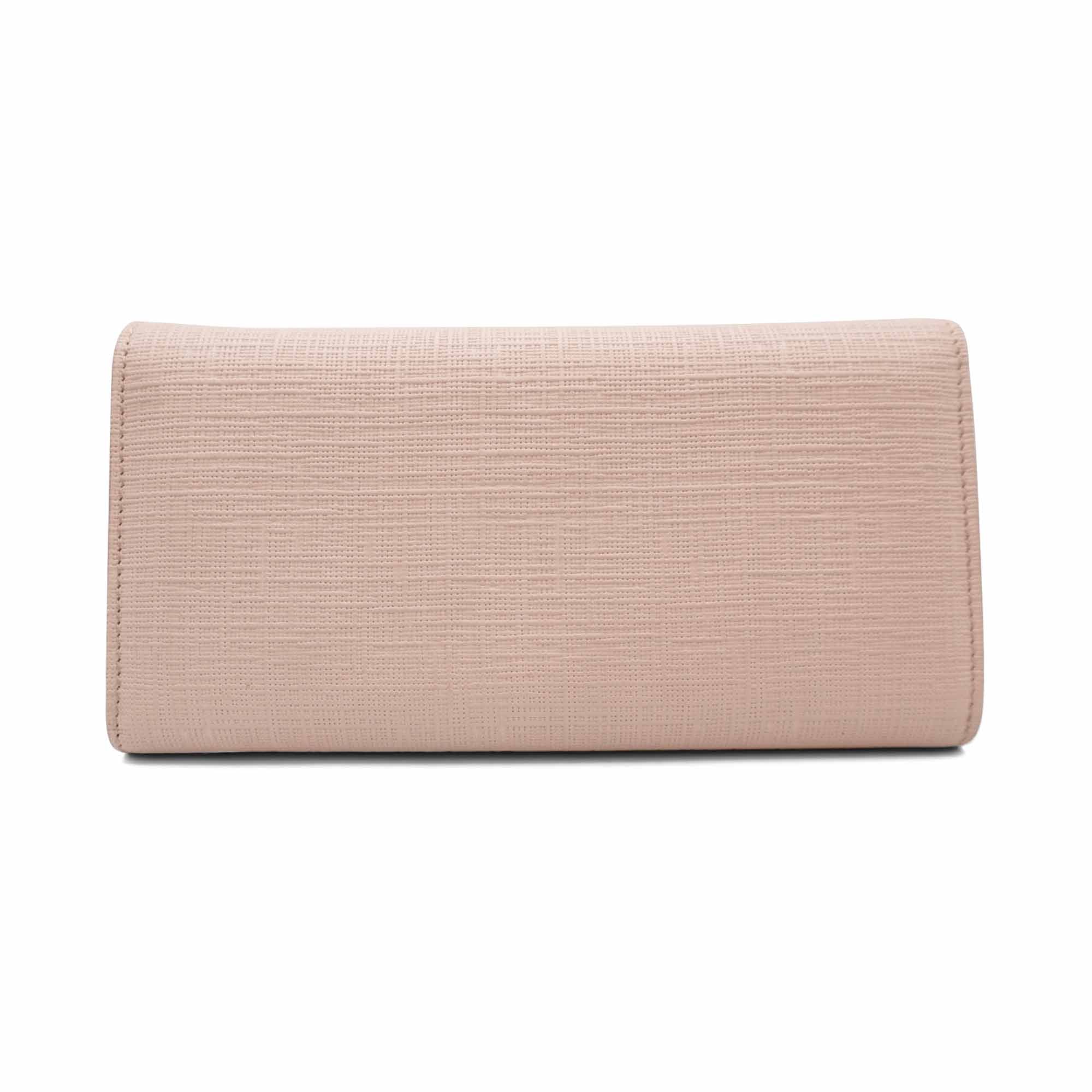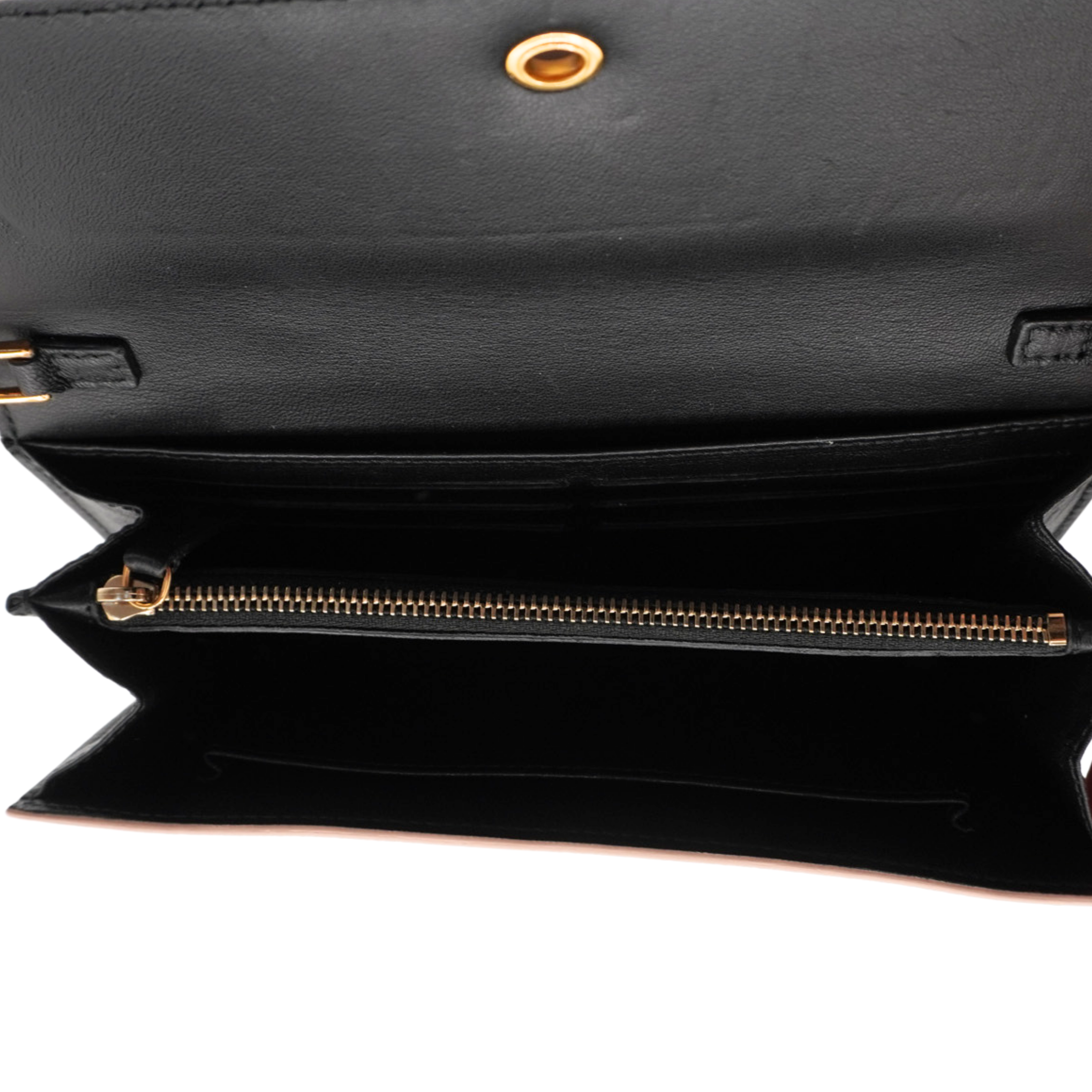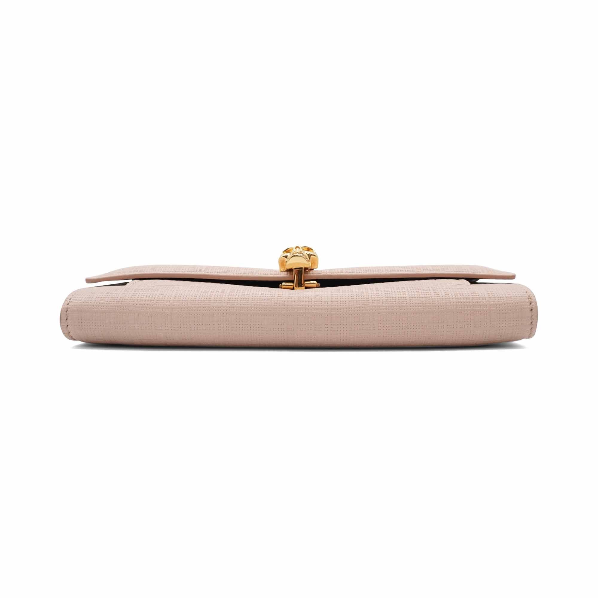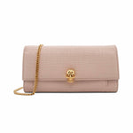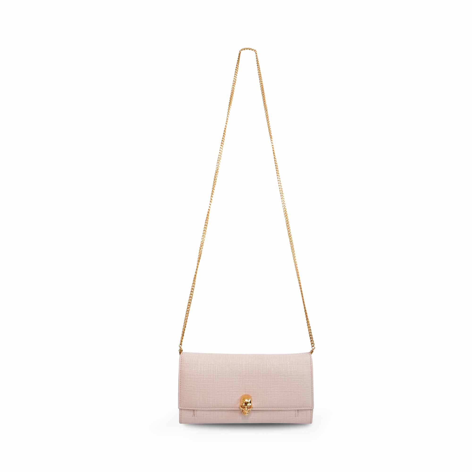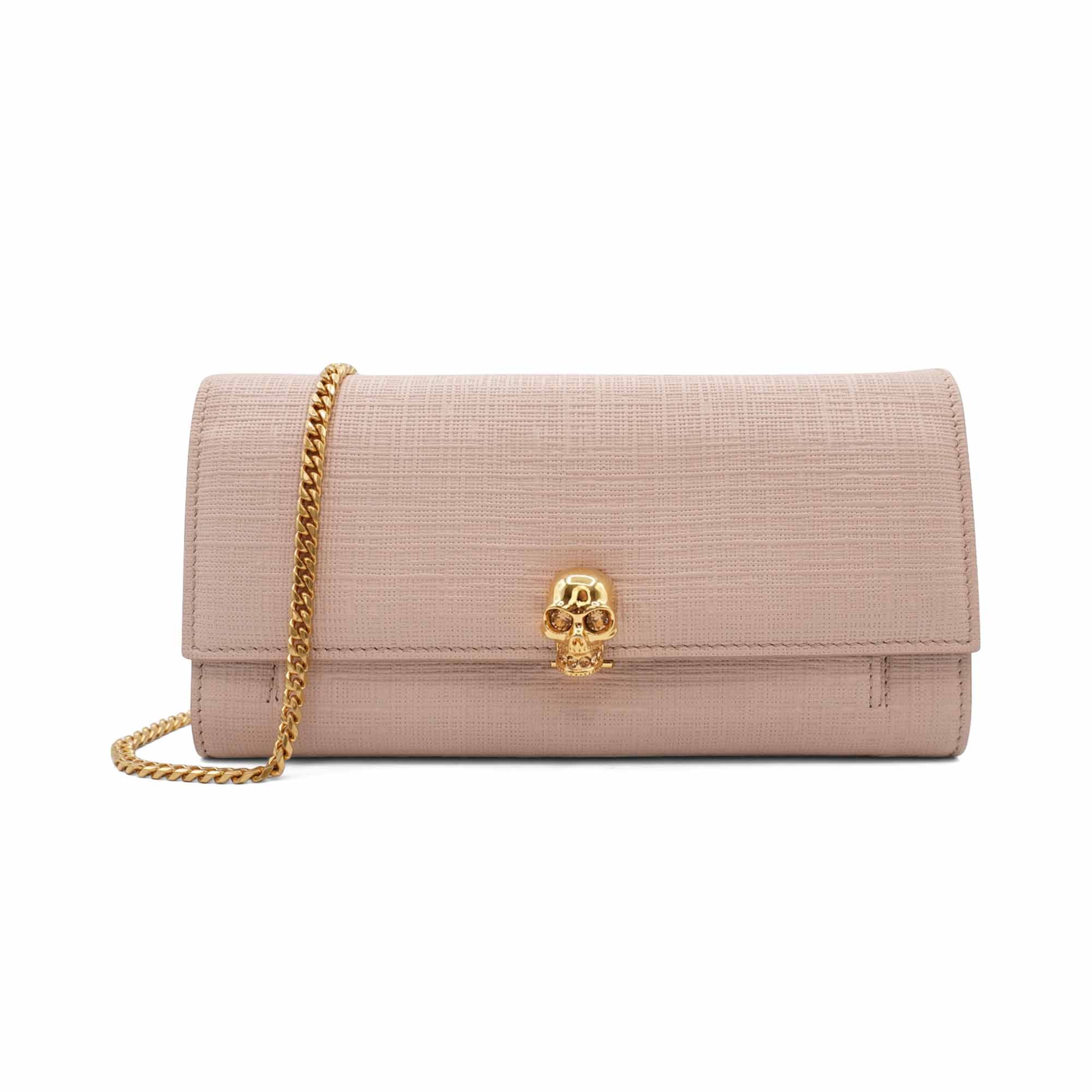 Alexander McQueen 'Skull' wallet on chain in light pink textured leather with a gold and crystal skull clasp closure. Features a black leather lining with 6 card slots, 3 slip pockets, and a zip pocket. The chain strap can be removed allowing it to be carried as a clutch or wallet.