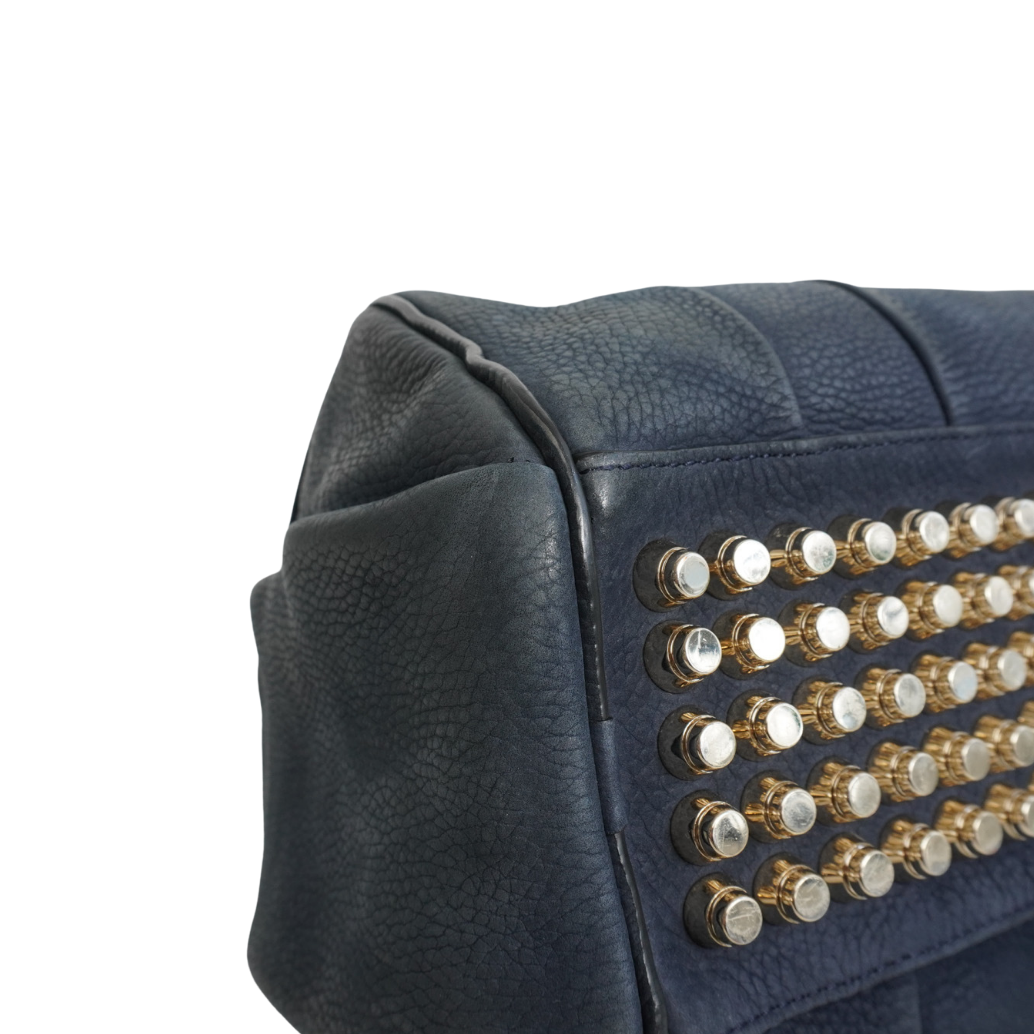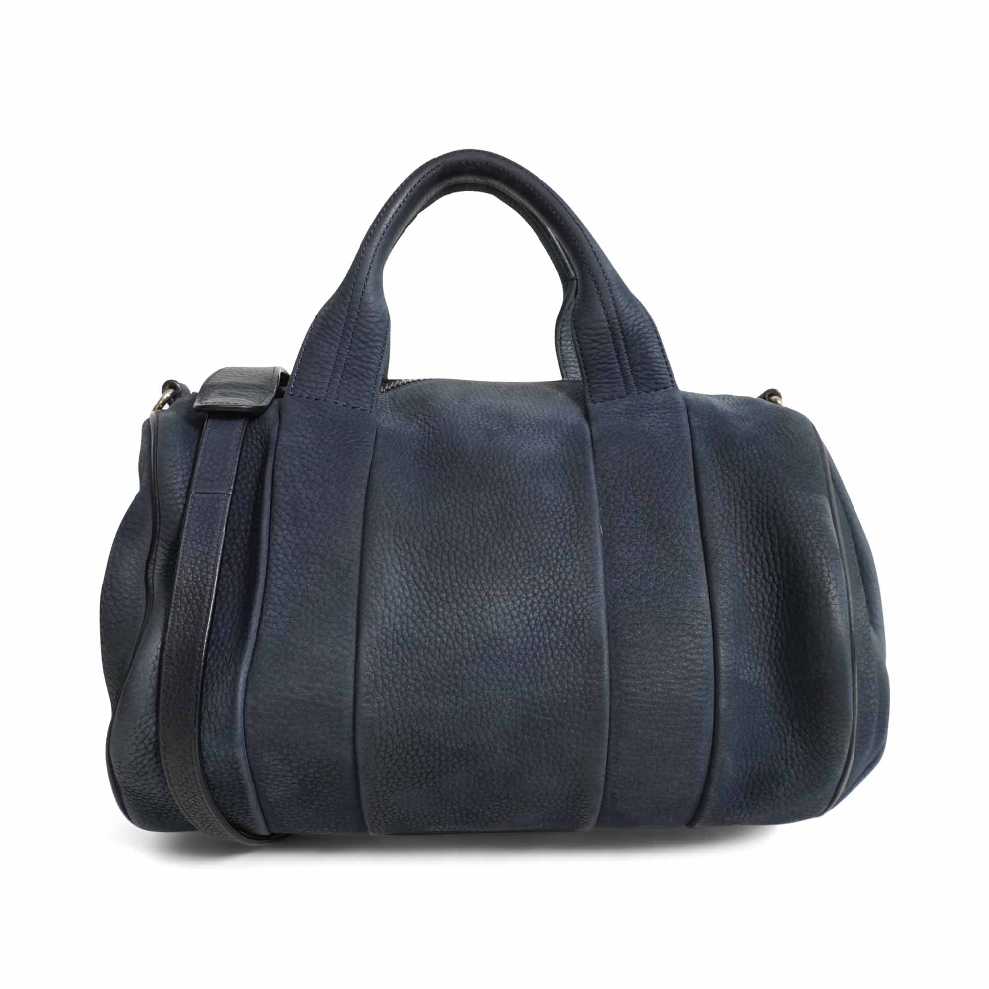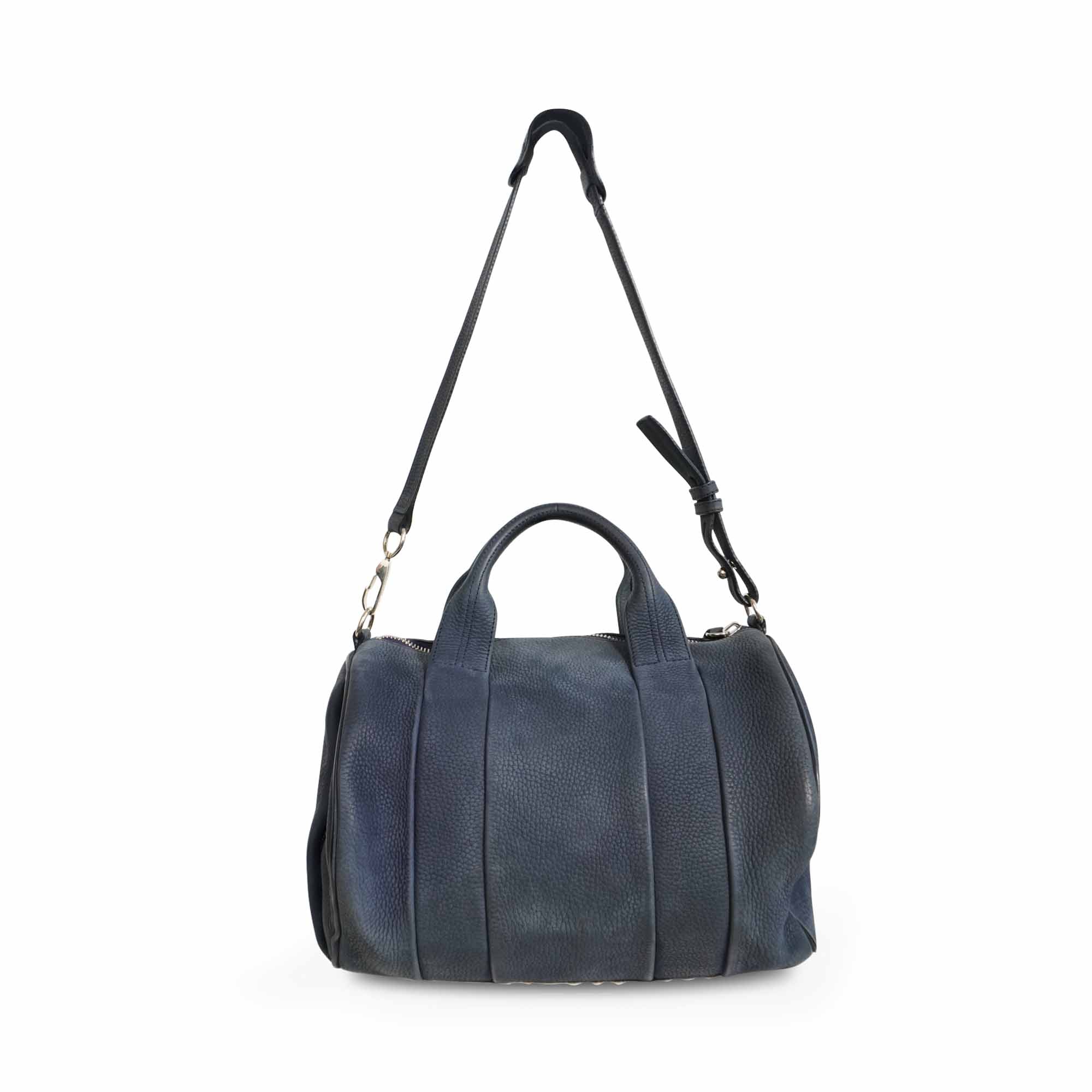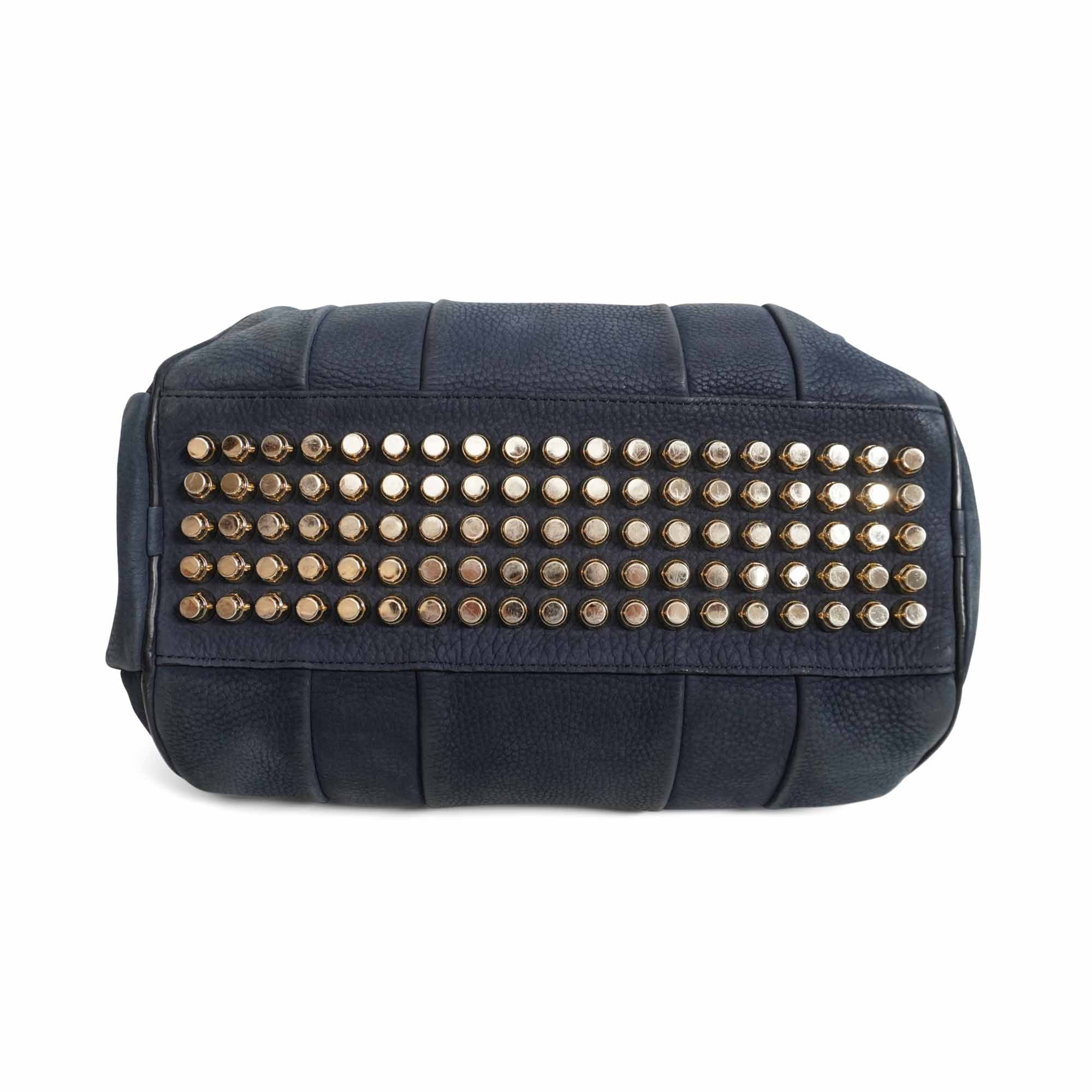 Alexander Wang 'Rocco' bag in dark navy nubuck leather with signature studded base and soft gold hardware. Features top handles and a removable shoulder strap, a main zip pocket, and hidden zip pocket on one side.