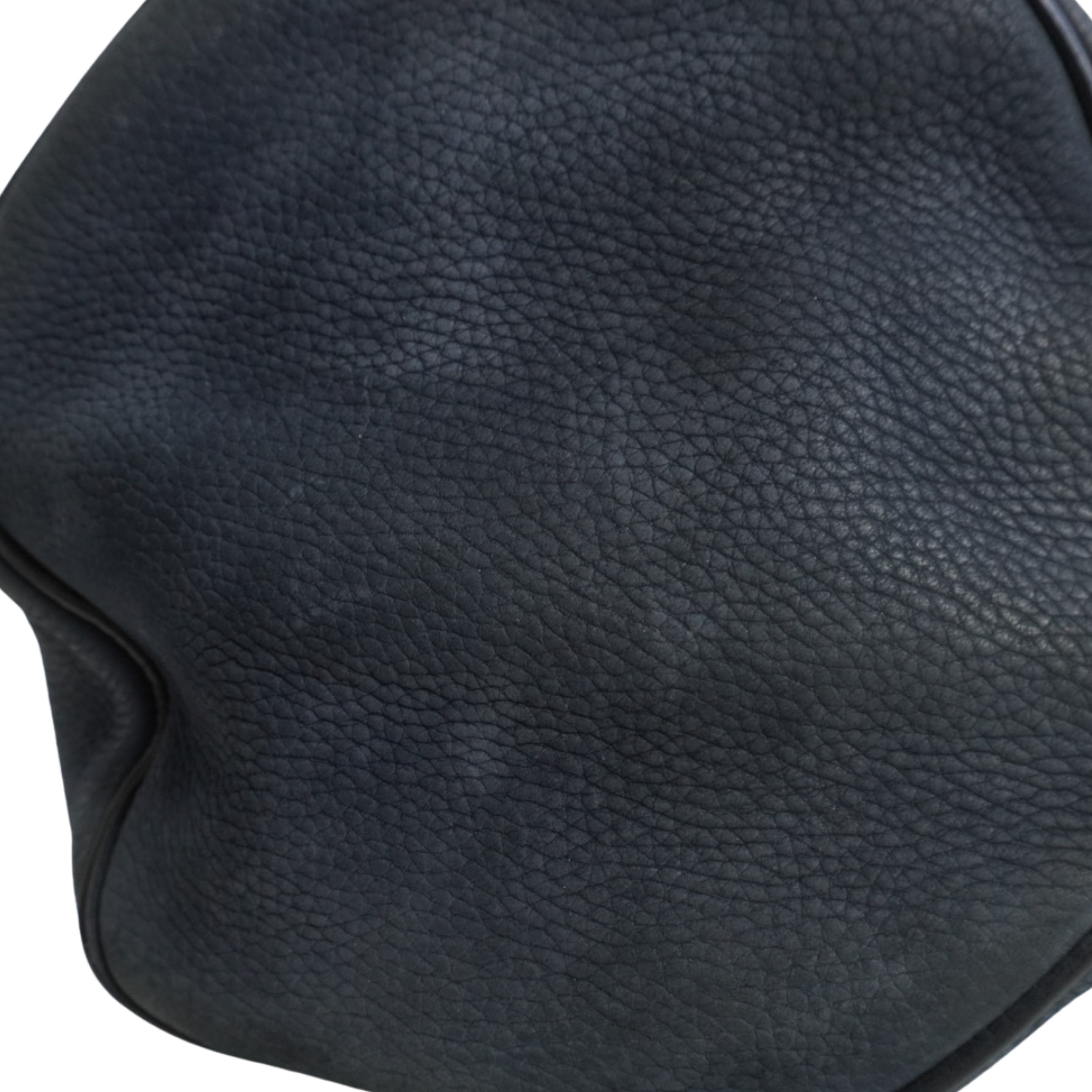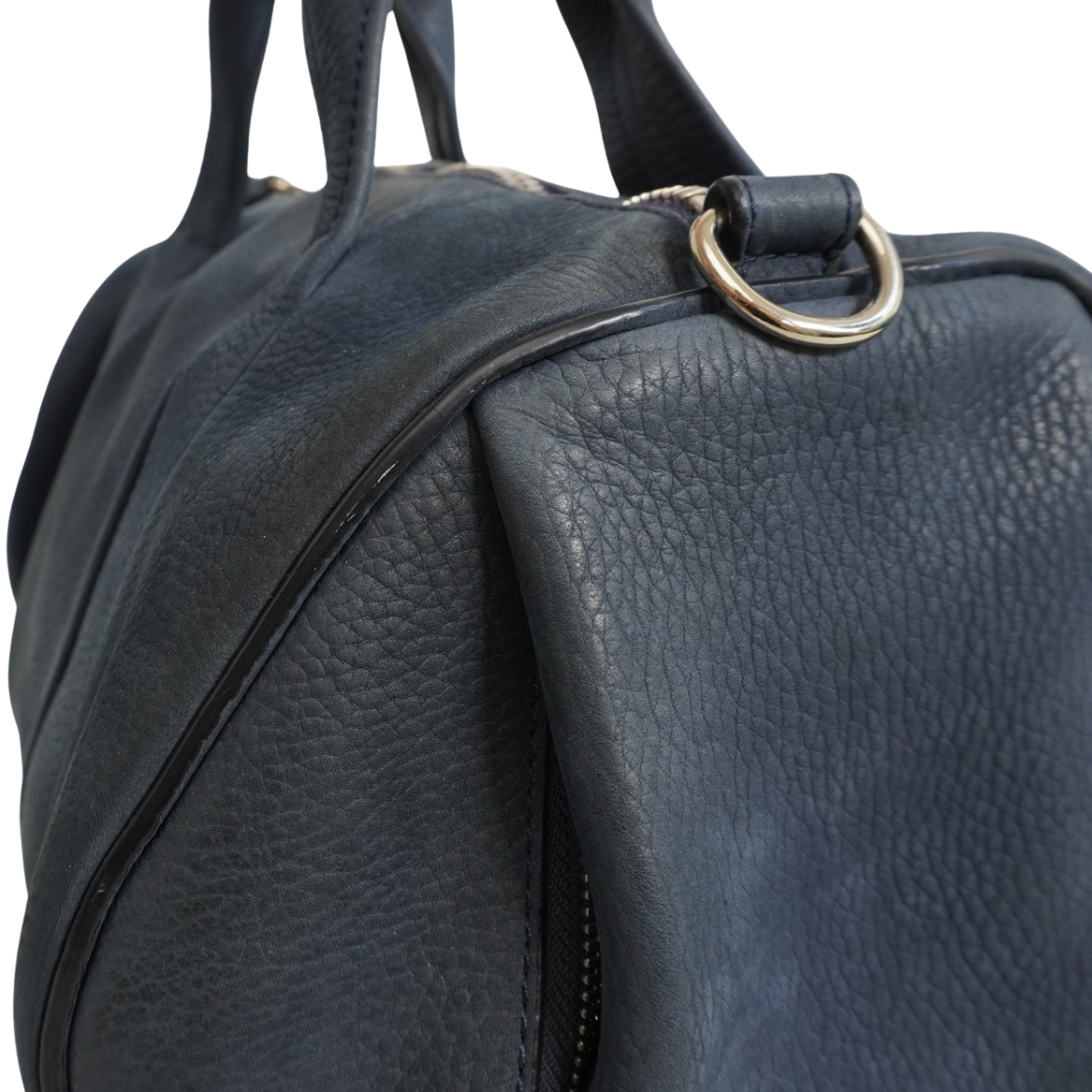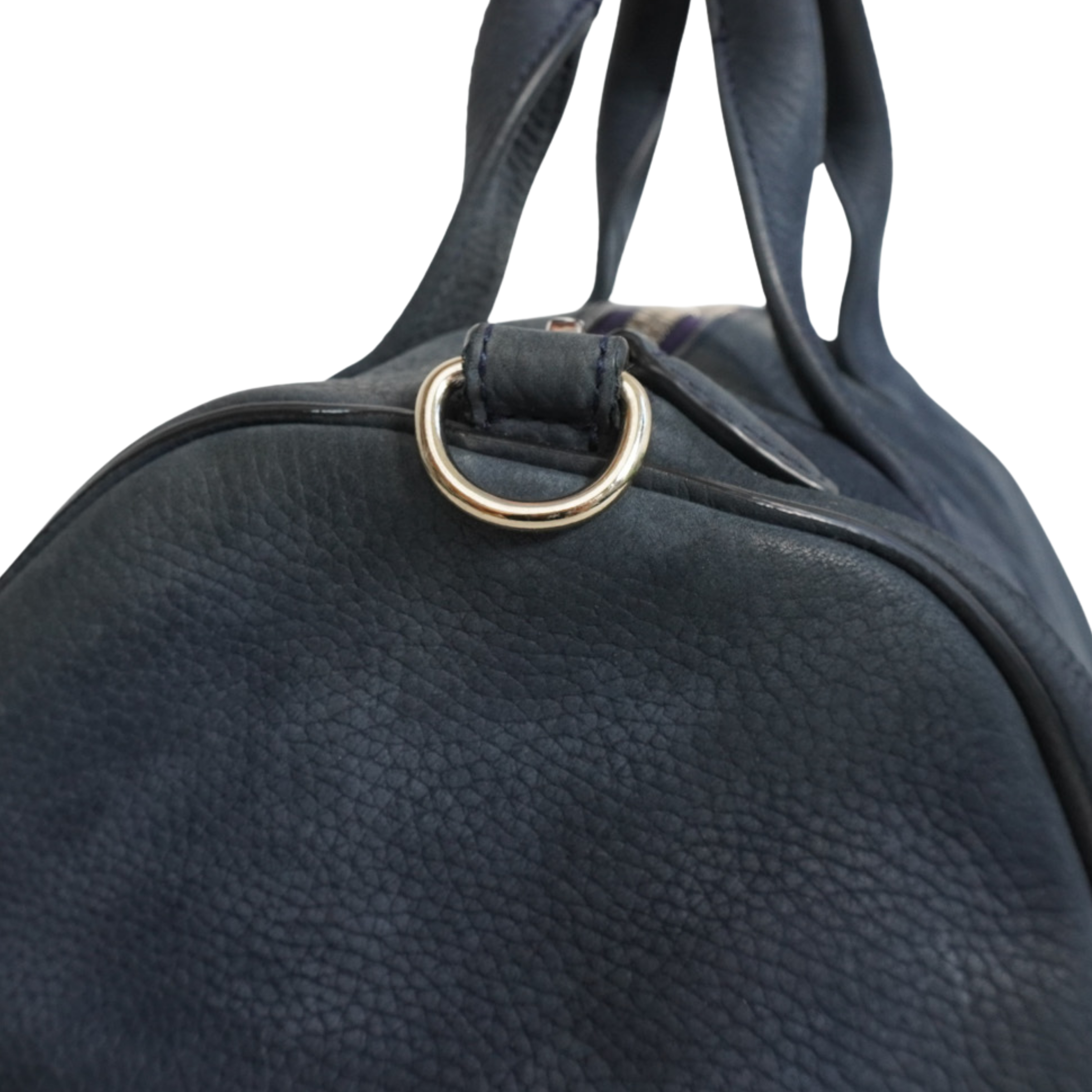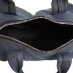 Alexander Wang 'Rocco' bag in dark navy nubuck leather with signature studded base and soft gold hardware. Features top handles and a removable shoulder strap, a main zip pocket, and hidden zip pocket on one side.