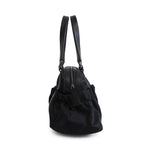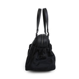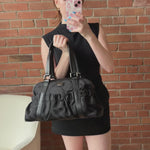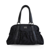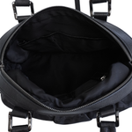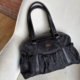 Burberry 'Black Johnstone' bowling bag in a black and grey tonal novacheck nylon with leather flat handles and zipper closure. Features gunmetal plaque and ruched exterior 360 pockets. Interior features two pouch pockets and one slip zipper pocket.