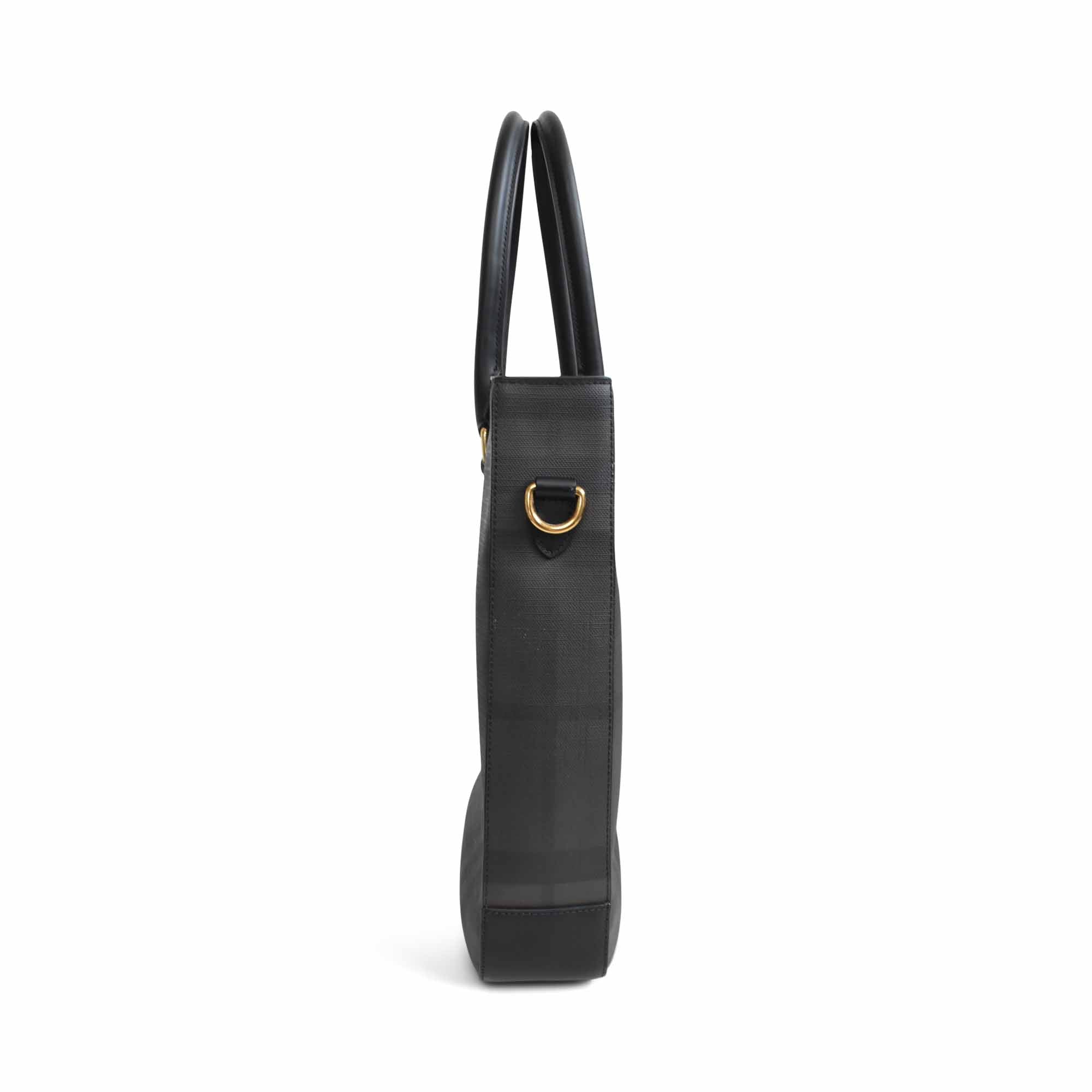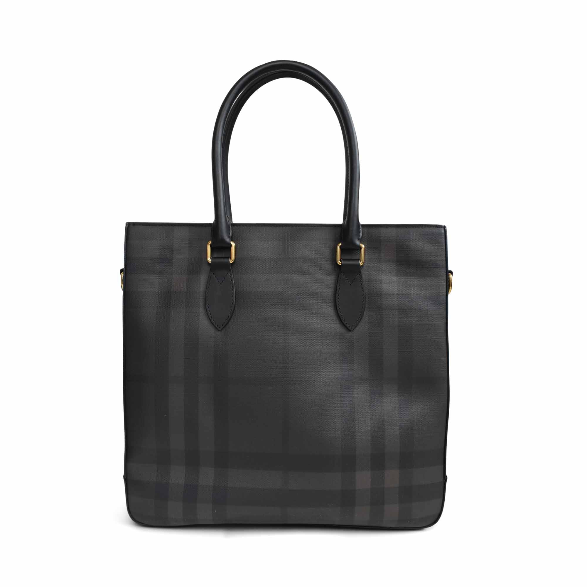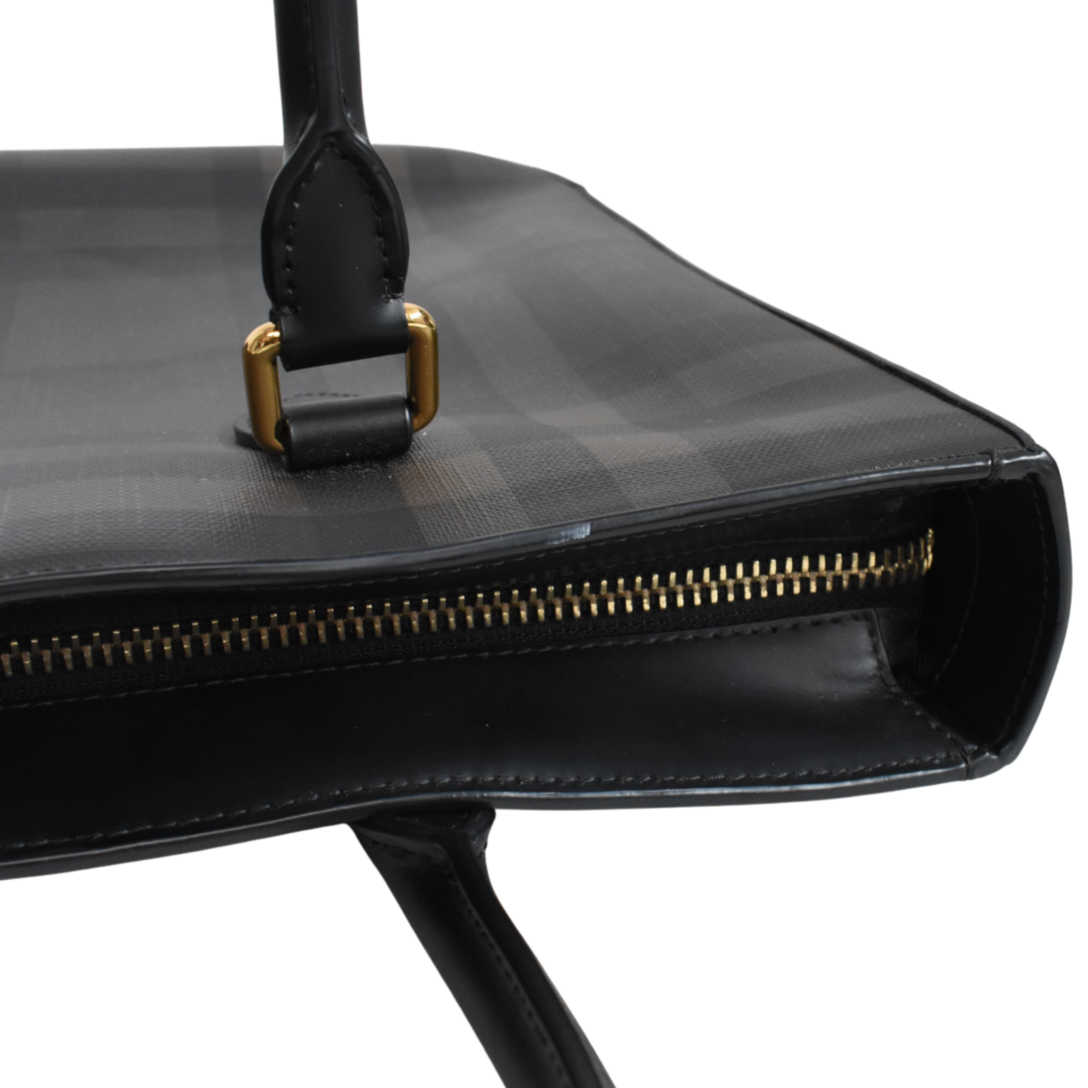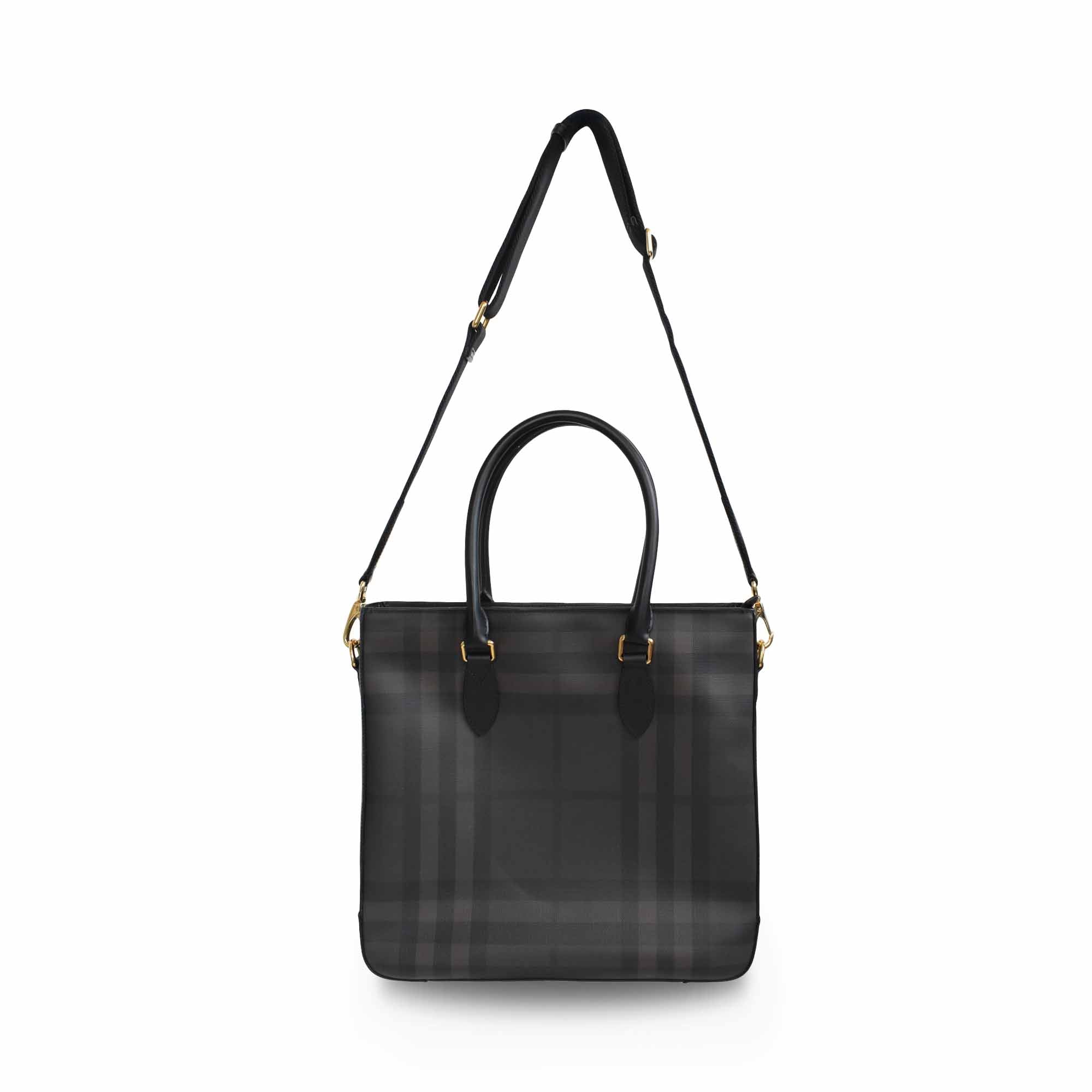 Burberry tote bag in dark brown and black novacheck printed coated canvas with black leather trim, dual rolled top handles, and a removable canvas crossbody strap with gold buckle hardware. The bag has a top-zip opening in gold hardware revealing a black canvas interior with zip and slip pockets.