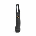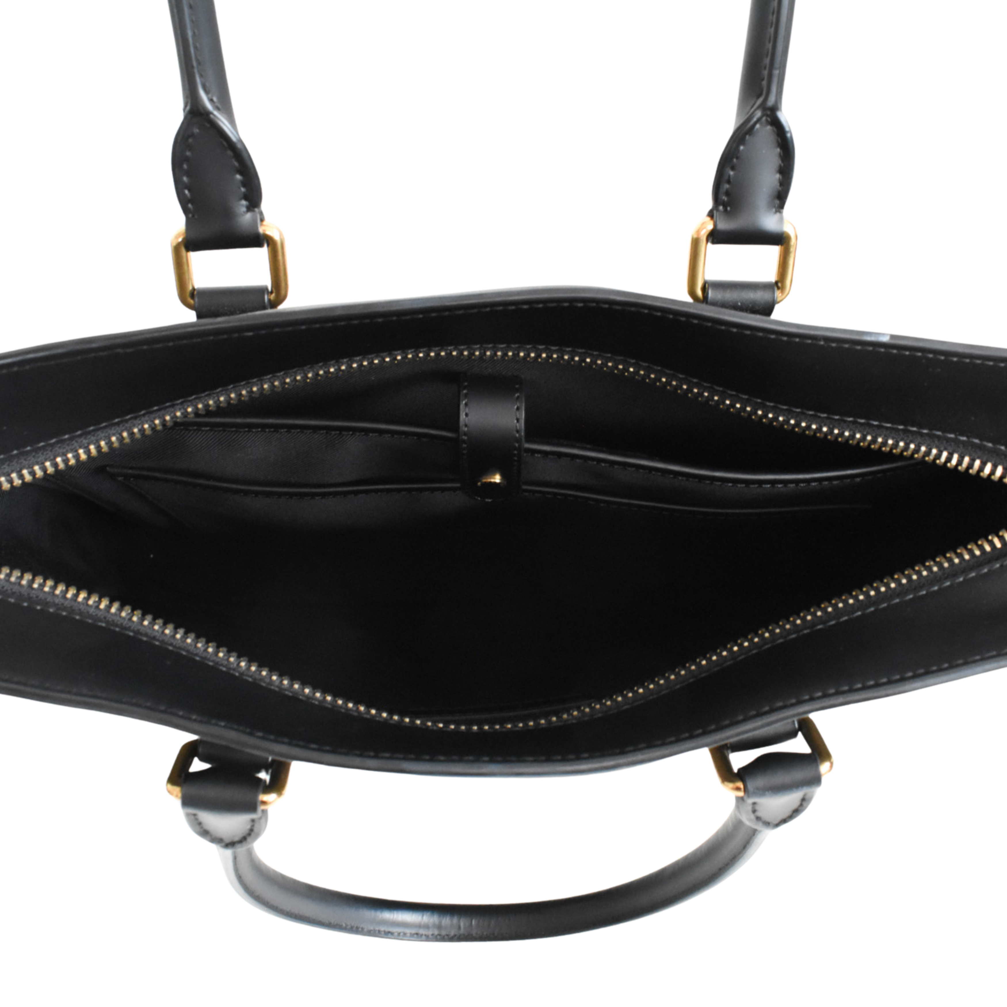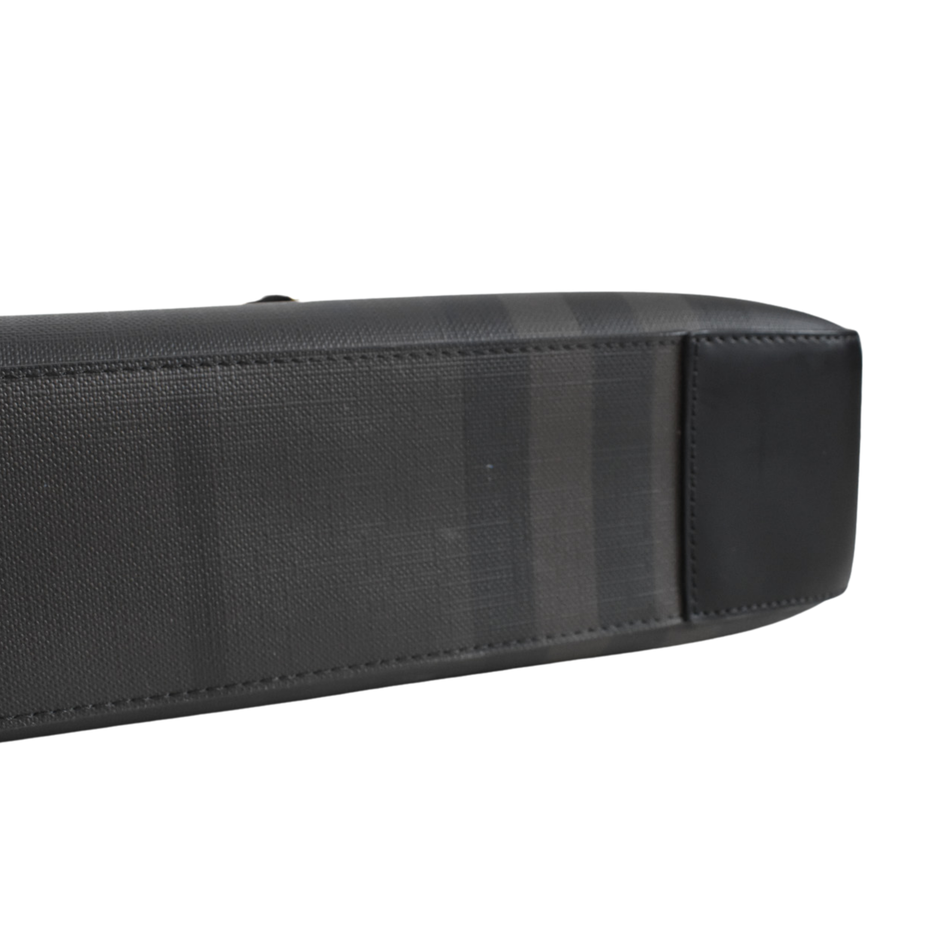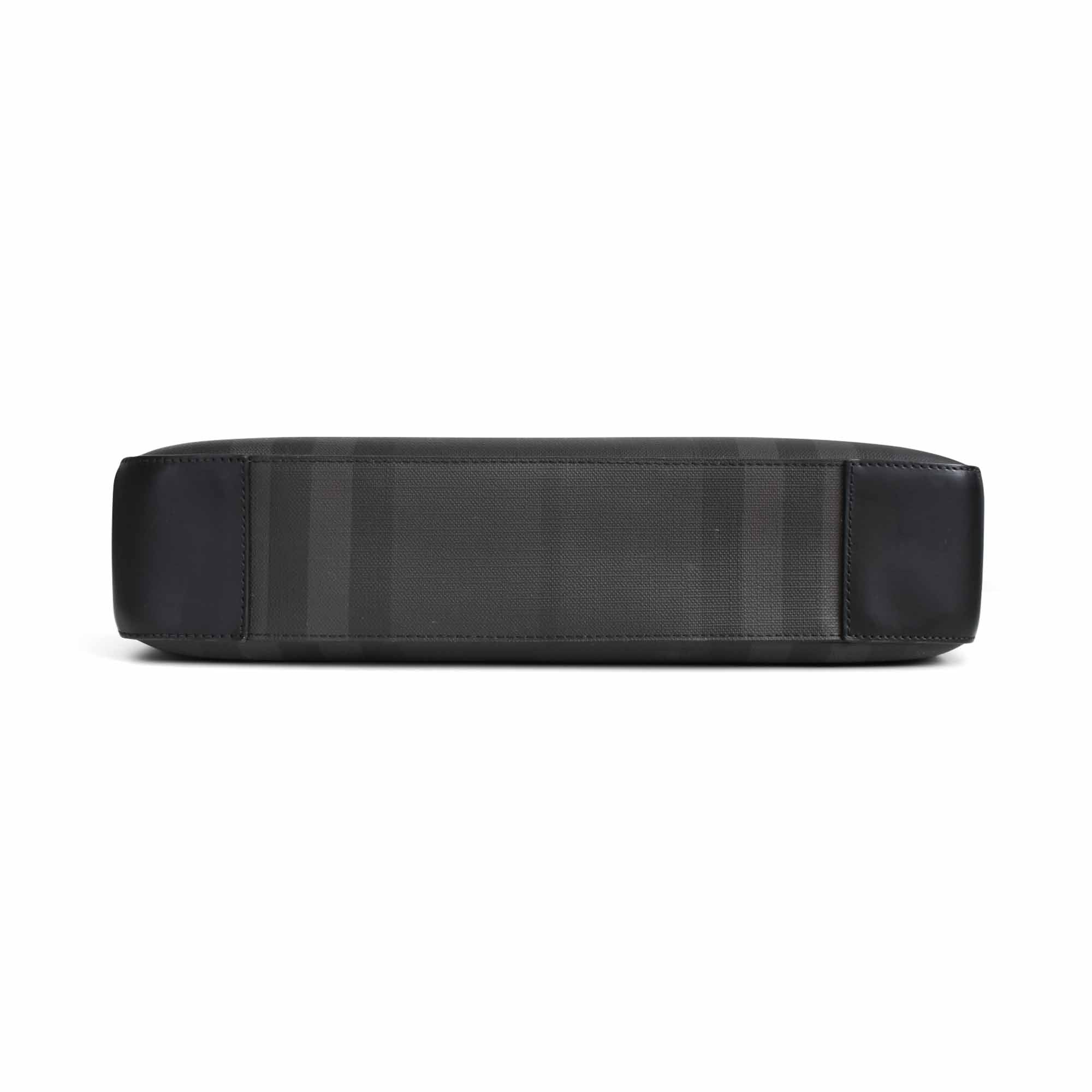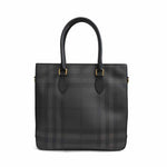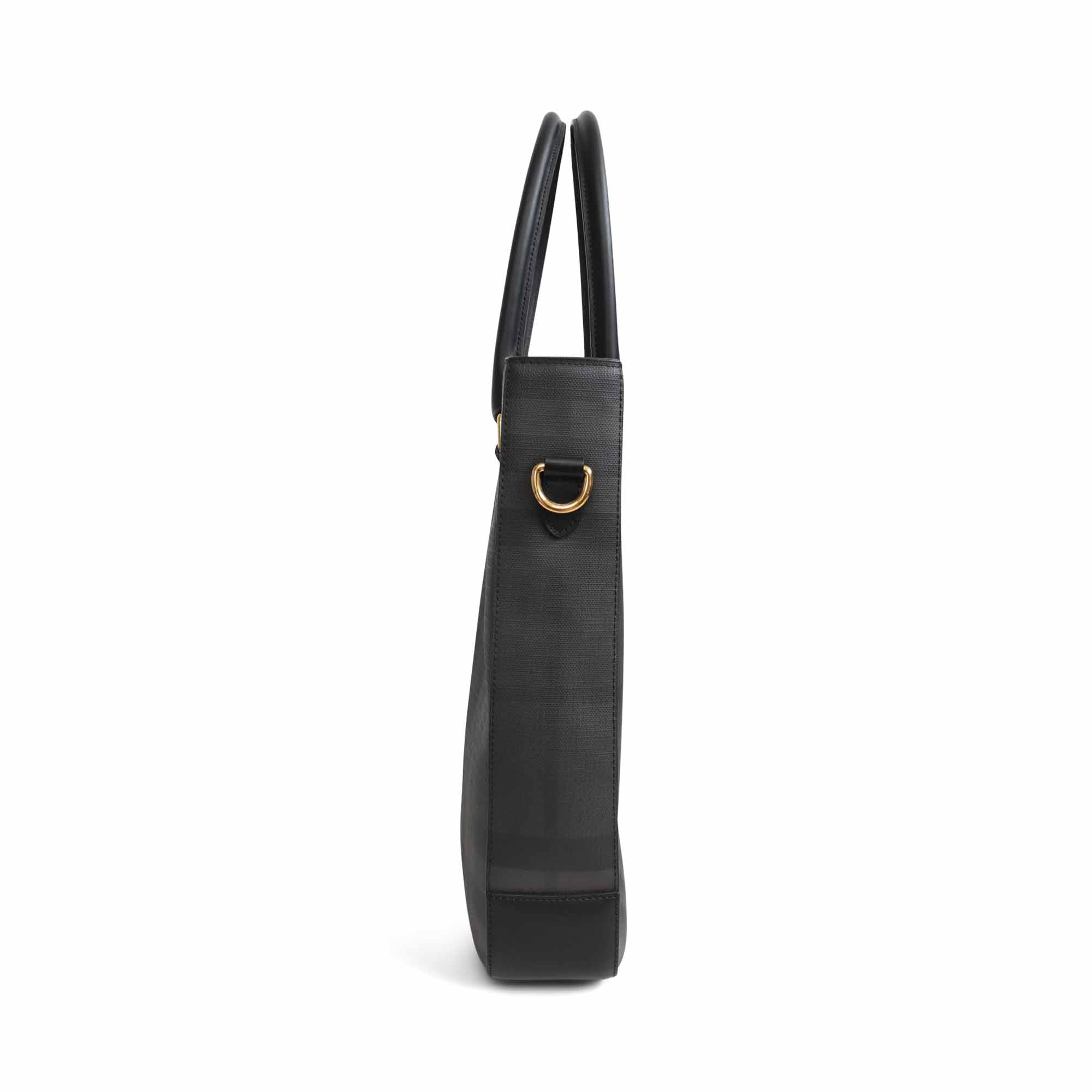 Burberry tote bag in dark brown and black novacheck printed coated canvas with black leather trim, dual rolled top handles, and a removable canvas crossbody strap with gold buckle hardware. The bag has a top-zip opening in gold hardware revealing a black canvas interior with zip and slip pockets.