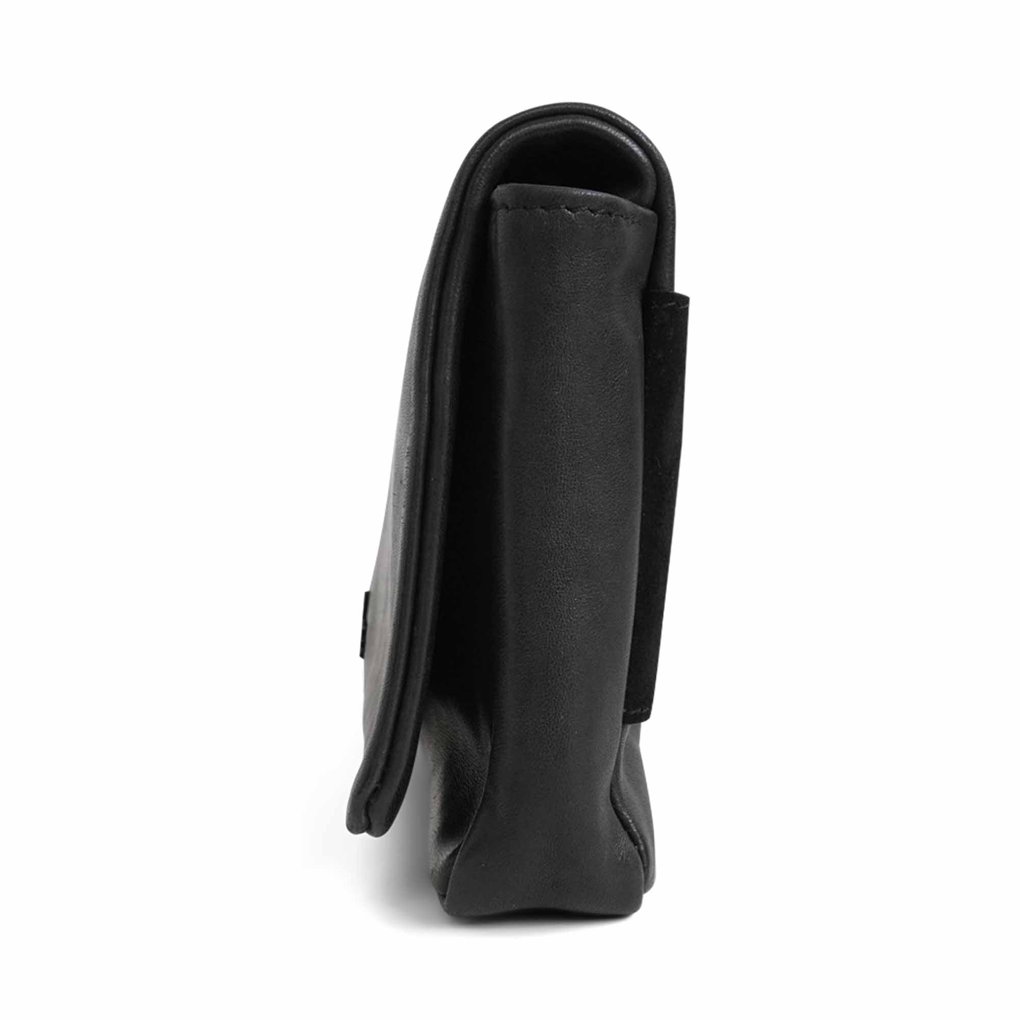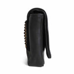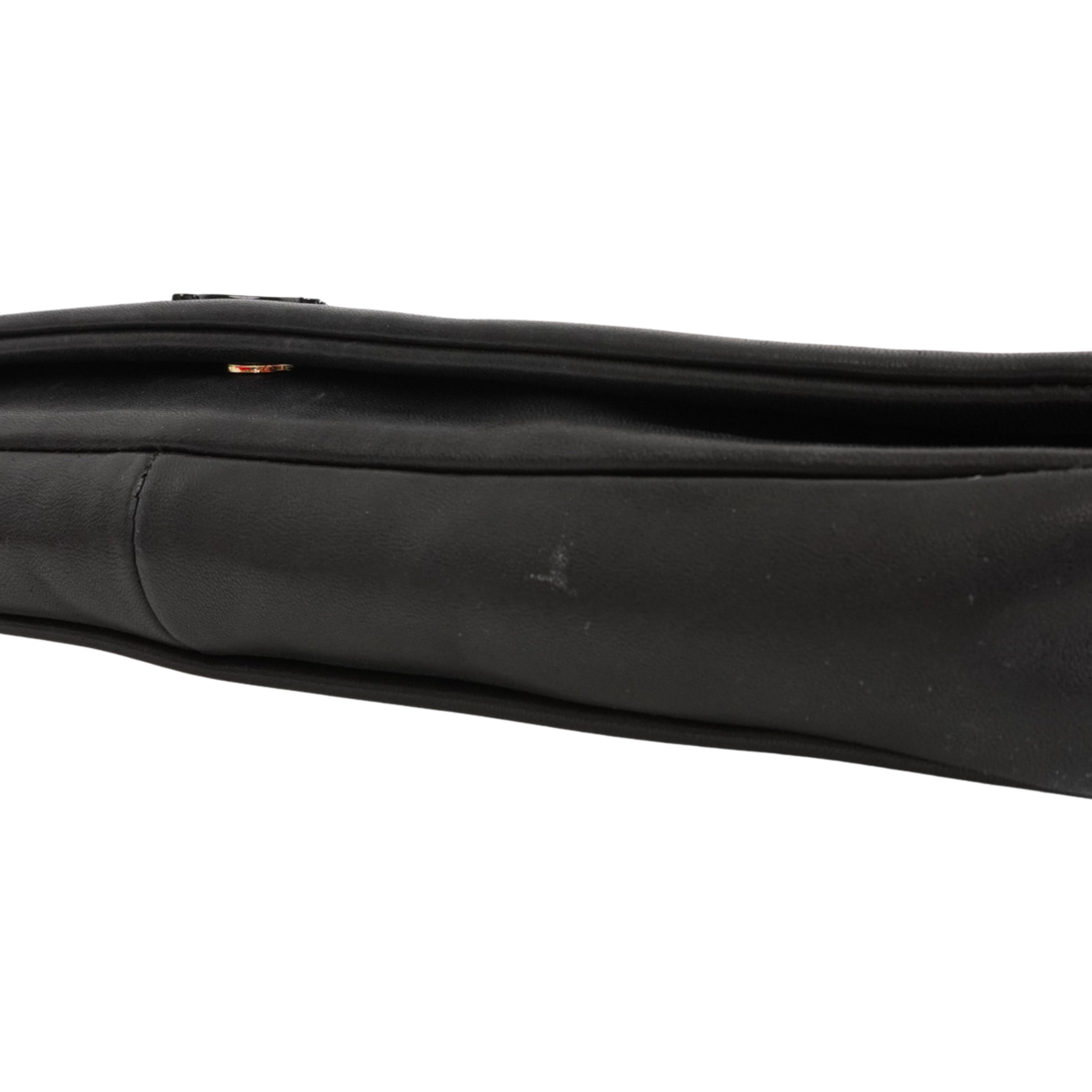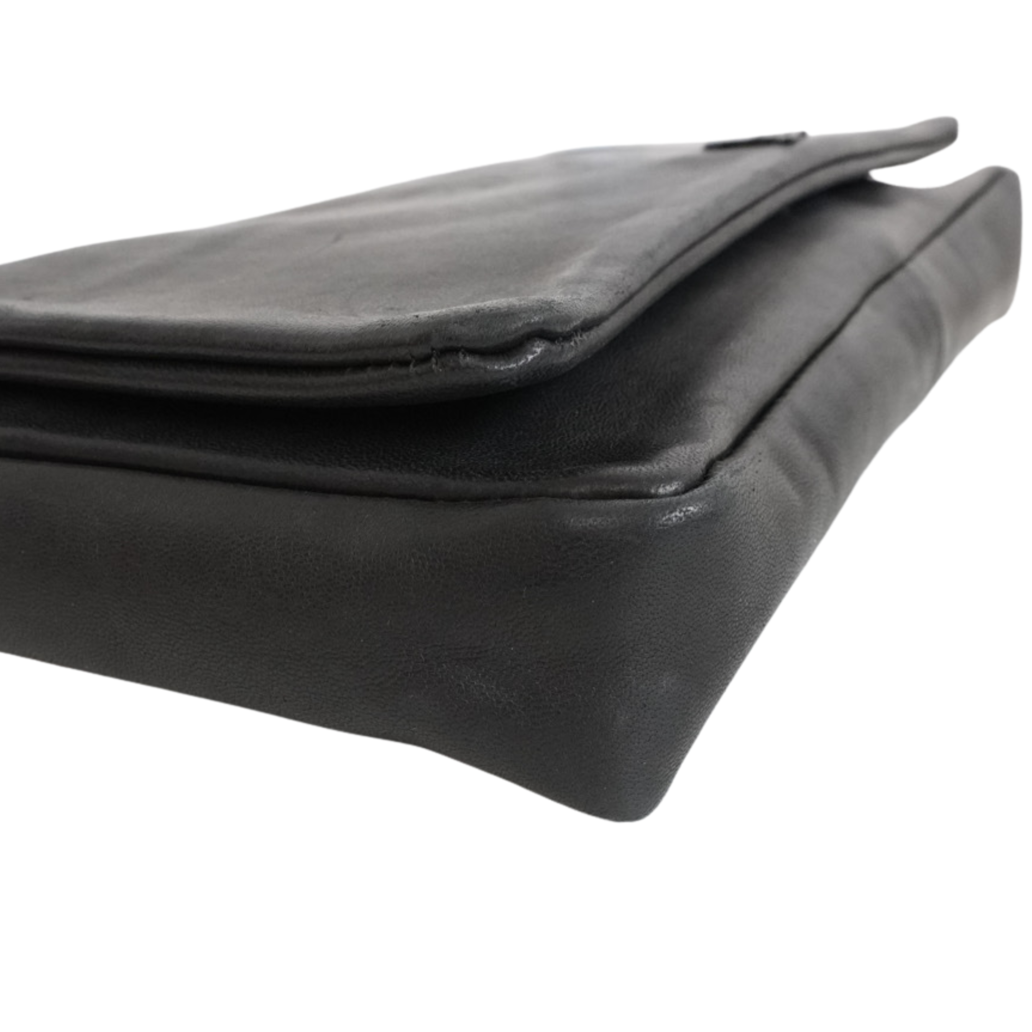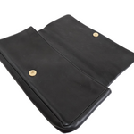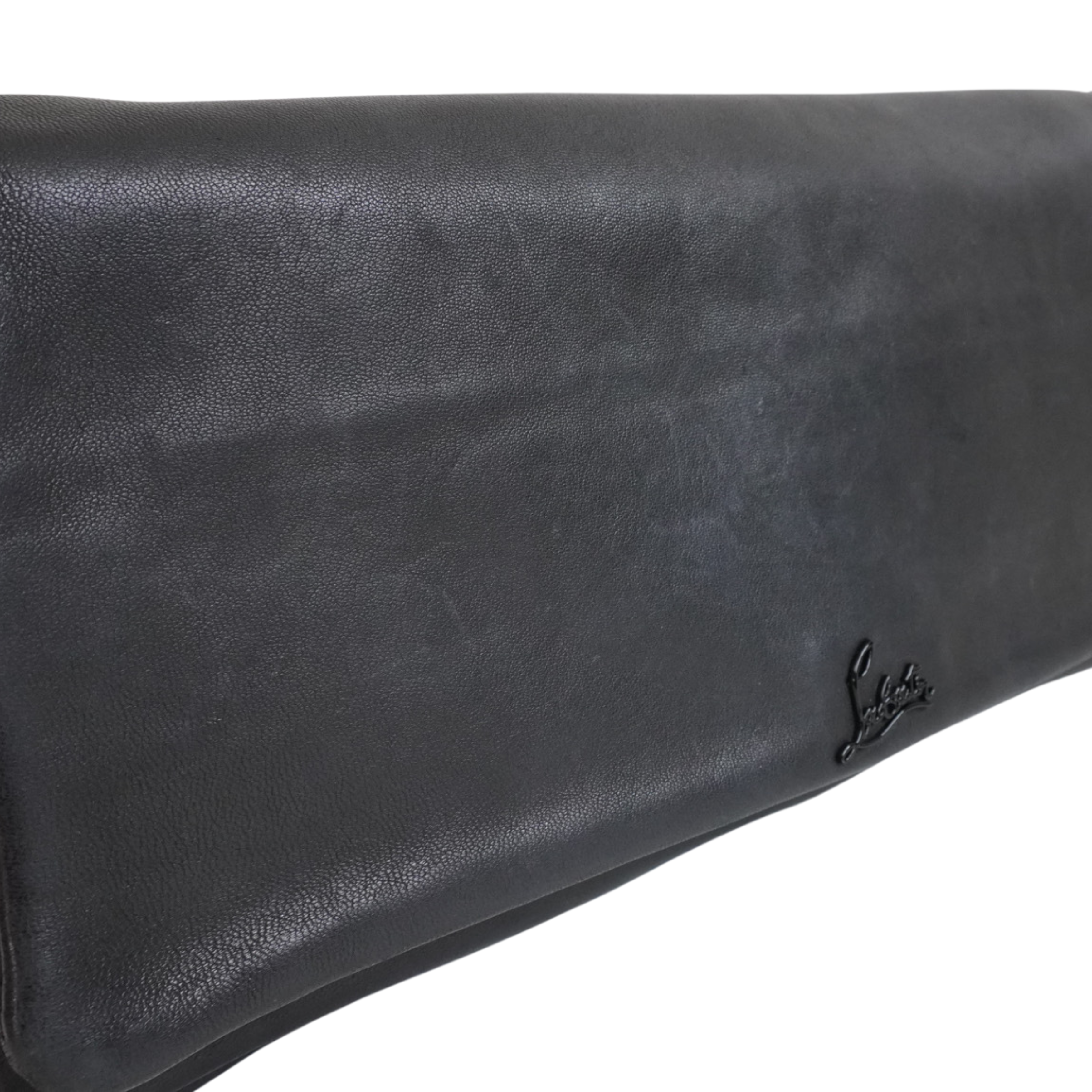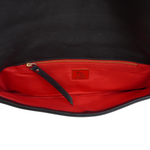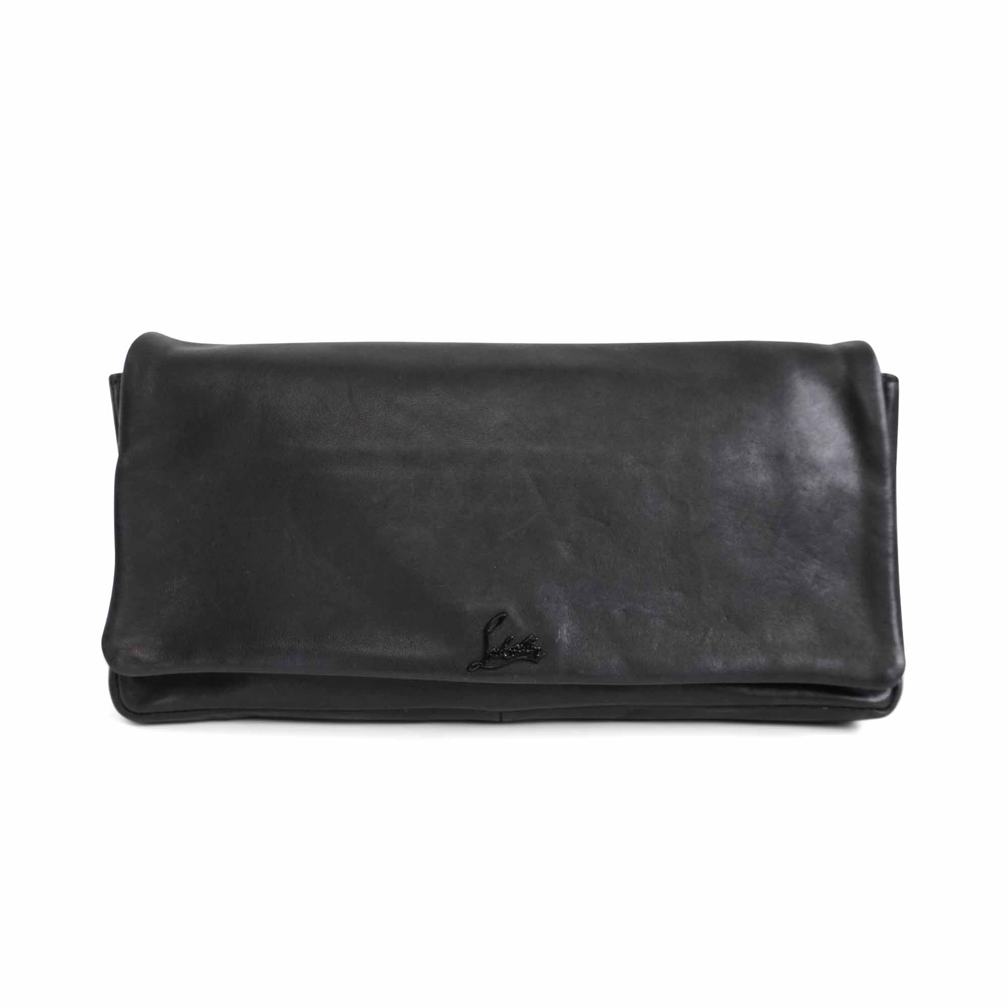 Christian Louboutin front flap clutch in black leather with a gold and black suede handle strap on the back. Featuring a black metal logo on the front with a gold snap button closure opening to a red canvas lining with a zip pocket.