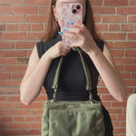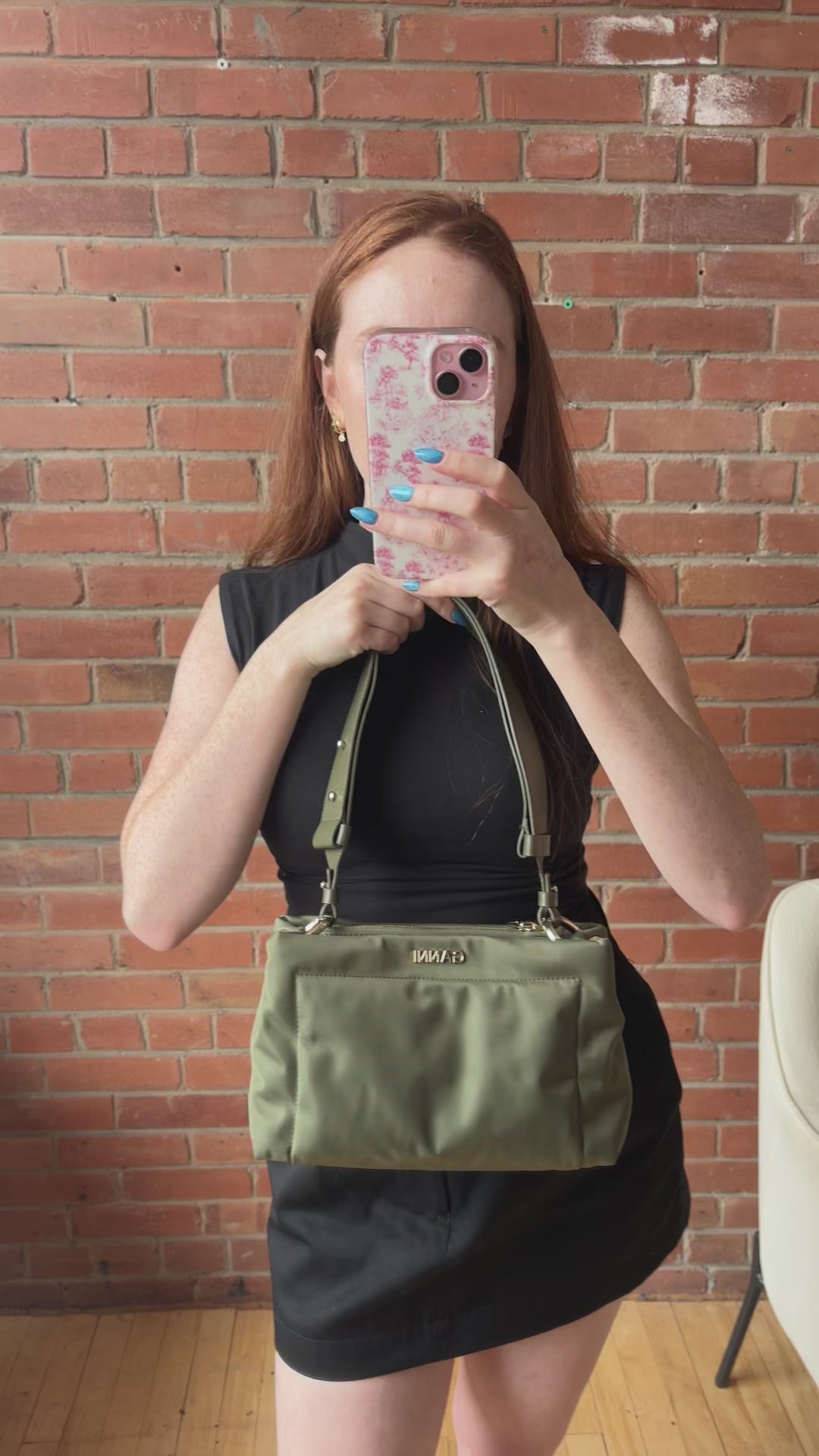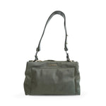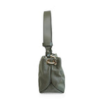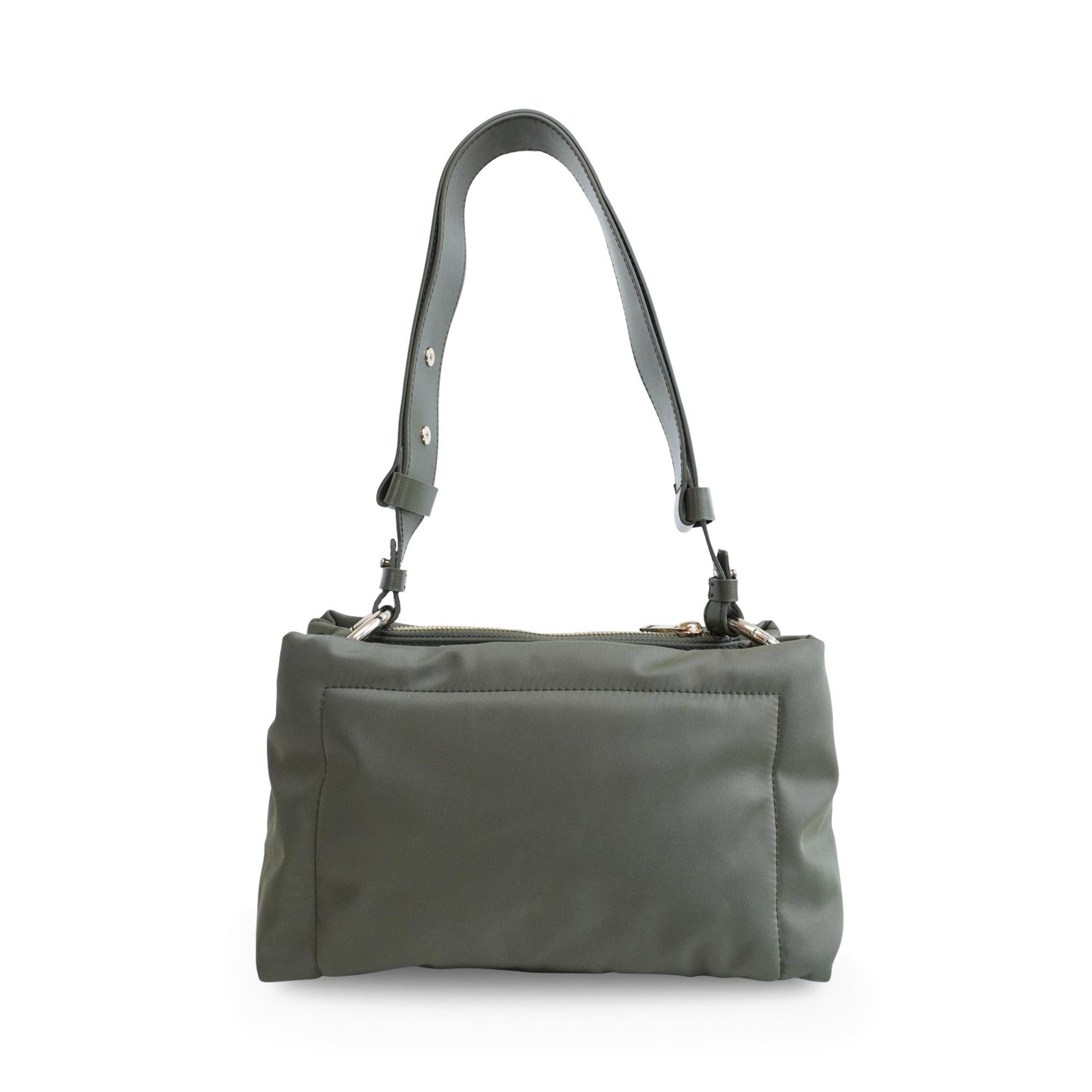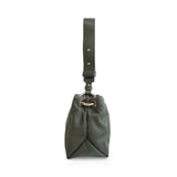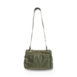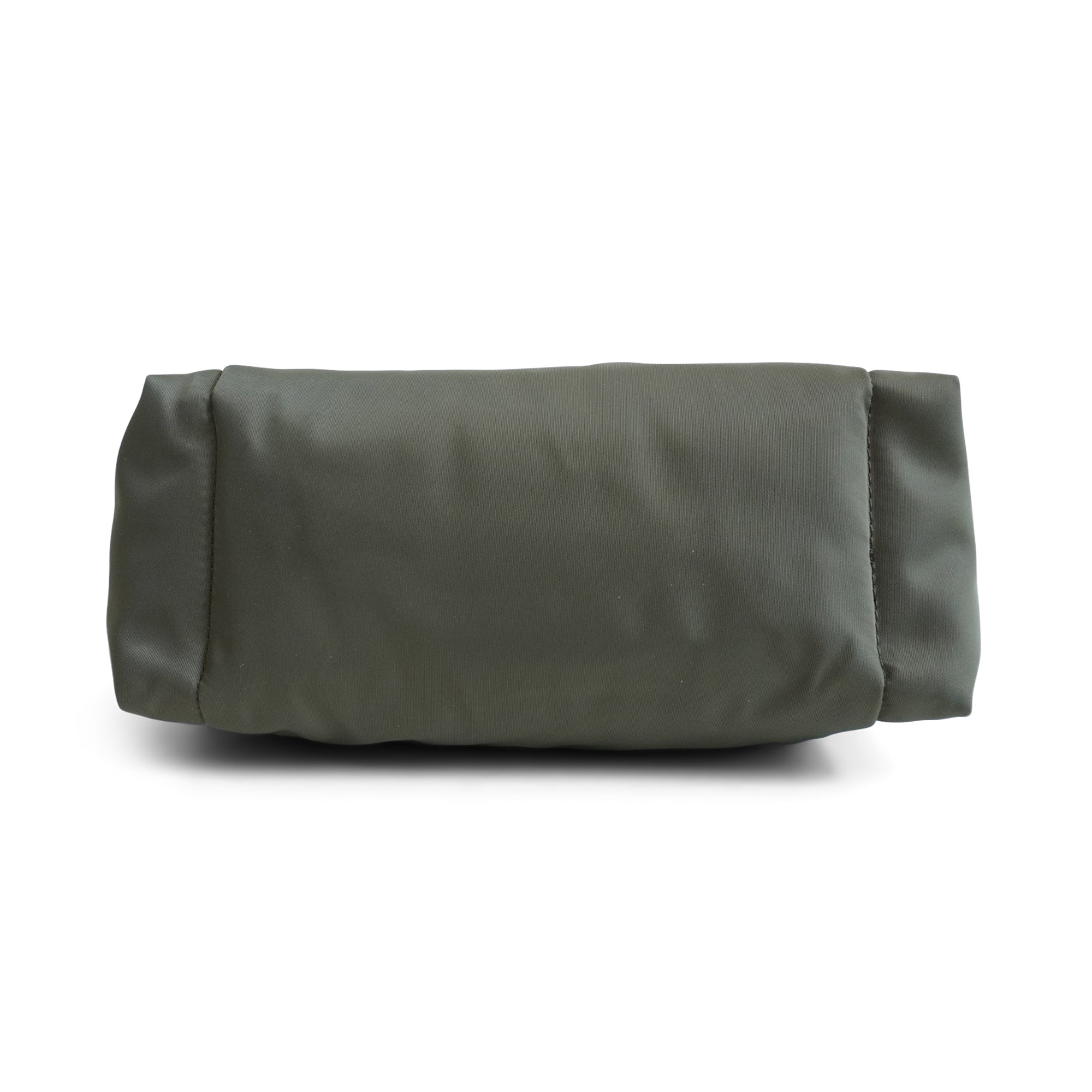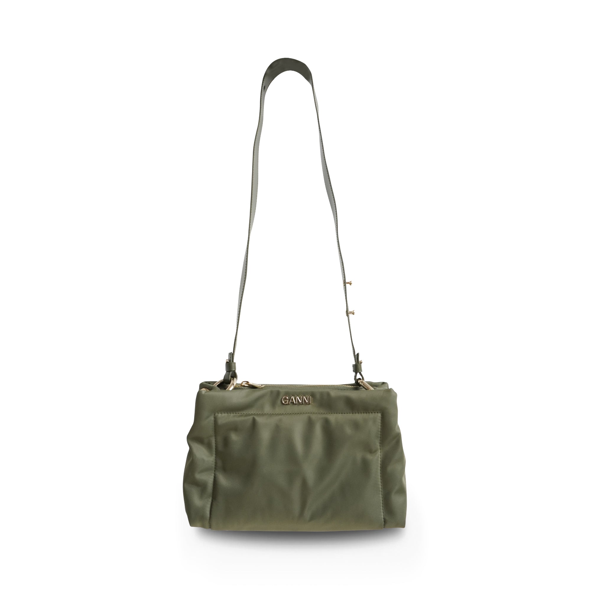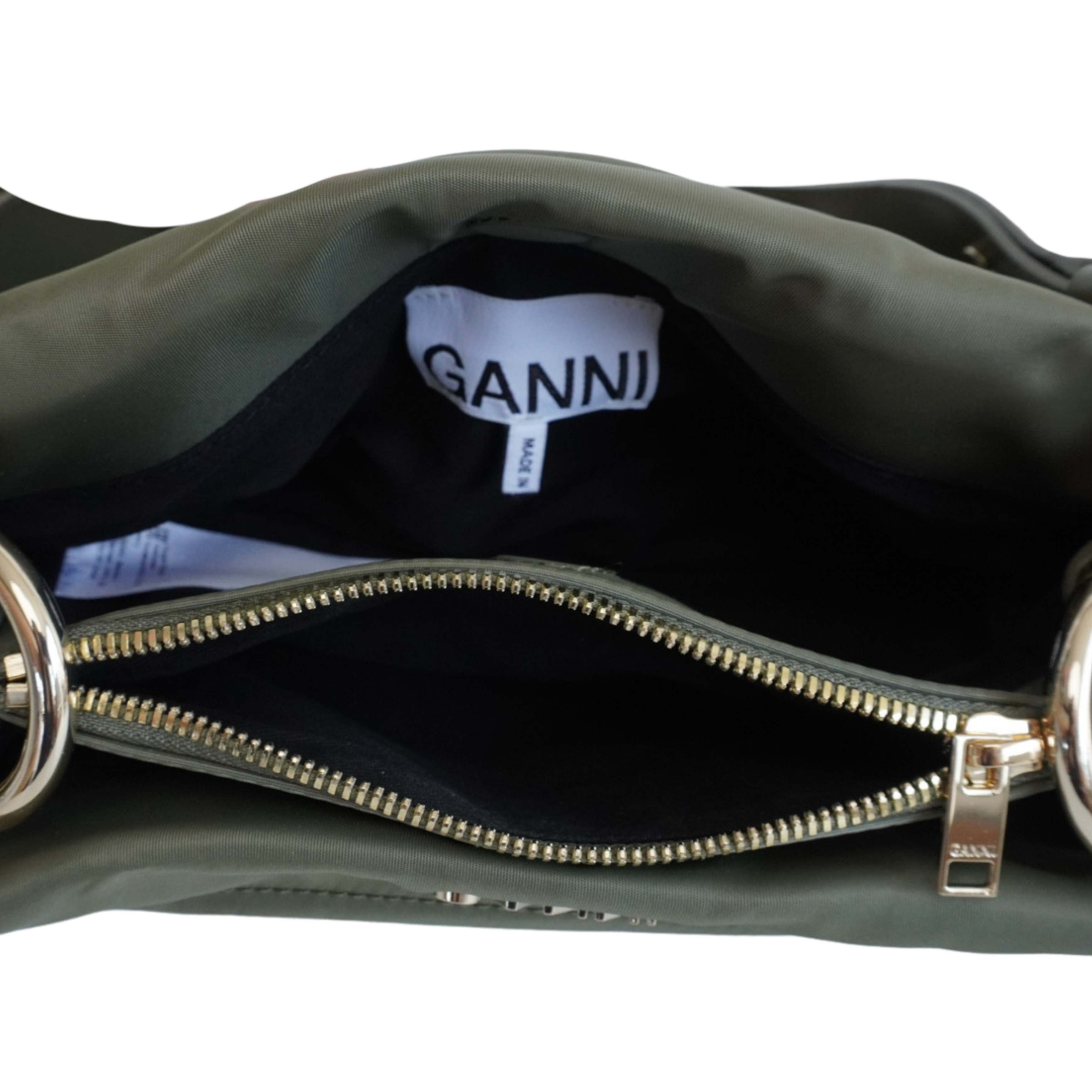 Ganni 'Pillow Baguette' shoulder bag in army green nylon with a soft gold logo ohn the front and a green leather adjustable shoulder strap. The interior features two open pockets with magnet closure and one center zip pocket compartment.