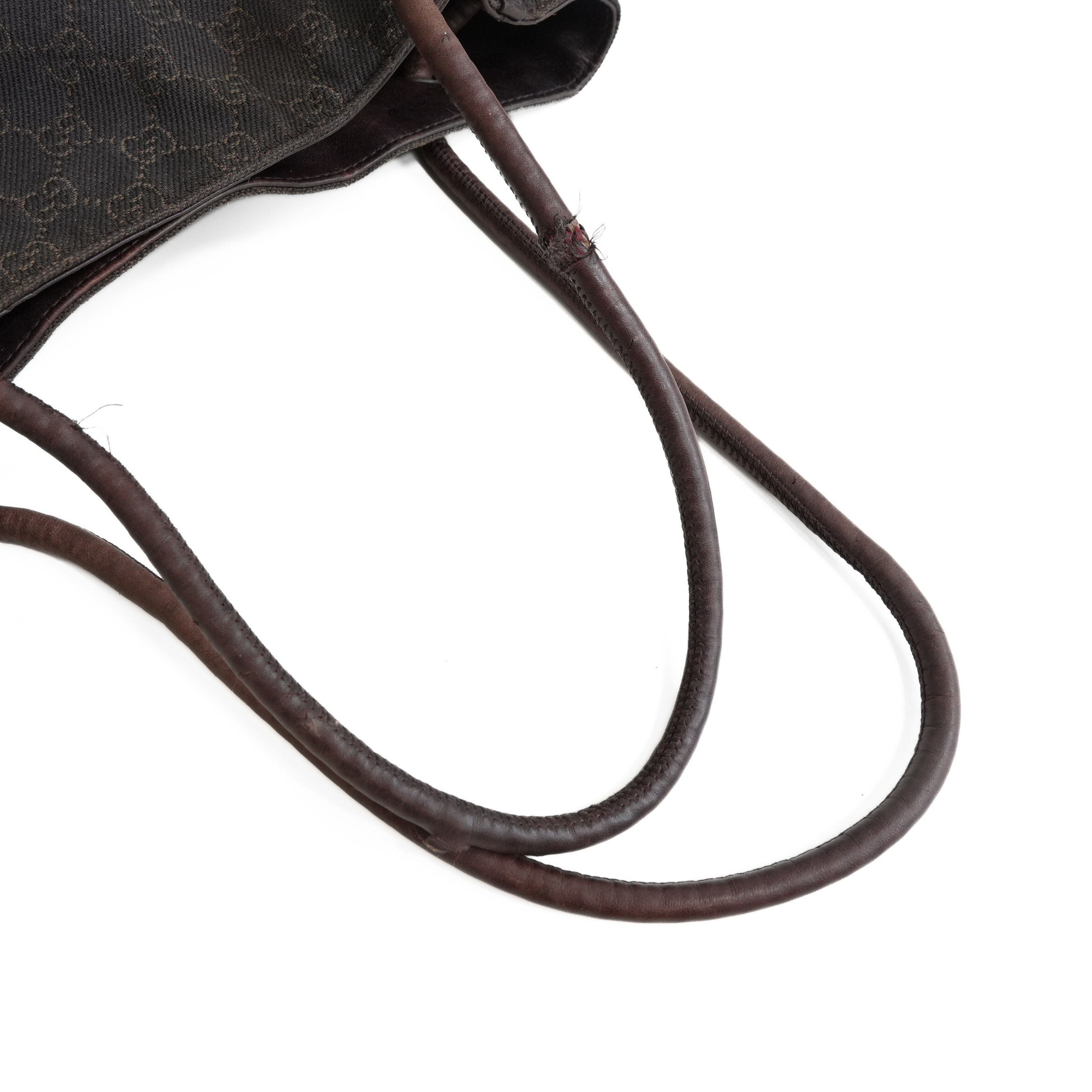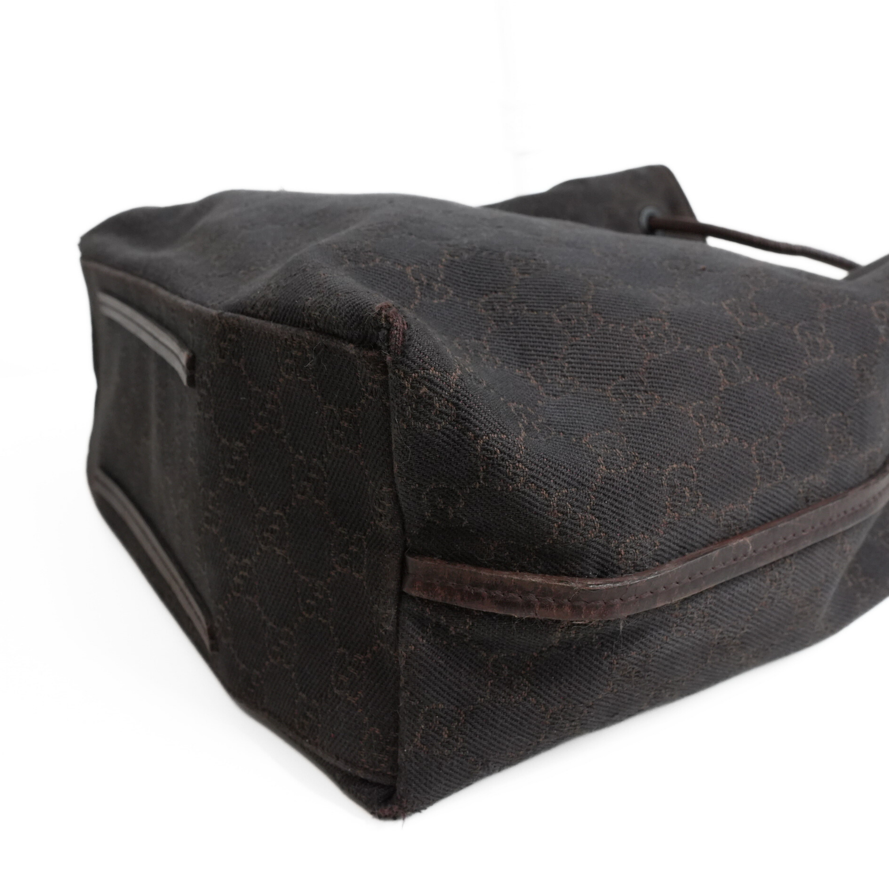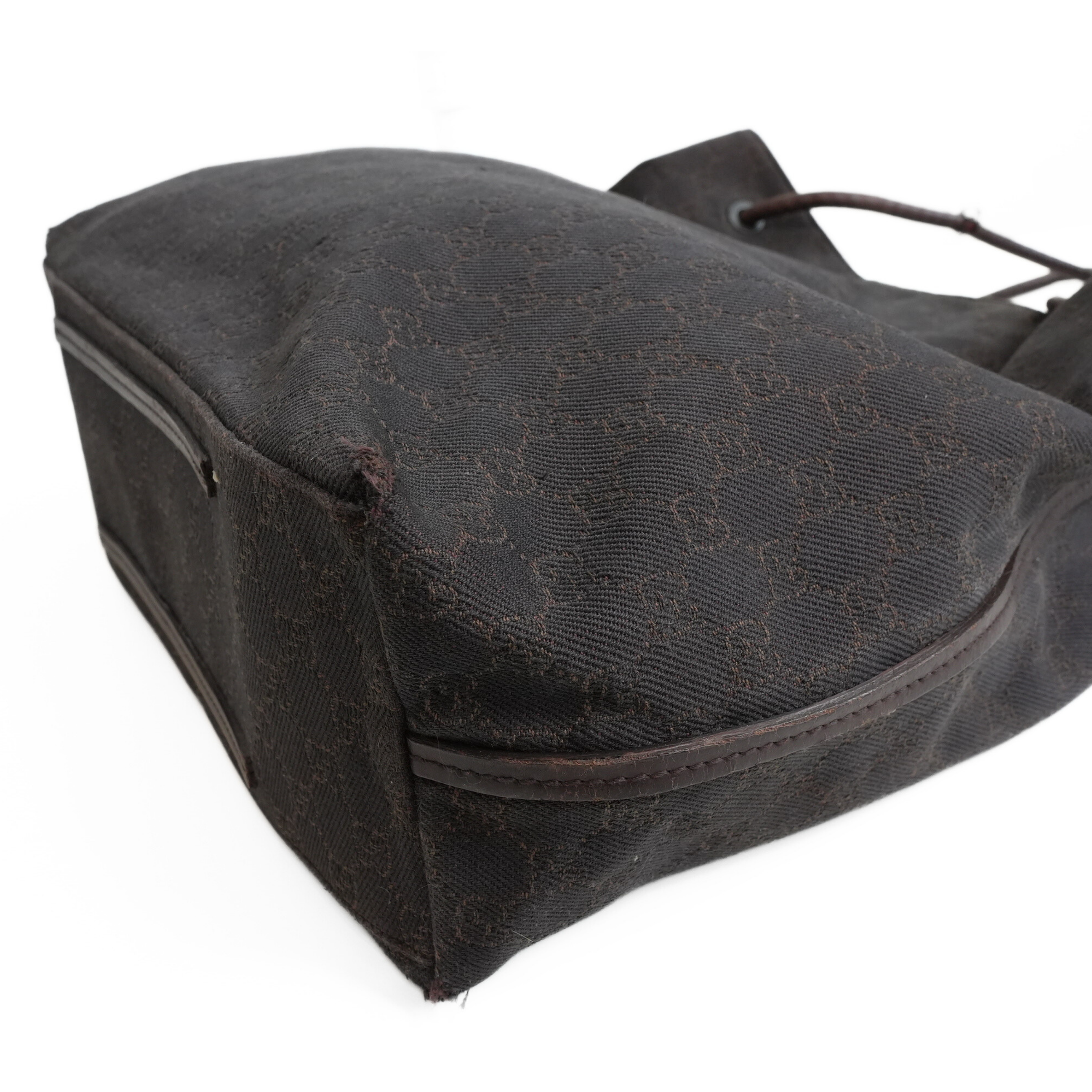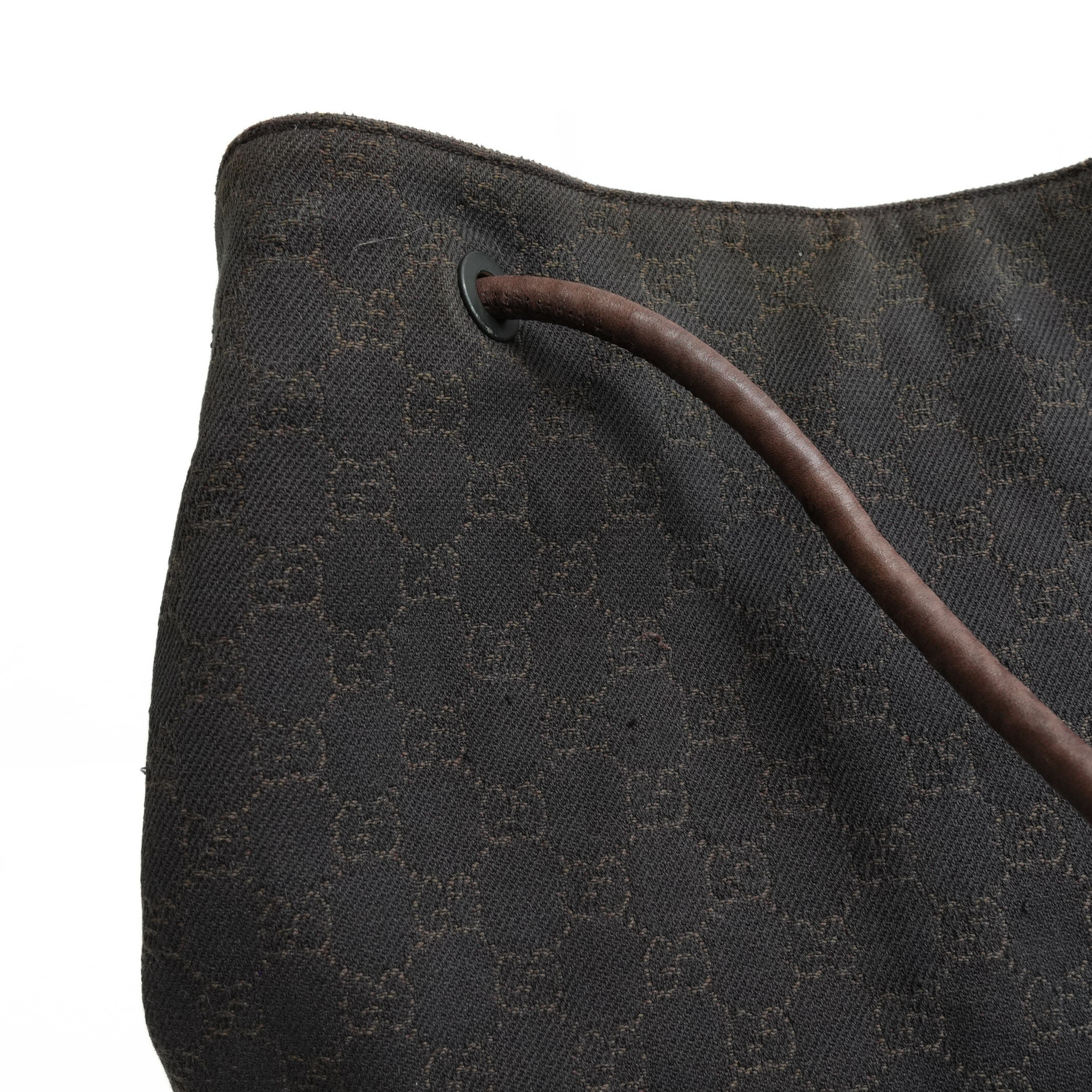 Gucci hobo tote bag in brown 'GG' monogram canvas with rolled leather handles, brown leather piping and magnetic snap closure. Interior features brown canvas lining and zip pocket.